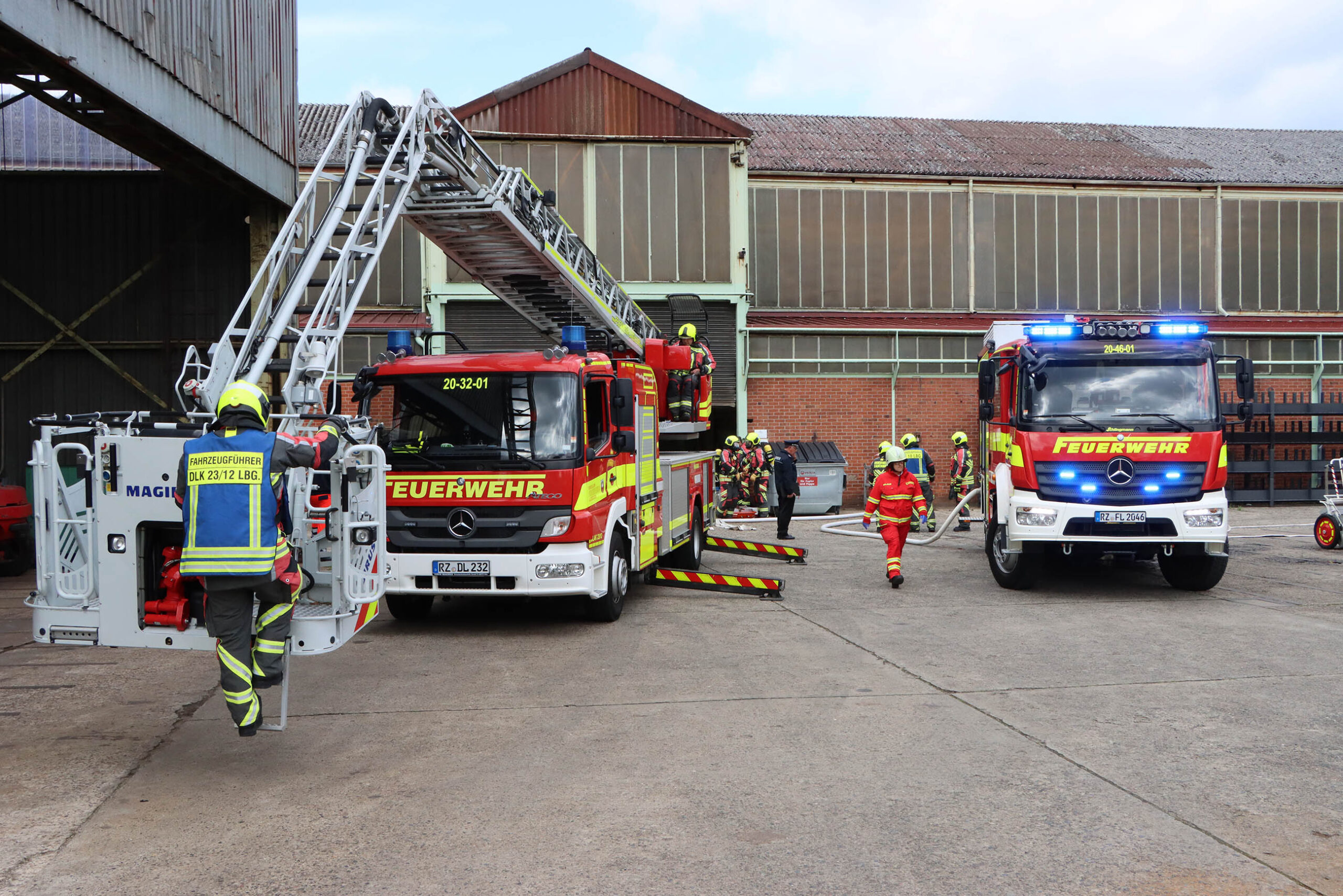 Der 1. Löschzug bereitete sich auf die große Abschlussübung vor. Die Prüfer teilten die Trupps ein und die Fahrzeugführer übernahmen ihre Mannschaft. Von der Nordwerft verlegten die Kräfte an die Südwerft. Hier war ein Feuer in einem Werkstattkomplex ausgebrochen. Eine vermisste Person musste unter Atemschutz zunächst gesucht und anschließend gerettet werden. Während der Übung spielten die Prüfer mehrere Lageveränderungen ein. Nachdem die Pumpe eines Löschfahrzeugs ausgefallen war, kam es zudem zu einem Druckverlust im Hydrantennetz. Doch auch der folgende Ausfall eine Führungskraft konnte schnell kompensiert werden und stellte keine Gefährdung für den Erfolg des Übungszieles dar.