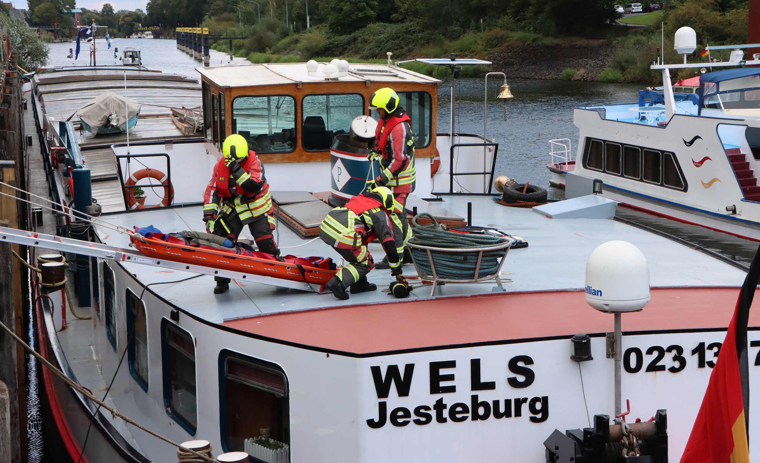 Schließlich begann die 3. Gruppe mit einer Einsatzübung. Angenommenes Szenario war ein verletzter Arbeiter auf einem Binnenschiff. Über die schiefe Ebene musste die Rettung eingeleitet werden. Während der Angriffstrupp die Person auf dem Schiff versorgte, bereiteten Wasser- und Schlauchtrupp an Land die Steckleiter samt Schleifkorbtrage vor. Über die Leiterteile wurde die Trage auf das Schiff geschoben. Schnell und sicher konnte der Übungsdummy an Land gerettet und kurz darauf an die Besatzung eines RTW der DLRG übergeben werden.