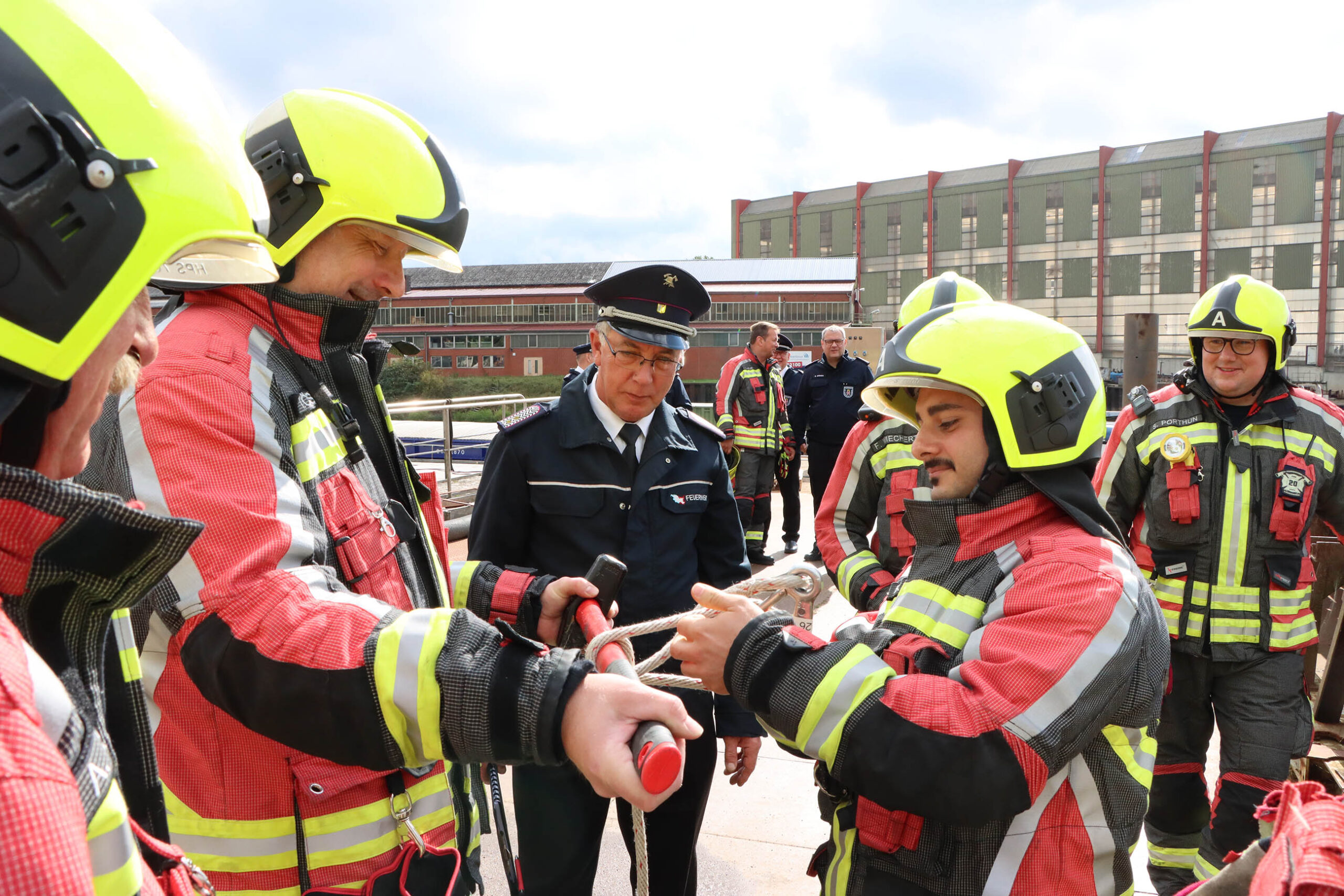 In Schutzausrüstung versammelten sich die Mitglieder wieder auf dem Hof, besetzten die Fahrzeuge und verlegten in den Hafen. Auf dem Gelände der Hitzler-Werft konnten mehrere Übungsszenarien abgearbeitet werden. Nachdem die Mitglieder ihr Wissen im Bereich der Knoten und Stiche unter Beweis gestellt hatten, ging ein Trupp auf einem Kran vor, um das Selbstretten aus der Höhe vorzuführen.