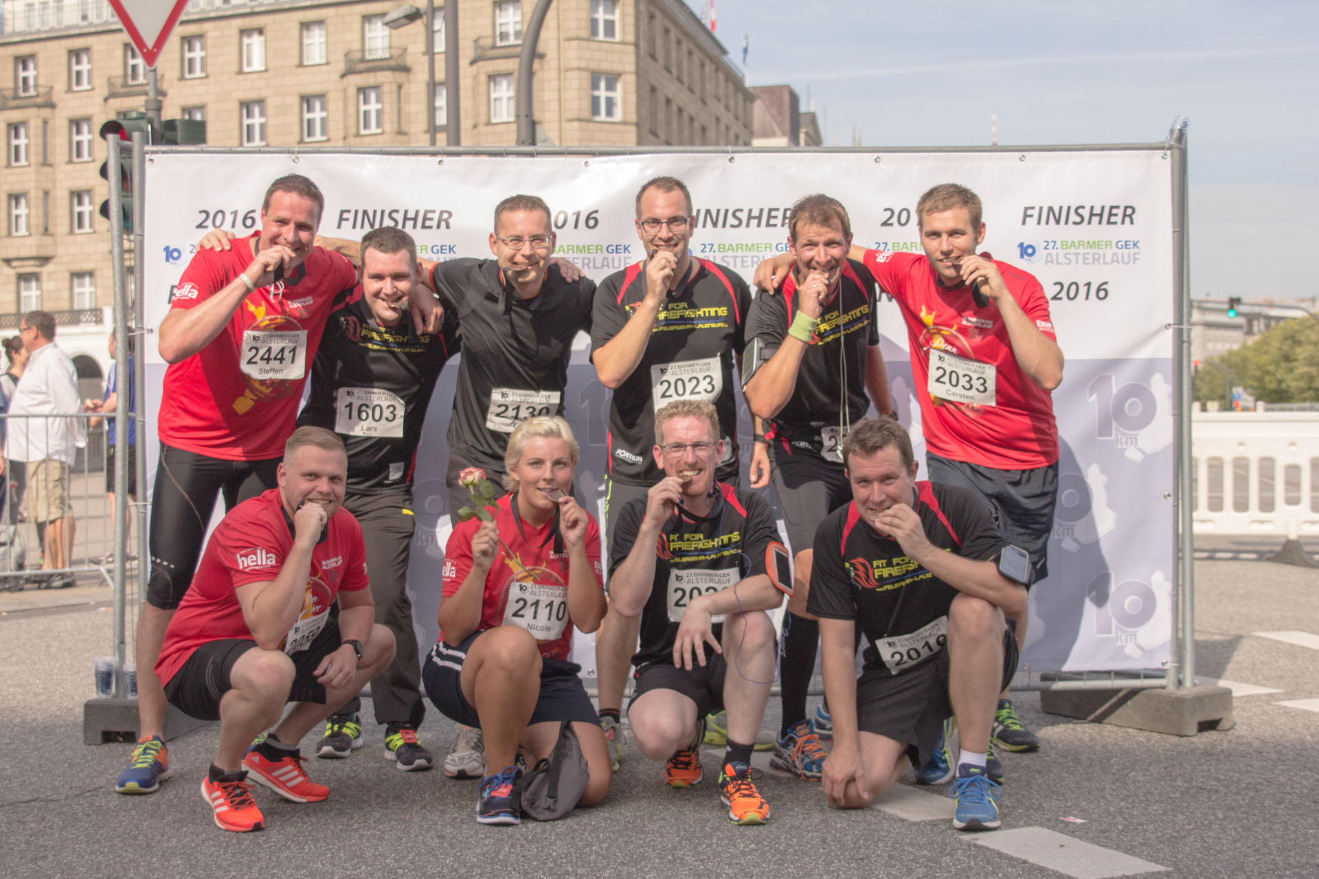 Zum zweiten Mal nahm eine Gruppe von Feuerwehrleuten aus Lauenburg am Alsterlauf in Hamburg teil. Insgesamt stellten sich über 5000 Läufer der Herausforderung. 10km rund um die Alster galt es zu bewältigen. Unterstützung im Team gab es auch von drei Mitstreitern aus der Partnerwehr Boizenburg. Schon seit Monaten bereiteten sich die Teilnehmer vor, um persönliche Zeiten zu verbessern oder einfach beim Lauf konditionell besser da zu stehen. Zum ersten mal trat das Lauenburger Team in einheitlichen Trikots an. „Fit For Firefighting“ heißt das Motto, unter welchem die fünf alles geben. Entworfen haben es Timo Naujoks und Sebastian Porthun. „Das Design spiegelt einen Läufer wieder, welcher mit unserem Schutzhelm und Atemschutzgerät ausgerüstet ist“, erklärt Timo Naujoks, der selbst am Lauf teilgenommen hat. Für die Umsetzung beziehungsweise die Produktion der Shirts konnte die Feuerwehr wieder auf die Unterstützung von Bruns Werbung zählen. Die Shirts fielen auf, neben dem „Fit for Fire“ Schriftzug zeichnete das Shirt auch ein Slogan mit „112% Ehrensache“. Am Start stellten sich alle Teilnehmer dann schließlich in ihren Zielgruppen auf. In diesem Jahr fanden auch die Deutschen Meisterschaften statt, Zielzeiten wie 30 Minuten waren an der Startlinie zu finden. „Um dem Gedränge nach dem Start zu entkommen, sollte man sich schon richtig aufstellen“ erklärt Torben Heuer der bereits langjährige Erfahrungen beim Alsterlauf hat. Um Punkt 10 Uhr ging es dann los, die Massen setzen sich in Bewegung. Rund um die Außenalster verlief die Strecke, überall standen Passanten und feuerten die Sportler an. Für den ein oder anderen war es dann doch zu viel. Der ASB musste mehrmals kollabierte Läufer versorgen und abtransportieren. Doch unsere Jungs und ein Mädel schlugen sich wacker. Als erster Lauenburger kam Sebastian Majchrzak nach 53:05 Minuten ins Ziel. Kurz zuvor der Boizenburger Carsten Ruge. Mit Stolz nahmen die Teilnehmer nach dem Lauf ihre Medaillen in Empfang. Für das nächste Jahr hoffen alle auf weitere Teilnehmer aus den eigenen Reihen.