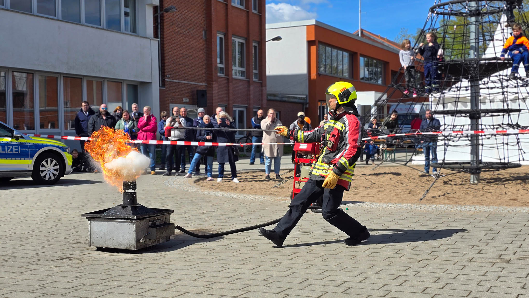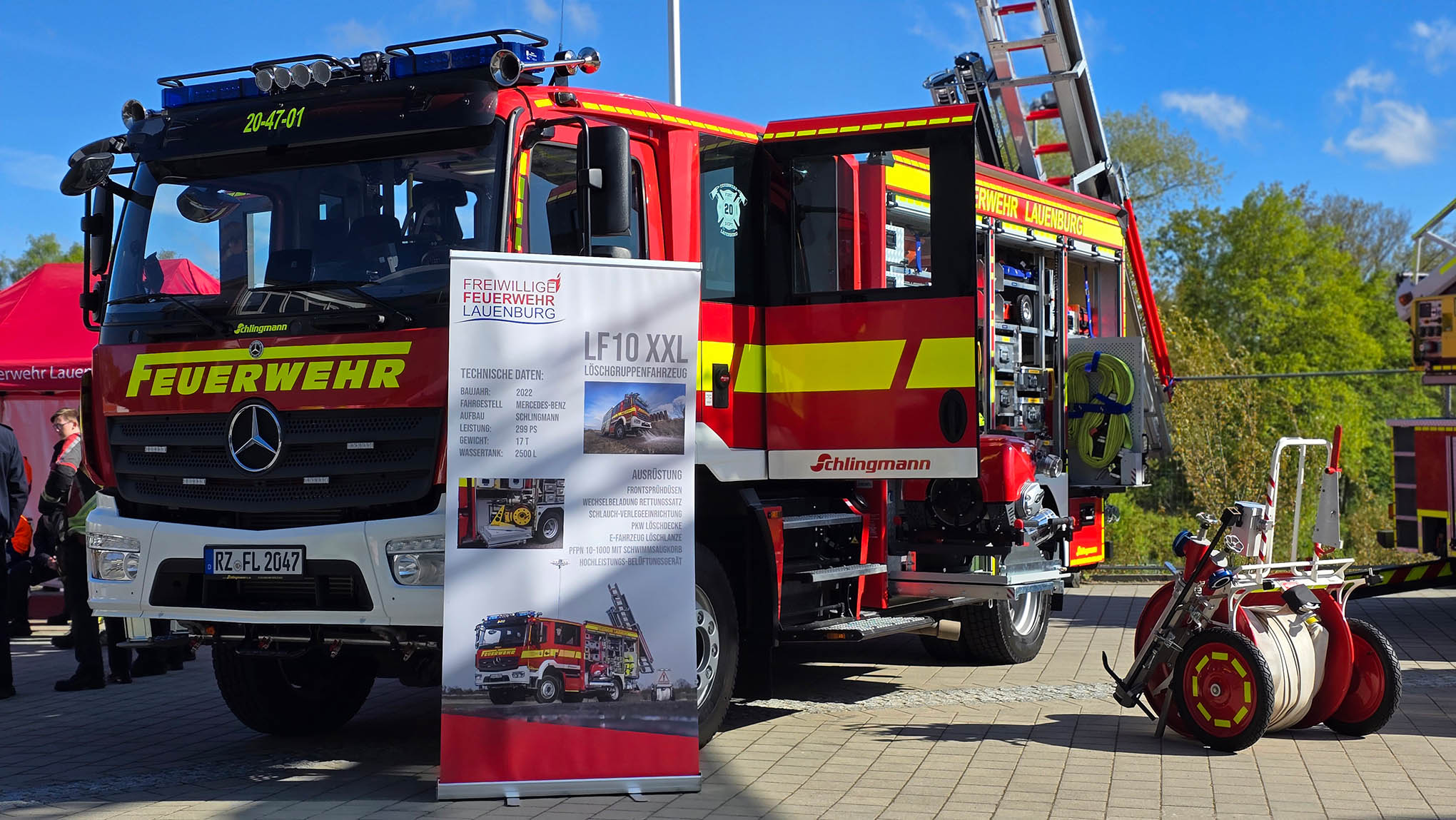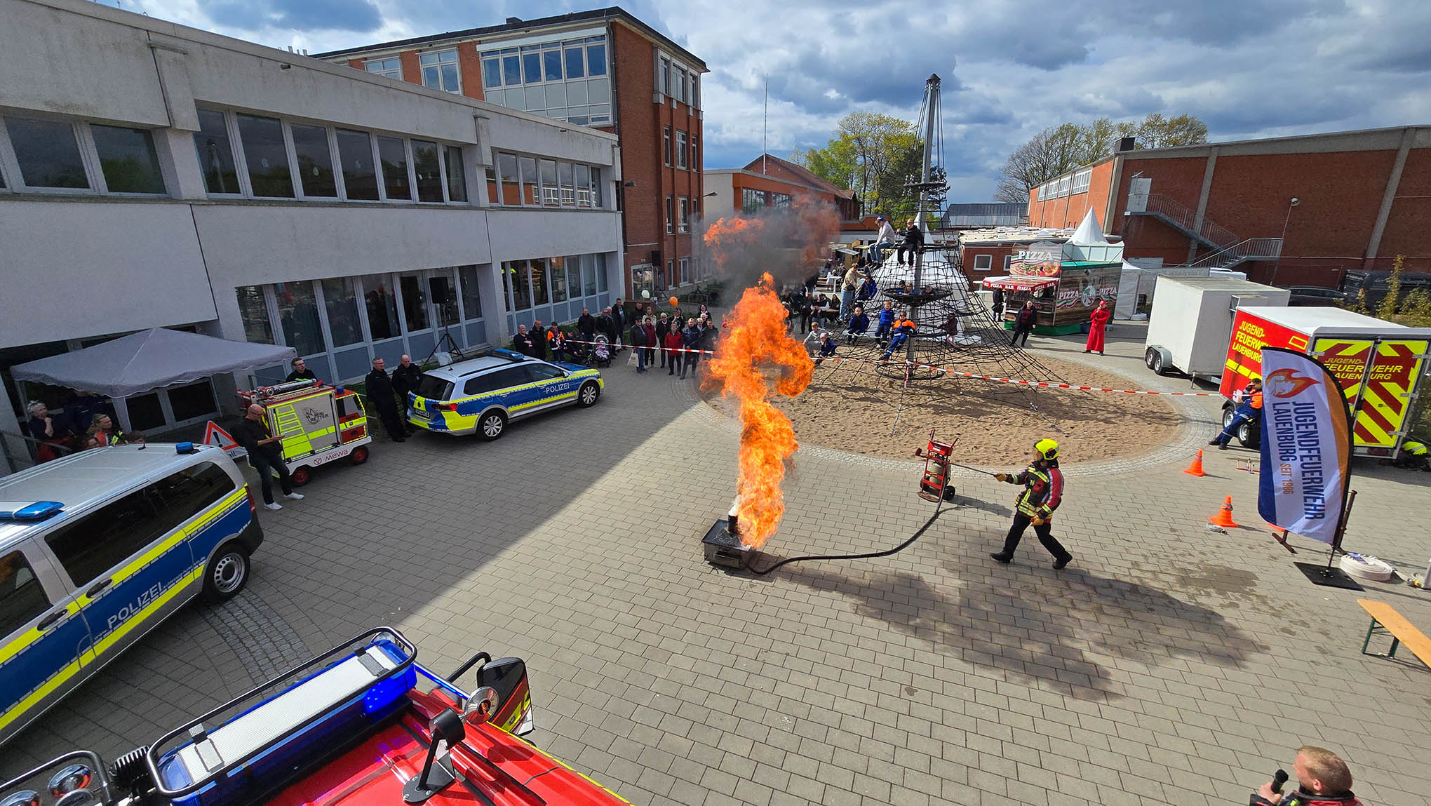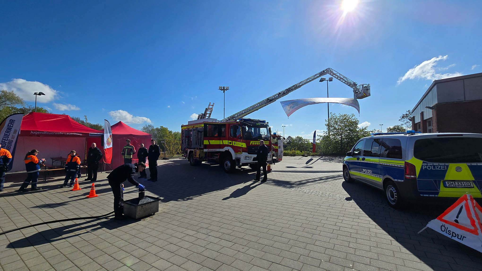 Am vergangenen Wochenende fand die Ehrenamtsmesse gemeinsam mit der Gewerbeschau am Schulzentrum am Hasenberg statt. Neben vielen Vereinen und Betrieben präsentierte sich auch die Lauenburger Feuerwehr mit allen Abteilungen. Im Innenbereich präsentierte sich der Förderverein der Feuerwehr und stellte seine wichtige Aufgabe vor. Dank des Vereins konnte draußen mit großen neuen Plakaten auf die Feuerwehr Aufmerksam gemacht werden. Mit Aufschriften wie: "Mayday Mayday Mayday - Wir brauchen dringend Verstärkung" warb die Einsatzabteilung für neue Mitglieder. Gezielt wurden erwachsene angesprochen um das Interesse an der ehrenamtlichen Arbeit in der Feuerwehr zu wecken. Dabei wurden viele gute Gespräche geführt. "Wir hoffen nun das einige der Interessenten ihr Wort halten und uns bei den kommenden Dienstabenden besuchen" sagt Wehrführer Lars Heuer. Aber auch die Jugendfeuerwehr präsentierte sich im Außenbereich. Nachdem das Regenwetter am Samstag viele Besucher fern hielt, lockten das LF 10 und die Drehleiter am Sonntag viele Gäste an. Immer wieder wurden über den Tag verschiedene Vorführungen durchgeführt. Dabei wurden mehrmals Fettexplosionen vorgeführt. Dabei wurde über Lautsprecher erklärt wie schnell es im Haushalt zu einer solchen Situation kommen kann und wie richtig reagiert werden sollte, damit es eben nicht zur Explosion kommen kann. Bis zum Abend wurden viele Gespräche geführt, Fahrzeug und Gerät erklärt. Wir blicken zurück auf ein schönes Wochenende und hoffen auf viele Neueintritte in die Wehr.