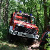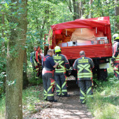 Da es ein sehr unwegsames Gelände war, wurde die benötigte Ausrüstung kurz vor der Waldeinfahrt im Glüsinger Grund auf den Unimog der Feuerwehr Lauenburg umgeladen. Dieser transportierte die Materialien soweit es ging an die Einsatzstelle. Die ca. letzten 300 Meter mussten dann zu Fuß bewältigt werden.