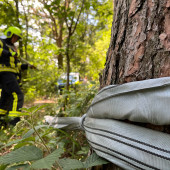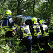 Danach konnte dann mit Hilfe eines Mehrzweckzuges der Streifenwagen wieder gerade auf den Weg gezogen werden. Um diesen danach wieder vernünftig rückwärts aus dem Waldweg fahren zu können, musste ein alter im Weg stehender Baumstumpf noch mittels der Kettensäge entfernt werden. Nach ca. 1 1/2 Stunden konnte dann der Einsatz erfolgreich beendet werden.