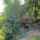 Ein umgestürzter Baum sorgte am Samstagnachmittag für einen Einsatz der Lauenburger Feuerwehr. Ganz ohne Sturm stürzte der Baum plötzlich auf die Lauenburger Hafenstraße. Glücklicherweise ist diese aufgrund von Bauarbeiten aktuell gesperrt, sodass keine Gefahr für den fließenden Verkehr bestand. Dennoch waren Fußwege blockiert, sodass KdoW, HLF und DLK zum Einsatz ausrückten. Vor Ort ragten mächtige Äste auf die Fahrbahn. Mit Motorkettensägen wurde der Baum zerteilt und schließlich von der Fahrbahn geräumt. Nach über einer Stunde war der Einsatz beendet.