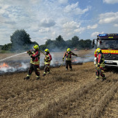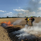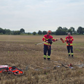 Einen Lehrgang der besonderen Art besuchten Mitglieder der Lauenburger Feuerwehr Anfang August. Vegetationsbrände sind auf Grund anhaltender Trockenheit weiter zunehmend. Lauenburg zwar mitten im grünen, jedoch bergen die großen zumeist landwirtschaftlich genutzten Flächen in den Nachbargemeinden auch ihre Gefahren. Wie schnell sich ein Flächenbrand ausbreiten kann und wie man ihn am besten beherrscht lernten die Teilnehmer zunächst in einem Online Lehrgang. In der Praxis wurde das erlernte dann mit Ausbildern von "Fire Tool Box" umgesetzt. Auf einem abgeernteten Feld wurden Quadrate abgegrenzt, um ein unkontrolliertes ausbreiten zu vermeiden. Zunächst wurden die verschiedenen Handwerkszeuge vorgestellt. Neben den in Deutschland weit verbreiteten Feuerpatschen wurden auch Utensilien aus von Vegetationsbränden stark geforderten Regionen wie Spanien oder Portugal vorgestellt.