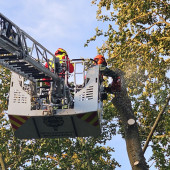 Am Sonntagabend sorgte erneut ein Baum für einen Einsatz der Lauenburger Feuerwehr. In der Nachbargemeinde Buchhorst war bereits von einer großen Buche ein Teil abgebrochen und auf den Lanzer Weg gestürzt. Der Baum war nun zum teil gespalten, ein weiterer massiver Ast drohte auf ein Wohnhaus zu stürzen. Mit der Drehleiter wurden die Kameraden unterstützt. Der etwa 30 cm starke Ast wurde von oben abgetragen um die Gefahr zu beseitigen.
