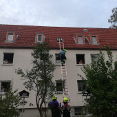 Telefonisch wurde die Lauenburger Feuerwehr am Donnerstagabend zu einer Tierrettung alarmiert. Auf dem Dach eines Mehrfamilienhauses liefen zwei Katzen herum. Offensichtlich waren sie aus einem geöffneten Veluxfenster gestiegen und entdeckten die das rutschige Dach für sich. Immer wieder rutschten die kleinen Pfoten über die Dachpfannen. Doch als die Feuerwehr mit der 4-teiligen Steckleiter anrückte war die Not doch nicht mehr so groß. Schnell flitzten die kleinen durch das geöffnete Fenster wieder in die Wohnung, noch bevor die Leiter angestellt war. Als ein Feuerwehrmann hochstieg, war die Neugier wieder so groß, das sie wieder auf das Dach wollten. - Schließlich wurde das Fenster von außen geschlossen, sodass die Tiere nicht wieder ausbüxen konnten. Die Anwohner klatschten für den Einsatz der Feuerwehr. Die Bewohner der Wohnung bekamen von dem Trubel nichts mit, da sie nicht zuhause waren.