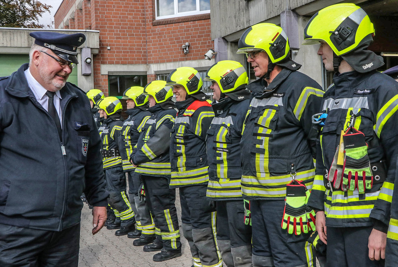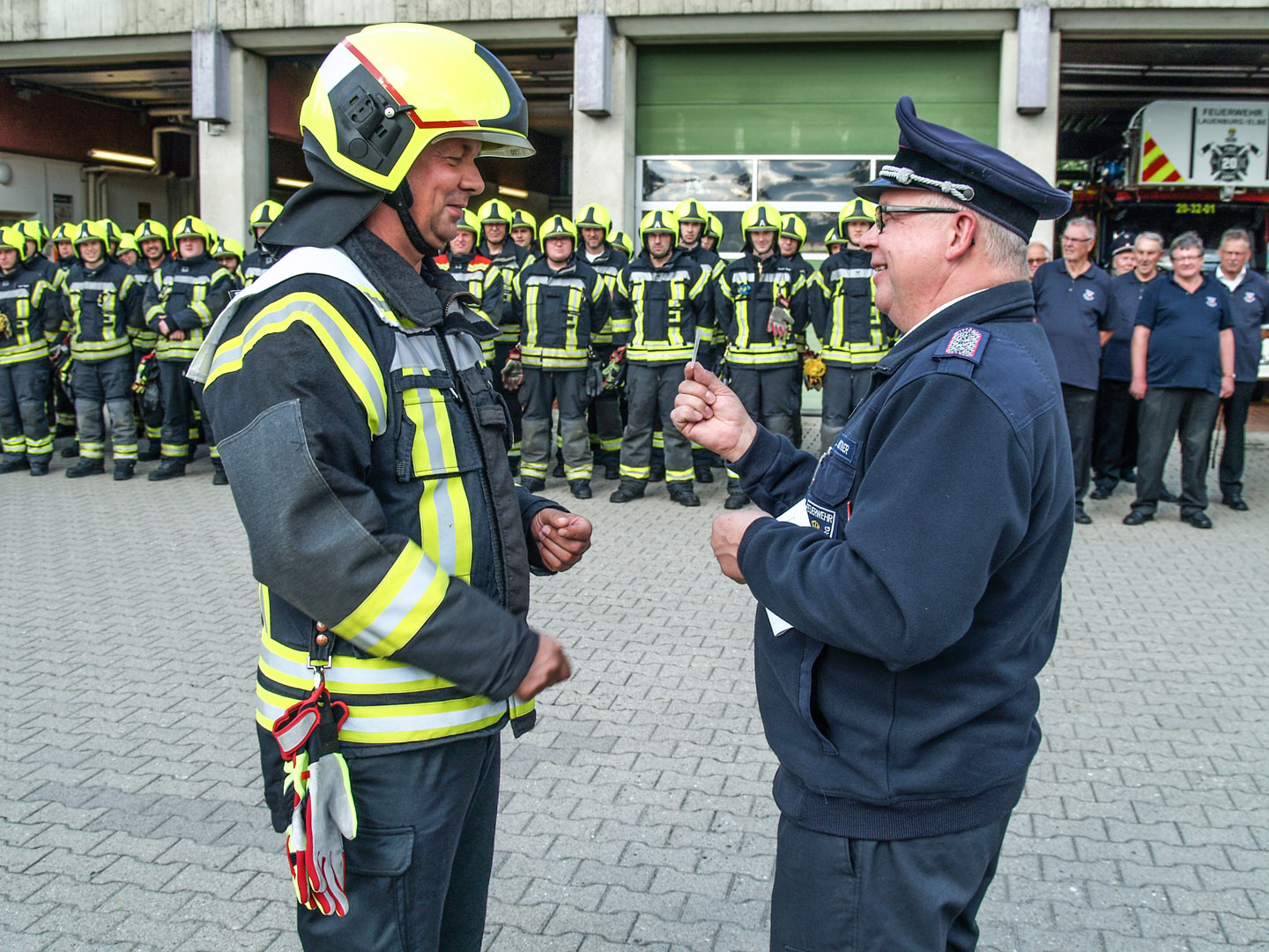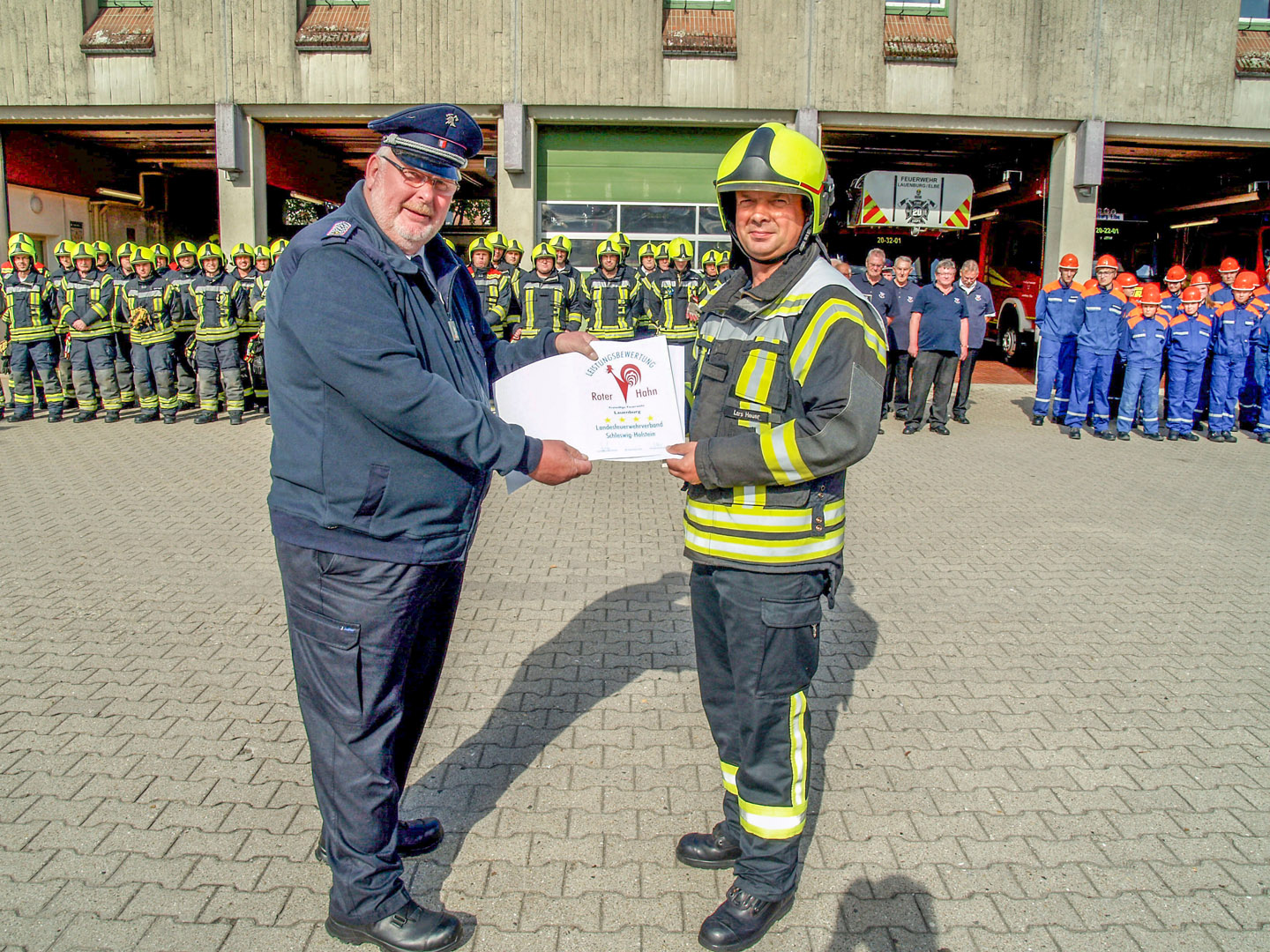 Lange übten die Mitglieder der Lauenburger Wehr auf diesen Tag hin, die Leistungsbewertung Roter Hahn Stufe 4 stand an. „Mittlerweile ist es einige Zeit her, dass wir uns an Stufe 3 getraut hatten, deshalb war es nun höchste Eisenbahn für die nächste Etappe“, erklärt stellv. Wehrführer Dennis Lühr. Ab neun Uhr versammelten sich die Mitglieder der Wehr an der Feuerwache und nahmen die Bewertungskommission, bestehend aus Prüfern des Kreises, in Empfang. Zunächst wurden Unterlagen kontrolliert und eingesehen. „Zu so einer großen Feuerwehr gehört eben auch einiges an Schreibkram“, scherzt Wehrführer Lars Heuer. Auf dem Hof der Wache ließ Lühr derweil bereits die gesamte Mannschaft antreten. Beim Formaldienst stellten die Mitglieder die Ordnung der Feuerwehr dar. Die Dienstanzüge wurden kontrolliert und auch beim Marschieren gucken die 8 Prüfer genau hin. Nachdem bereits die Fahrzeuge, die Wache und die Geräte begutachtet worden waren, merkte unter anderem der stellv. Kreiswehrführer Thorsten Möller die bauliche Situation an. „Es werden mehrere hunderttausend Euro schwere Fahrzeuge von der Stadt bereitgestellt, jedoch sorgen die viel zu engen Stellplätze sofort für starke Beschädigungen an der Karosserie.“ In zwei Unterrichten der Wehrführer erzählte Dennis Lühr über die Taktik im Innenangriff, hinterfragte dabei auch gängige Lehrmeinungen. – Sind drei Sprühstöße noch das Mittel der Wahl? – Ist es sinnvoll, eine Tür mit der Hand abzutasten? – Auch Wehrführer Heuer machte auf Themen aufmerksam, die vielleicht in der Vergangenheit noch in Ordnung waren. – „Feuerkrebs ist ein bedeutendes Thema, auch in freiwilligen Feuerwehren“, erklärt der Wehrführer. „Bei uns gibt es jedoch absolut keine Schwarz-Weiß-Trennung!“ Gemeint sind reine und unreine Bereiche, so hängt die saubere Zivilkleidung im selben Schrank wie die Einsatzschutzbekleidung. Auch die räumliche Situation ist kaum mehr hinnehmbar. Bei den anschließenden Einsatzübungen ging es zur Sache. An der Lauenburger Hitzler Werft boten sich viele Einsatzszenarien. Gleich zu Beginn kletterten drei Mitglieder auf einen Kran und bereiteten sich für die Selbstrettung vor. Aus rund 10m Höhe ließ sich Conrad Wegmann gesichert in einem Auffanggurt sicher zu Boden. Stetig überwacht von seinen Truppmännern auf der Plattform. Auch bei einer Rettung mit Hebekissen durch die Besatzung vom HLF ging alles glatt, schnell und routiniert saßen alle Handgriffe. Ebenso bei der Rettung einer Person von einem tiefer gelegenen Ort. Über die schiefe Ebene wurde ein Dummy mittels Schleifkorbtrage gerettet. Dabei werden Steckleiterteile als „Schiene“ benutzt und die Trage mit Leinen nach oben gezogen. Schließlich zeigten die 3. und 4. Gruppe ihr Können bei einem Löschangriff. In einer Lagerhalle war es zu einem Kellerbrand gekommen. Schnell war der erste Trupp im Gebäude und rettete eine Person aus dem Untergeschoss. Auch ein eingespielter Atemschutznotfall wurde von der Mannschaft professionell abgearbeitet. Schließlich ging es wieder an die Feuerwache in der Reeperbahn, wo die Bewerter sich nach einer kurzen Besprechung bei der Truppe bedankten. „Es hat uns sehr viel Spaß gemacht“, erklärt der Leiter der Bewertungskommission Ralf Kreutner. „Eine Feuerwehr, die Auftritt wie Profis“, ergänzt Thorsten Möller und überreicht Wehrführer Lars Heuer feierlich als zweite Stadtwehr im Kreis die Urkunde sowie den vierten Stern der Leistungsbewertung. Schließlich klang die gelungene Veranstaltung bei Fleisch und Wurst vom Grill am Nachmittag langsam aus.