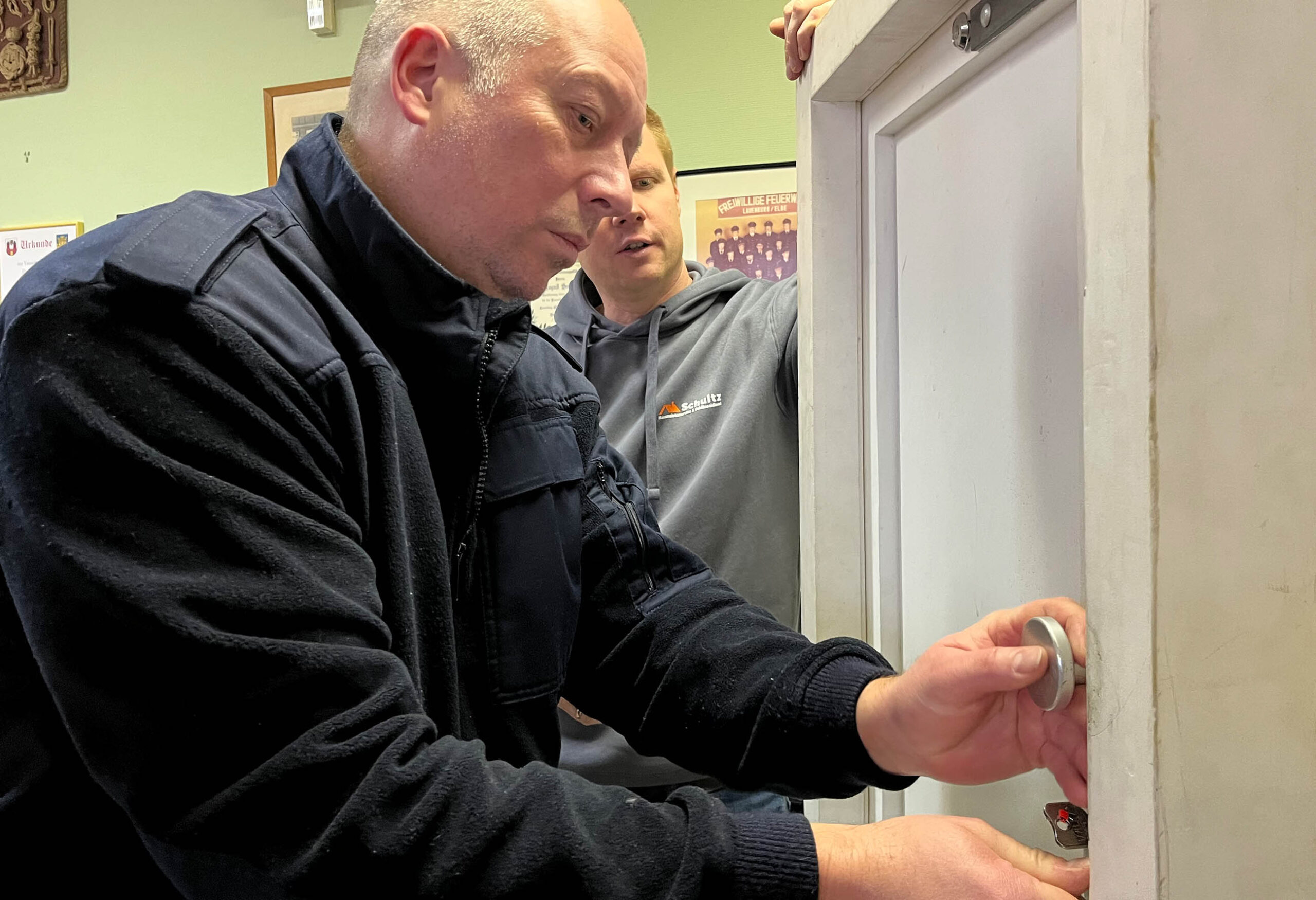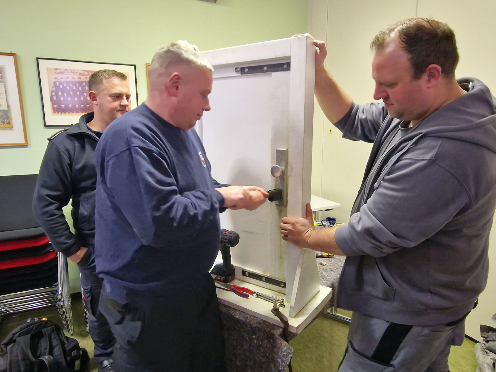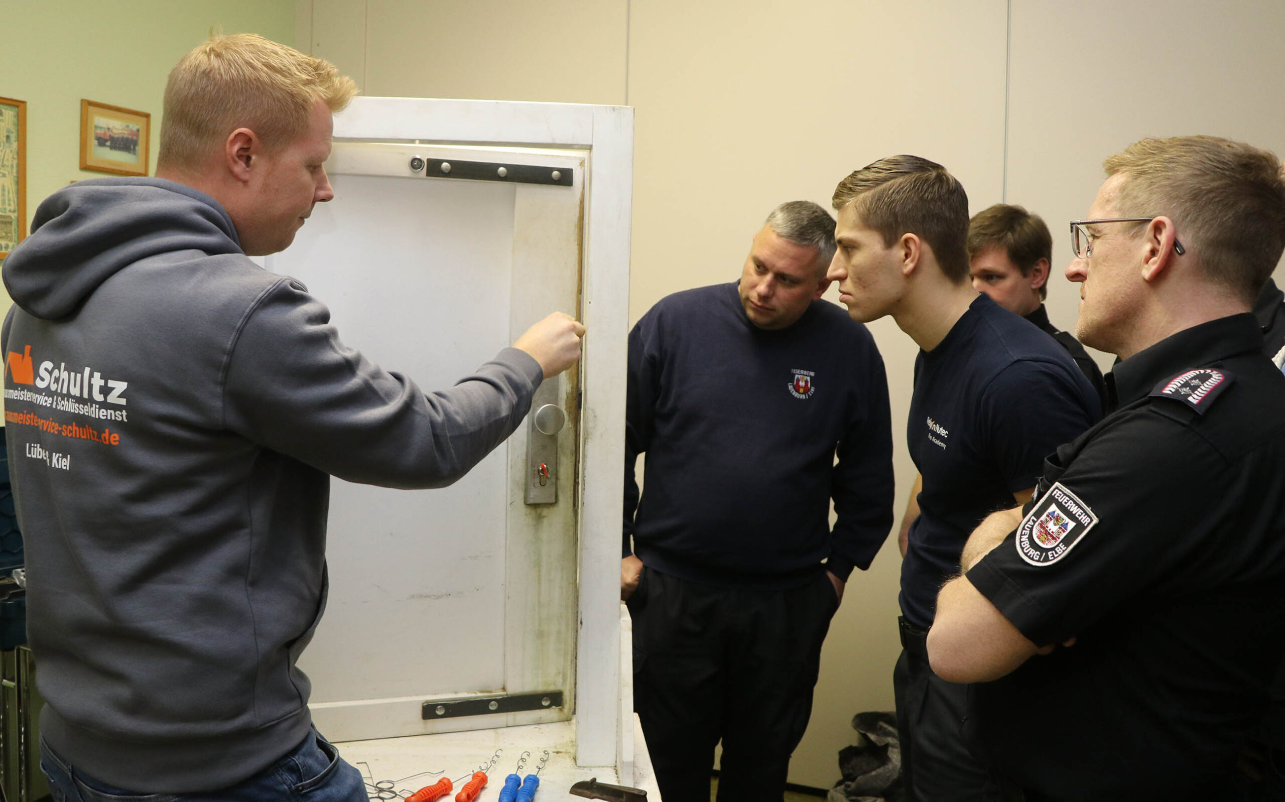 Um im Ernstfall bestens vorbereitet zu sein, absolvierten am Samstag 18 Mitglieder der Lauenburger Feuerwehr ein Türöffnungsseminar. Unschwer erkennen Besucher unserer Webseite das Notfall-Türöffnungen den Schwerpunkt unserer Arbeit ausmachen. Wir kommen immer dann zum Einsatz, wenn Gefahr im Verzug ist. Etwa bei medizinischen Notfällen oder vermutete Gefahr zum Beispiel bei piependen Rauchwarnmeldern. Mit drei Ausbildern kam das Team vom Schlüsseldienst Schultz aus Lübeck. Hauptberuflich sind viele der Mitarbeiter bei der Berufsfeuerwehr beschäftigt, so konnten die Ausbilder gezielt auf unsere Einsatzkräfte eingehen. Zunächst wurde mit einem theoretischen Block in den Tag gestartet, wie sind Schlösser aufgebaut und welche Arten von Schlössern gibt es. David Schlutz, der Chef der Firma erklärte auch anhand von Modellen die Funktionsweise und Mechanik der verschiedenen Schließsysteme. Schließlich ging es über zu Praxis. Eingeteilt in drei Gruppen rotierten die Mitglieder über die verschiedenen Stationen. Es mussten zugefallene Türen mit Drähten oder Blechen geöffnet werden. Auch Spezialwerkzeuge kamen zum Einsatz. Der korrekte Einsatz konnte an extra mitgebrachten Übungstüren trainiert werden. An der nächsten Station ging es darum einen Zugang über ein Fenster zu schaffen. Sind Fenster gekippt, so hat die Feuerwehr oft eine Chance hierüber einen Zugang zum Objekt und so z.B. zum Patienten zu schaffen. An der 3. Station ging es um verschlossene Türen. Neben den uns bekannten Werkzeugen wurde auch der „Maho-Fix“ vorgestellt. Mit dem Werkzeug kann das Schloss blitzschnell gebrochen und zerstört werden. Mit dem nötigen Zubehör und etwas Fingerspitzengefühl ließen sich die Übungstüren so schneller als bisher öffnen. Auch einen Exkurs zum fräsen machten die interessierten Mitglieder. Dabei wird mit einem Gradschleifer unter ohrenbetäubendem Lärm der Schließkanal zerstört. Mit Werkzeug kann anschließend das Schloss geöffnet werden. Nach 8 Stunden Unterricht blickten die Mitglieder und das Team vom Schlüsseldienst Schultz auf einen erfolgreichen Tag zurück. Die Mitglieder haben viel neues Wissen erlangt und den Umgang mit vorhanden Werkzeugen vertieft.