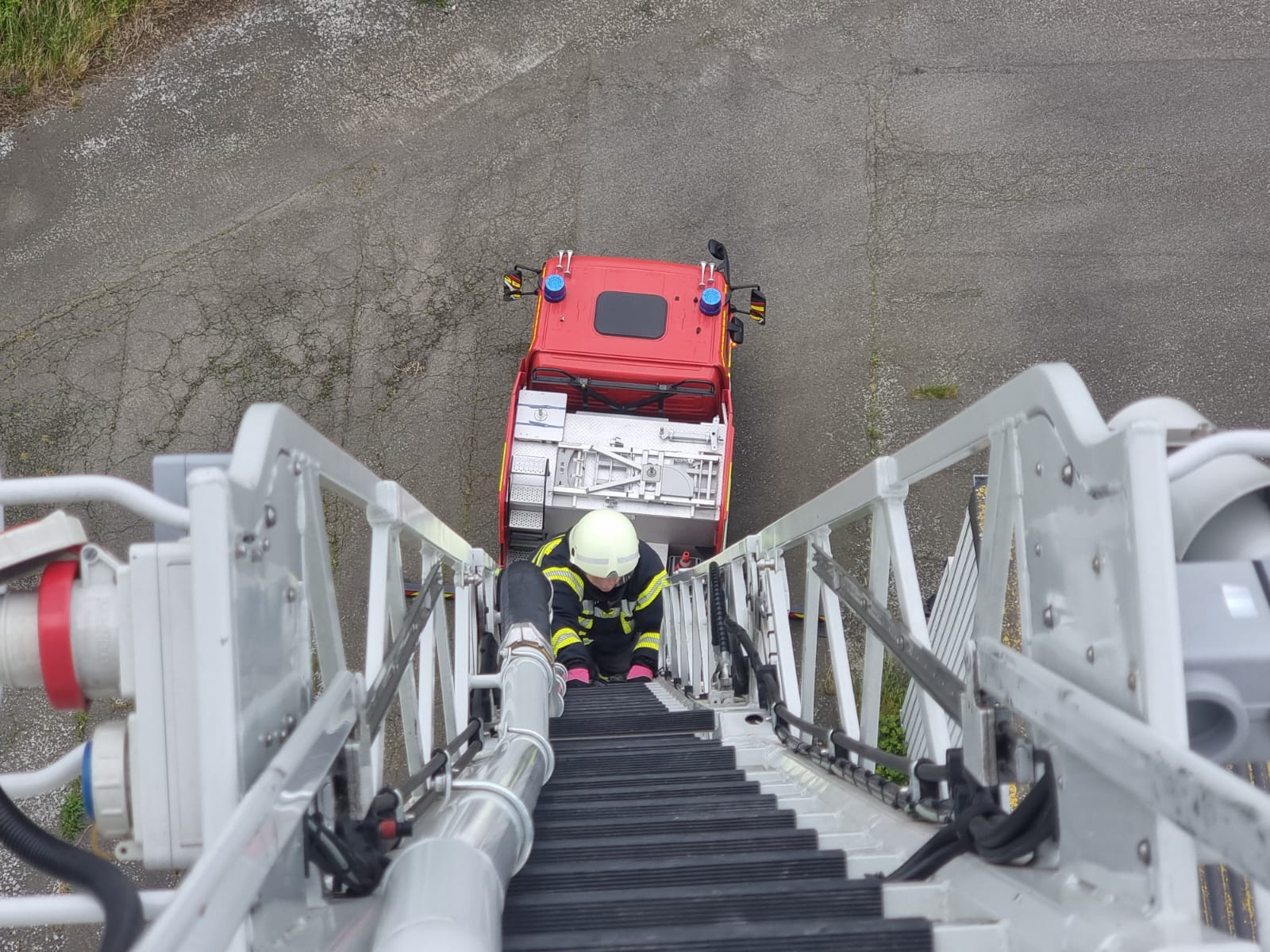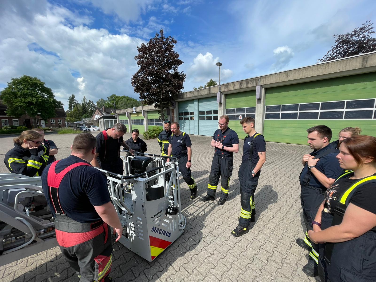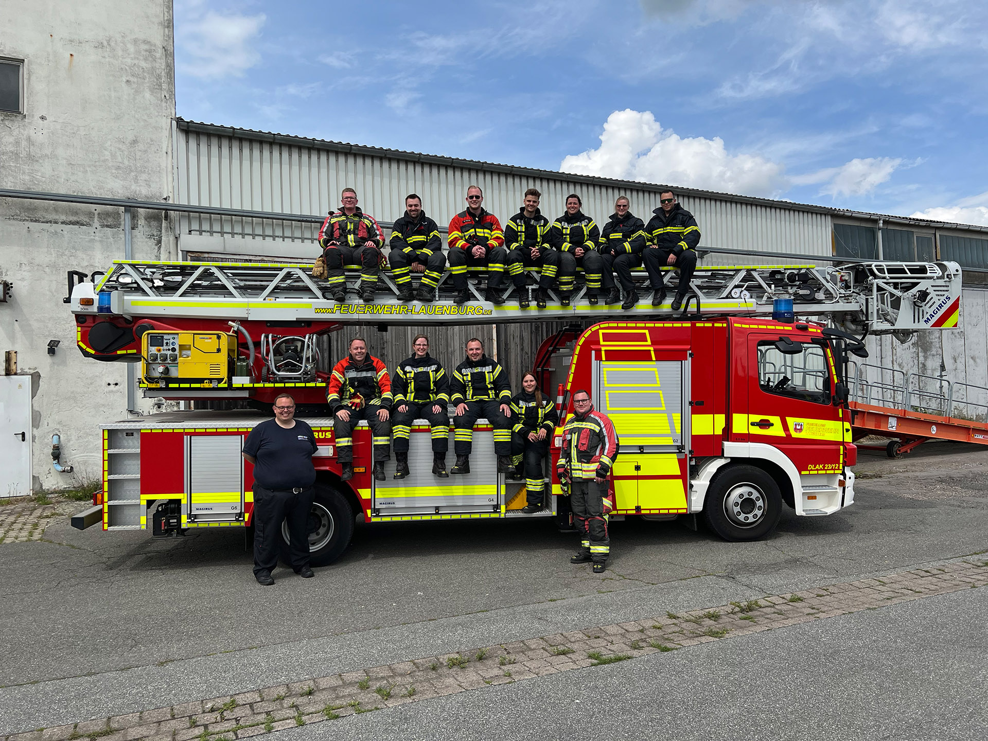 Schon zum zweiten mal besuchten uns Auszubildene Leitstellendisponenten der Leitstelle Süd in Bad Oldesloe und West aus Elmshorn bei der Feuerwehr in Lauenburg. Schon die ersten Azubis, welche die Landeseinheitliche Disponenten-Ausbildung durchlaufen, absolvierten 2021 zu ihrer Feuerwehr Grundausbildung ein Modul Drehleiter bei uns. Los ging es mit einem Theorieuntericht, in dem Grundlagen, Einsatzmöglichkeiten beim Einsatz von Hubrettungsmitteln vermittelt wurden. Warum heißt die DLK eigentlich DLK und woher kommen die 23/12. Fragen die gemeinsam beantwortet wurden. Schließlich ging es zum Praxisteil auf den Hof. Die Drehleiter stand bereit. Neben der Bedienung der Abstützung ging es auch um die Steuerung im Korb. Einsatzgrundsätze wie Sicherheit und Kontrollen wurden besprochen und schließlich ging es bis auf 32m Arbeitshöhe hinauf. Bei einer gemeinsamen Übung wurde eine Person mit der Schleifkorbtrage gerettet, ein Einsatz der Häufig gemeinsam mit dem Rettungsdienst bewältigt wird. Nach der Mittagspause ging es in das Lauenburger Industriegebiet. An einem geeigneten Übungsobjekt wurden verschiedene Übungen gefahren. Abstände mussten richtig eingeschätzt werden um das Übungsziel zu erreichen. Nach einem spannenden Tag verabschiedeten sich die Teilnehmer, gerade rechtzeitig denn die Drehleiter rückte ab zu einem Einsatz.