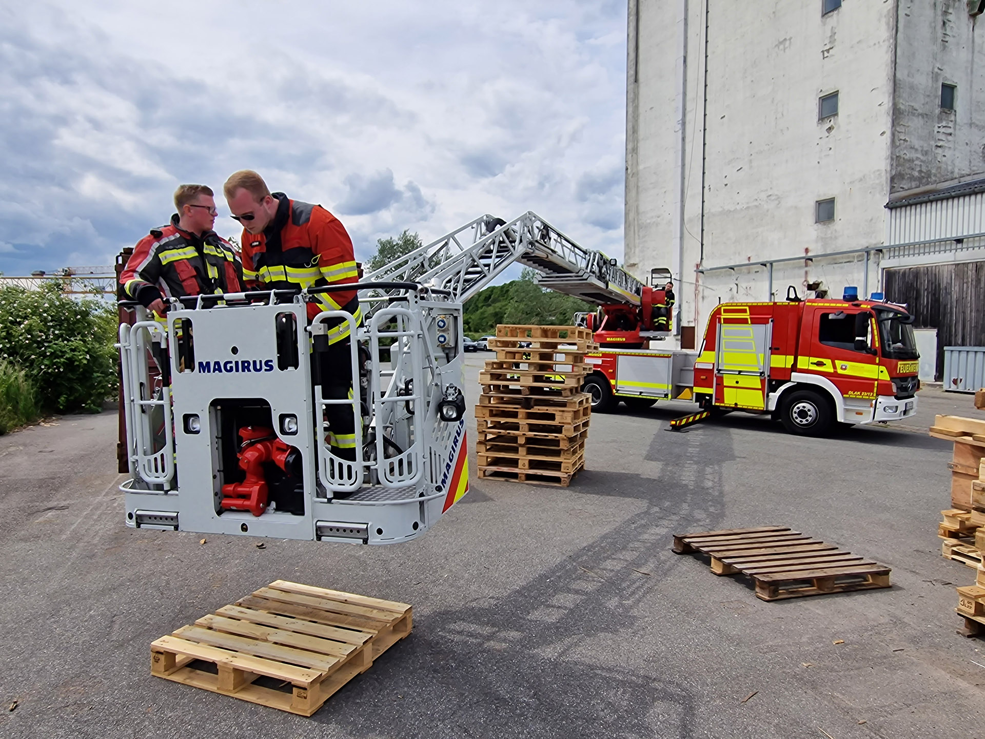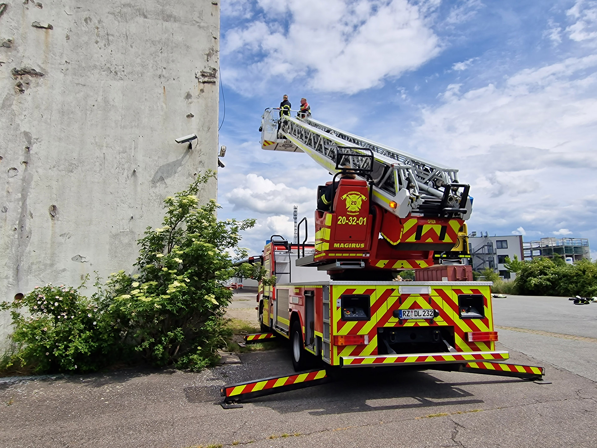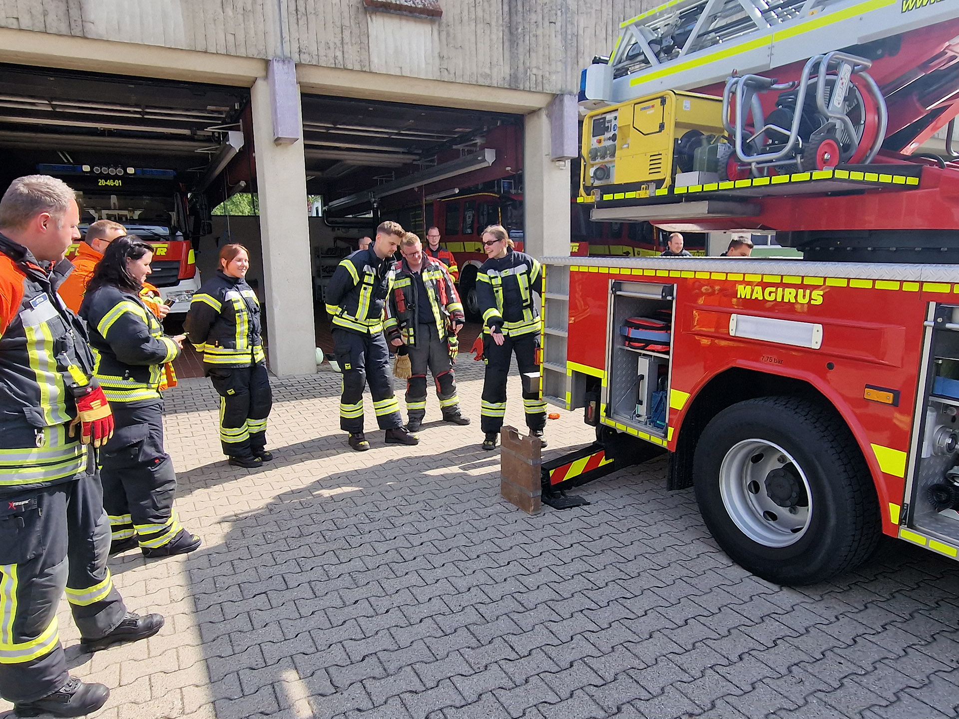 Schon zum zweiten mal besuchten uns Auszubildene Leitstellendisponenten der Leitstelle Süd in Bad Oldesloe und West aus Elmshorn bei der Feuerwehr in Lauenburg. Schon die ersten Azubis, welche die Landeseinheitliche Disponenten-Ausbildung durchlaufen, absolvierten 2021 zu ihrer Feuerwehr Grundausbildung ein Modul Drehleiter bei uns. Los ging es mit einem Theorieuntericht, in dem Grundlagen, Einsatzmöglichkeiten beim Einsatz von Hubrettungsmitteln vermittelt wurden. Warum heißt die DLK eigentlich DLK und woher kommen die 23/12. Fragen die gemeinsam beantwortet wurden. Schließlich ging es zum Praxisteil auf den Hof. Die Drehleiter stand bereit. Neben der Bedienung der Abstützung ging es auch um die Steuerung im Korb. Einsatzgrundsätze wie Sicherheit und Kontrollen wurden besprochen und schließlich ging es bis auf 32m Arbeitshöhe hinauf. Bei einer gemeinsamen Übung wurde eine Person mit der Schleifkorbtrage gerettet, ein Einsatz der Häufig gemeinsam mit dem Rettungsdienst bewältigt wird. Nach der Mittagspause ging es in das Lauenburger Industriegebiet. An einem geeigneten Übungsobjekt wurden verschiedene Übungen gefahren. Abstände mussten richtig eingeschätzt werden um das Übungsziel zu erreichen. Nach einem spannenden Tag verabschiedeten sich die Teilnehmer, gerade rechtzeitig denn die Drehleiter rückte ab zu einem Einsatz.