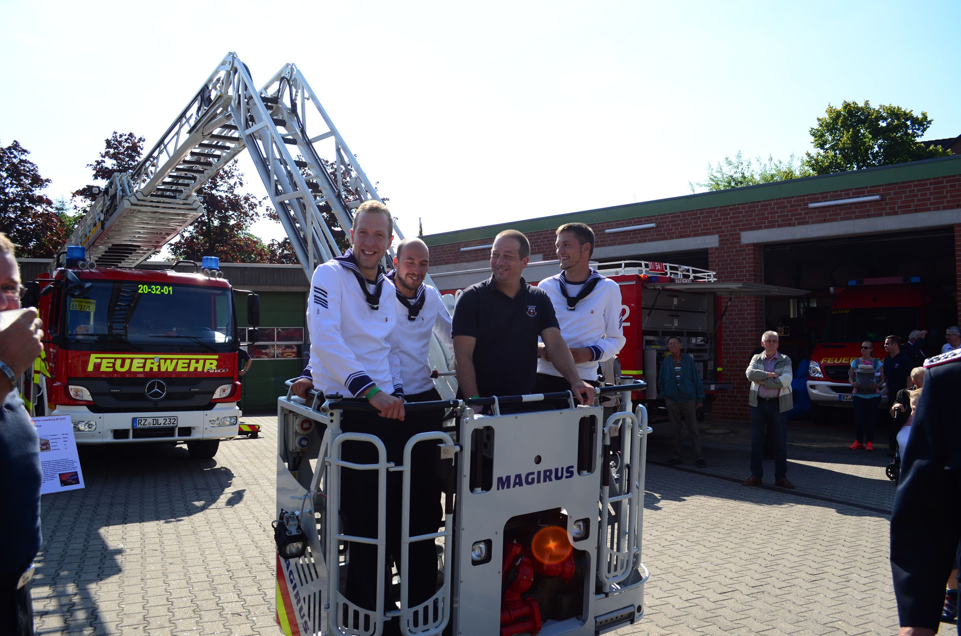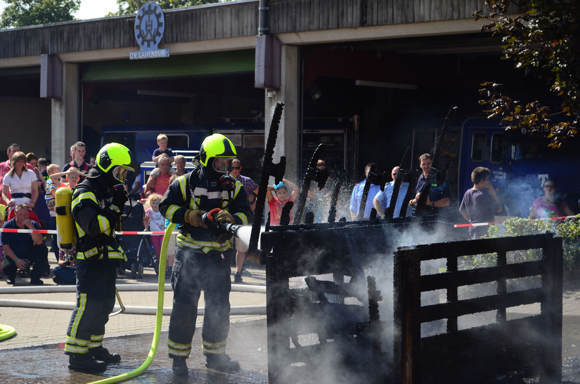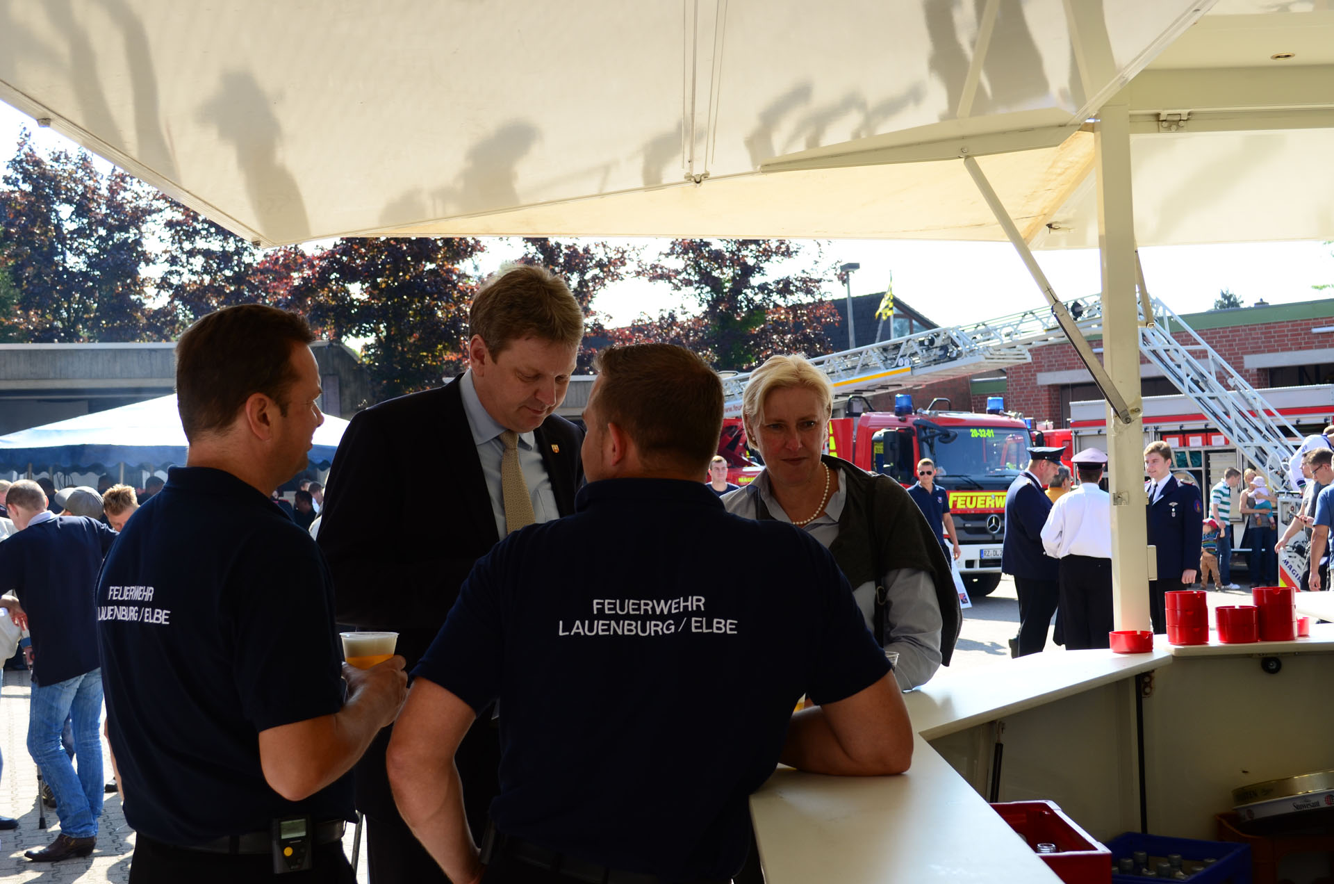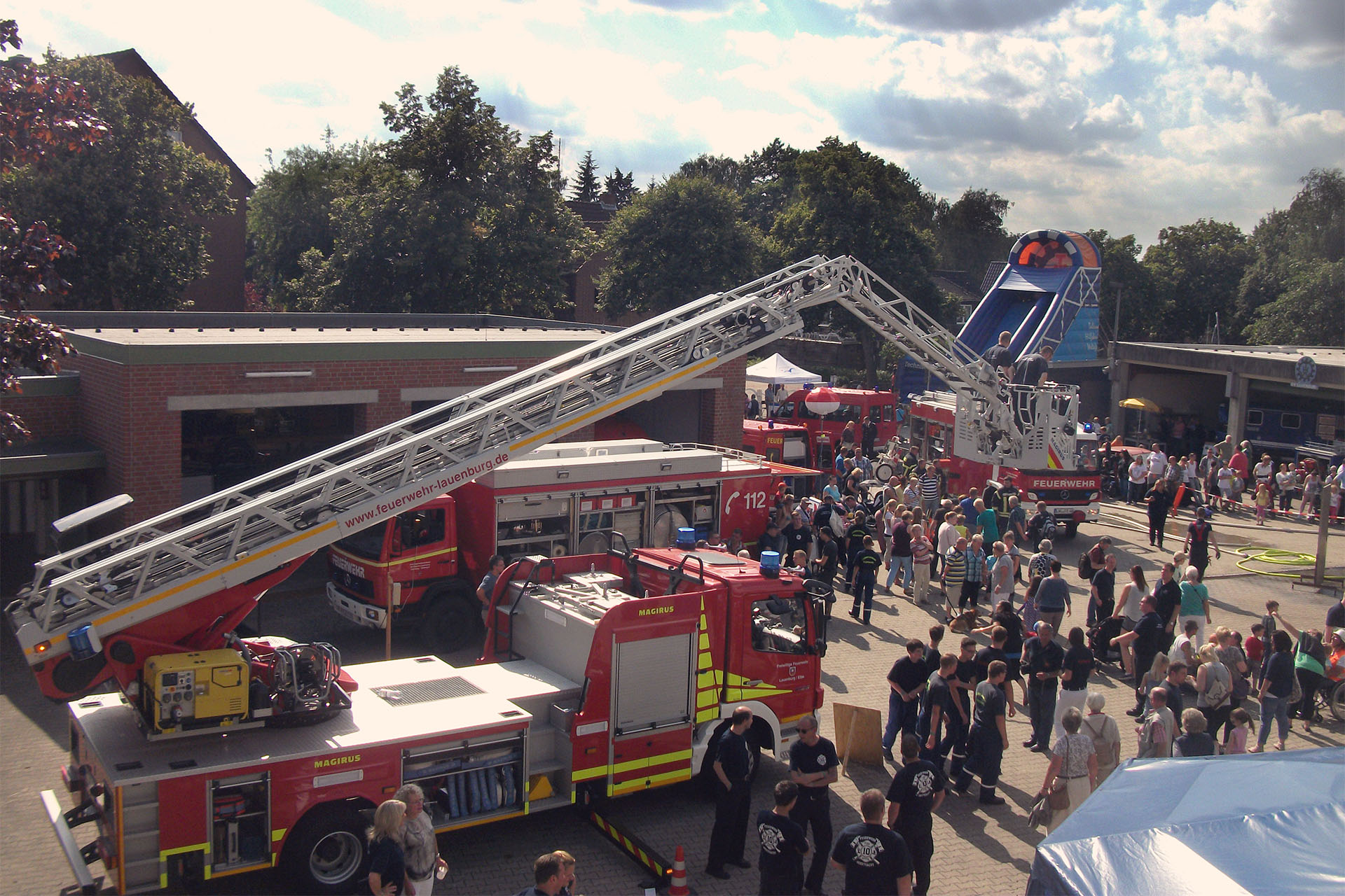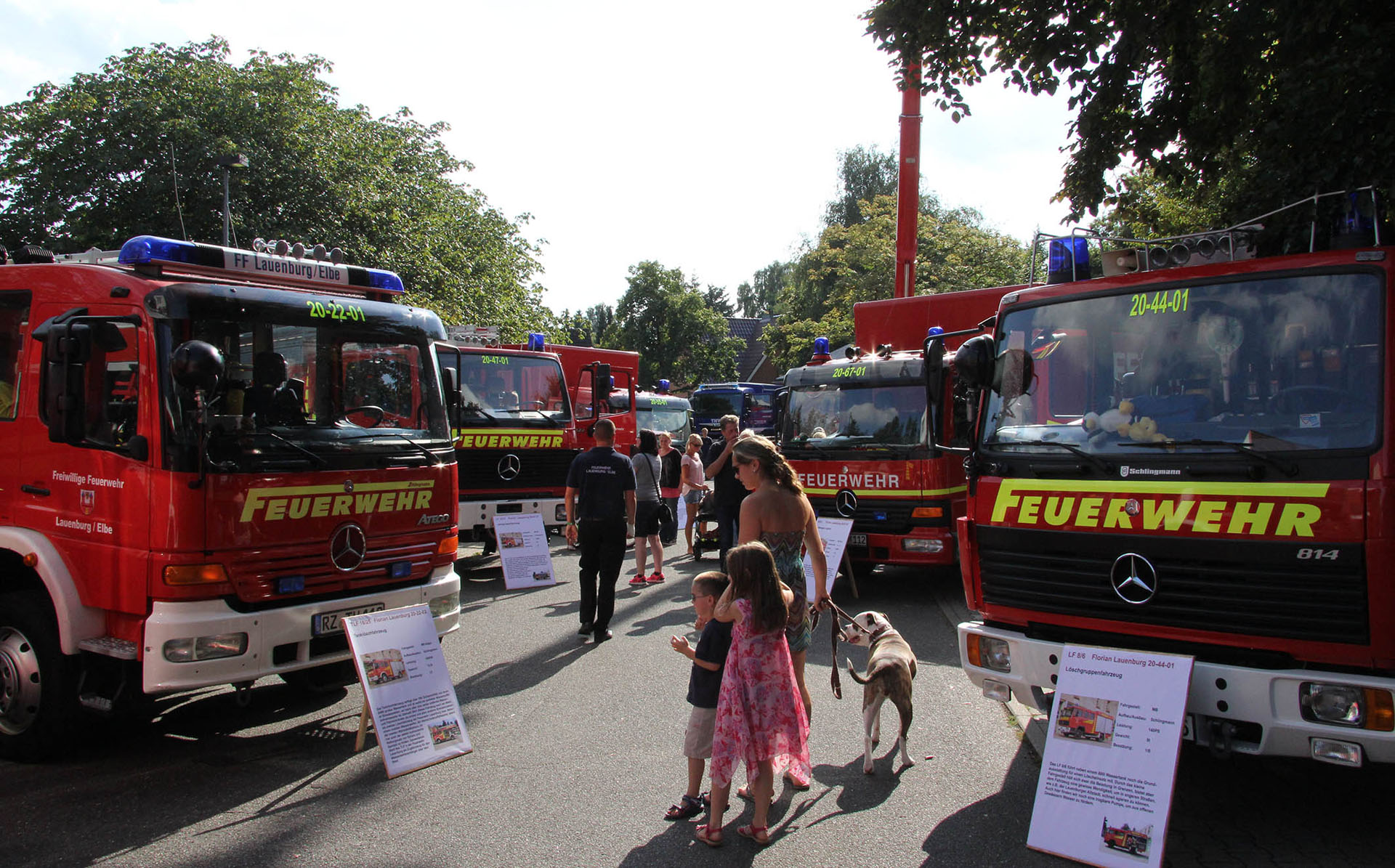 140 Jahre Freiwillige Feuerwehr Lauenburg Elbe und 25 Jahre Partnerschaft zur Feuerwehr Boizenburg wurden vom 28. – 29. August in Lauenburg gefeiert. Ein großer Kommerz lud zahlreiche Gäste von Politik, befreundeten Vereinen und Institutionen, Freunde und Gäste der Feuerwehr am Freitagabend ein. Pünktlich um 19:00Uhr begrüßte Wehrführer Lars Heuer die Gäste, freute sich sehr Über den zahlreichen Besuch, der sogar aus Luxemburg angereist war. Vertreter der Stadt wie zum Beispiel Bürgermeister Thiede und den Bürgervorsteher von Lauenburg konnte Heuer ebenso begrüßen wie Verantwortliche der Stadt Boizenburg. Rund 200 Gäste fanden in der Fahrzeughalle der Feuerwache Platz, die bereits Tage vorher gründlich gesäubert wurde. Dekoration hauchte dem Gebäude einen wohnlichen Charakter ein, die strahlenden Einsatzfahrzeuge auf dem Innenhof geleiteten die Gäste zum Eingang. In Zahlreichen Grußworten überbrachten Vertreter von Politik und befreundeten Feuerwehren sowie Vereinen beste Glückwünsche zum 140-Jährigen Bestehen. Die durchweg ehrenamtliche Arbeit ist hoch anzusehen, verdient höchsten Respekt hieß es. Damit auch künftig die Einsatzkräfte aber auch die Jugendfeuerwehr sicher zu Einsätzen und Ausflügen kommen überreichte Bürgermeister Andreas Thiede symbolisch ein gebasteltes Mannschaftstransportfahrzeug, „auf dem Bewusst keine Marke abgebildet ist“ unterstreicht Thiede. Zur Zeit läuft die Ausschreibung für das neue Fahrzeug, dass den Ansprüchen der Feuerwehr genügen muss, um den täglichen Aufgaben Dienst zu leisten, erklärt er. Nachdem die Grußworte überbracht wurden, konnte noch eine Beförderung vorgenommen werden. Schriftführer Ingo Drewelowsky wurde im Rahmen seiner Tätigkeit vom Hauptfeuerwehrmann zum Löschmeister befördert. Anschließend steuerte Heuer gezielt auf 20:30 Uhr zu, die Enthüllung der neuen Internetpräsenz stand bevor. Unter Leitung von Sebastian Majchrzak bauten vier engagierte Mitglieder die neue Webpräsenz für moderne Öffentlichkeitsarbeit aus. Darunter sind auch Andreas Rogge, Timo Naujoks und Sebastian Porthun. Für die Enthüllung hatten sie sich etwas ganz besonderes einfallen lassen, eine Minute vorher erschien auf der großen Leinwand ein Countdown. Die Spannung stieg, bevor schließlich der Lauenburg typische Melderton erschrill. Hektische Bilder zeigten den nächtlichen Einsatzablauf, aufschrecken im Schlaf, rein in die Schuhe und mit dem Auto zur Wache… – Dort in die Einsatzkleidung und mit den Großfahrzeugen zum Einsatzort. – Anschließend wurde es wieder ruhiger, der Blick über die Schulter zeigte die Eingabe von www.feuerwehr-lauenburg.de im Suchfeld, anschließend war die neue Webpräsenz aktiv. Der Trailer sollte die stätige Aktualität der Webseite unterstreichen. Einsätze sollen künftig so zeitnah und informativ wie möglich eingepflegt werden. Nach der Veröffentlichung zückten viele Ihr Handy, um die neuen Seiten zu erforschen, was problemlos möglich ist, denn die neue Webseite ist vollständig mobilfähig. Im Anschluss gab es ein reichhaltiges Buffet, das allen hungrigen Gästen und Mitgliedern schmeckte. Am nächsten Morgen ging es schon früh los, am Schloss startete der große Marsch durch die Stadt, die gesamte Feuerwehr Lauenburg war mit der Einsatzabteilung, Ehren- und Jugendfeuerwehr angetreten. Daneben Mitglieder der Feuerwehr Boizenburg und zahlreiche aktive der umliegenden Gemeindewehren. Beeindruckend setzte sich der lange Marsch in Bewegung durch den Askanierring ging es über die Berliner Straße und den Büchener Weg schließlich in die Reeperbahn. Dort ging der Marsch in den Tag der offenen Tür über. Auf dem großen Freigelände lockten Spiel und Spaß für die kleinen genauso wie „Mit-mach Stationen“ für Erwachsene. Viele Besucher strömten zu den frisch heraus geputzten Löschfahrzeugen auf dem Parkplatz, in Reih standen hier die Großfahrzeuge, offene Geräteräume luden zum Staunen ein. Mitglieder erklärten interessierten die Geräte und Technik, verdeutlichten so den Umfang der ehrenamtlichen Ausbildung. Auf dem Innenhof lockten Alarmübungen. Um 12 Uhr alarmierte Torben Heuer, Pressesprecher der Feuerwehr, den Rettungsdienst und ein Hilfeleistungslöschfahrzeug. Ein Verkehrsunfall mit eingeklemmter Person war Ziel der Einsatzfahrt. Nach Erkundung durch den Fahrzeugführer gingen die Trupps vor, mit schwerem hydraulischem Gerät wurden zunächst die Türen und schließlich das Dach des PKW entfernt. Nun war eine schonende Rettung des Verunfallten möglich. Während der Übung erläuterte Heuer, was die Einsatzkräfte gerade tun, was die nächsten Schritte sind und worauf es ankommt. Im Anschluss konnten Erwachsene sich selbst an der Rettungsschere versuchen. Gruppenführer Heiko Raubenheimer erklärte den Besuchern den Umgang mit dem schweren hydraulischen Gerät. An einem zweiten Auto wurden Türen entfernt, Dächer eingeschnitten und Scheiben entfernt. Neben dem Löschzug-Gefahrgut der sich im Neubau mit seinen umfangreichen Aufgaben präsentierte war auch die Drehleiter eine große Attraktion. Der Blick von 31 Metern Höhe über die schöne Elbestadt lockte viele an. Die Magirus Leiter kam aber auch noch bei einer Alarmübung zum Einsatz. Gemeinsam mit dem Rettungswagen wurde eine Personenrettung vorgeführt. Von der Dachterrasse wurde eine vermeidlich erkrankte Person mit der Trage des Rettungswagens auf den sicheren Boden befördert. Wurst, Fleisch, Kaffee und Kuchen sorgten für die kulinarische Abrundung des sonnigen Samstages. Viele Besucher aus dem benachbarten Boizenburg feierten mit uns die Partnerschaft, Fans von weither angereist interessierten sich für die Vielfalt der Einsatzfahrzeuge und interessanten Motive. In den Räumlichkeiten des THW stellten Helfer die umfangreiche Ausstattung der Lauenburger Ortsgruppe aus. Auf dem Triftweg brachten sie am Morgen die THW-Riesenrutsche in Stellung, ein Magnet für die kleinen. Neben einer Fettexplosion
