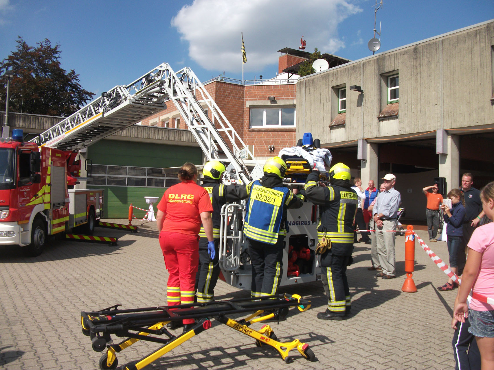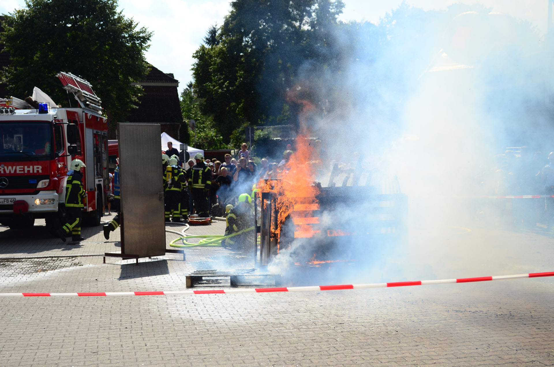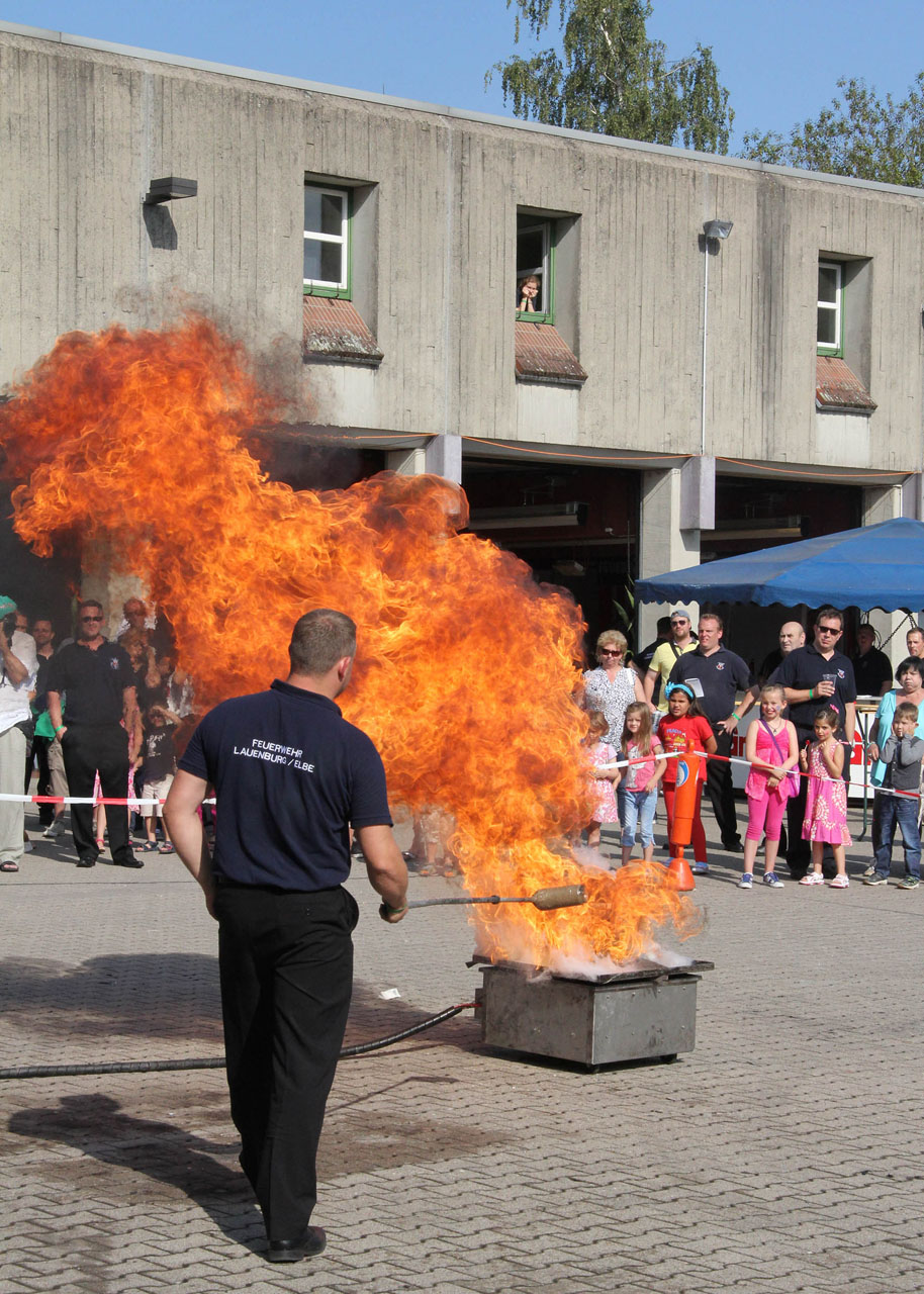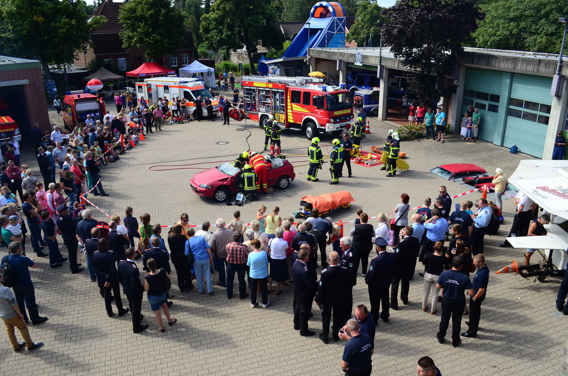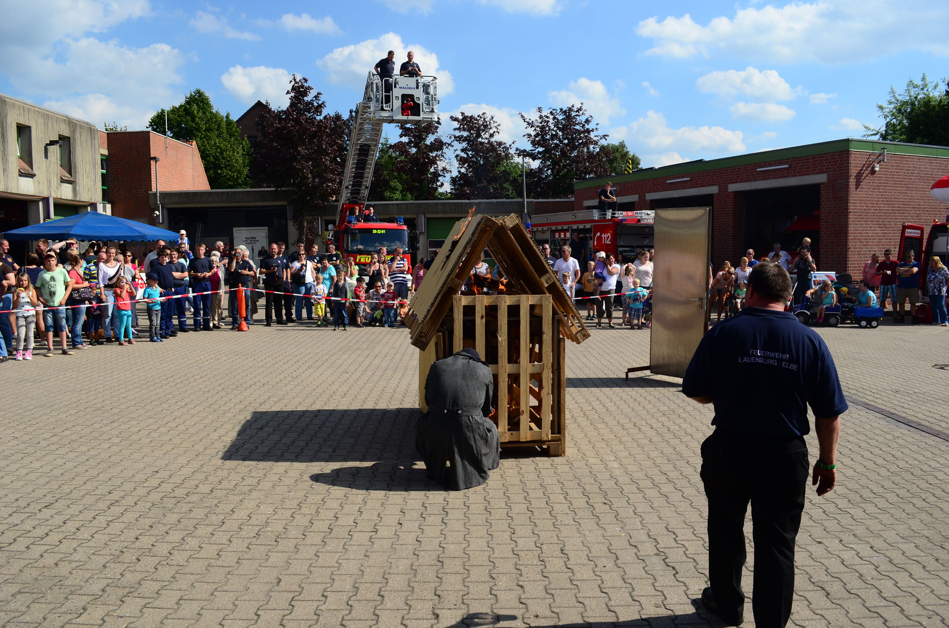140 Jahre Freiwillige Feuerwehr Lauenburg Elbe und 25 Jahre Partnerschaft zur Feuerwehr Boizenburg wurden vom 28. – 29. August in Lauenburg gefeiert. Ein großer Kommerz lud zahlreiche Gäste von Politik, befreundeten Vereinen und Institutionen, Freunde und Gäste der Feuerwehr am Freitagabend ein. Pünktlich um 19:00Uhr begrüßte Wehrführer Lars Heuer die Gäste, freute sich sehr Über den zahlreichen Besuch, der sogar aus Luxemburg angereist war. Vertreter der Stadt wie zum Beispiel Bürgermeister Thiede und den Bürgervorsteher von Lauenburg konnte Heuer ebenso begrüßen wie Verantwortliche der Stadt Boizenburg. Rund 200 Gäste fanden in der Fahrzeughalle der Feuerwache Platz, die bereits Tage vorher gründlich gesäubert wurde. Dekoration hauchte dem Gebäude einen wohnlichen Charakter ein, die strahlenden Einsatzfahrzeuge auf dem Innenhof geleiteten die Gäste zum Eingang. In Zahlreichen Grußworten überbrachten Vertreter von Politik und befreundeten Feuerwehren sowie Vereinen beste Glückwünsche zum 140-Jährigen Bestehen. Die durchweg ehrenamtliche Arbeit ist hoch anzusehen, verdient höchsten Respekt hieß es. Damit auch künftig die Einsatzkräfte aber auch die Jugendfeuerwehr sicher zu Einsätzen und Ausflügen kommen überreichte Bürgermeister Andreas Thiede symbolisch ein gebasteltes Mannschaftstransportfahrzeug, „auf dem Bewusst keine Marke abgebildet ist“ unterstreicht Thiede. Zur Zeit läuft die Ausschreibung für das neue Fahrzeug, dass den Ansprüchen der Feuerwehr genügen muss, um den täglichen Aufgaben Dienst zu leisten, erklärt er. Nachdem die Grußworte überbracht wurden, konnte noch eine Beförderung vorgenommen werden. Schriftführer Ingo Drewelowsky wurde im Rahmen seiner Tätigkeit vom Hauptfeuerwehrmann zum Löschmeister befördert. Anschließend steuerte Heuer gezielt auf 20:30 Uhr zu, die Enthüllung der neuen Internetpräsenz stand bevor. Unter Leitung von Sebastian Majchrzak bauten vier engagierte Mitglieder die neue Webpräsenz für moderne Öffentlichkeitsarbeit aus. Darunter sind auch Andreas Rogge, Timo Naujoks und Sebastian Porthun. Für die Enthüllung hatten sie sich etwas ganz besonderes einfallen lassen, eine Minute vorher erschien auf der großen Leinwand ein Countdown. Die Spannung stieg, bevor schließlich der Lauenburg typische Melderton erschrill. Hektische Bilder zeigten den nächtlichen Einsatzablauf, aufschrecken im Schlaf, rein in die Schuhe und mit dem Auto zur Wache… – Dort in die Einsatzkleidung und mit den Großfahrzeugen zum Einsatzort. – Anschließend wurde es wieder ruhiger, der Blick über die Schulter zeigte die Eingabe von www.feuerwehr-lauenburg.de im Suchfeld, anschließend war die neue Webpräsenz aktiv. Der Trailer sollte die stätige Aktualität der Webseite unterstreichen. Einsätze sollen künftig so zeitnah und informativ wie möglich eingepflegt werden. Nach der Veröffentlichung zückten viele Ihr Handy, um die neuen Seiten zu erforschen, was problemlos möglich ist, denn die neue Webseite ist vollständig mobilfähig. Im Anschluss gab es ein reichhaltiges Buffet, das allen hungrigen Gästen und Mitgliedern schmeckte. Am nächsten Morgen ging es schon früh los, am Schloss startete der große Marsch durch die Stadt, die gesamte Feuerwehr Lauenburg war mit der Einsatzabteilung, Ehren- und Jugendfeuerwehr angetreten. Daneben Mitglieder der Feuerwehr Boizenburg und zahlreiche aktive der umliegenden Gemeindewehren. Beeindruckend setzte sich der lange Marsch in Bewegung durch den Askanierring ging es über die Berliner Straße und den Büchener Weg schließlich in die Reeperbahn. Dort ging der Marsch in den Tag der offenen Tür über. Auf dem großen Freigelände lockten Spiel und Spaß für die kleinen genauso wie „Mit-mach Stationen“ für Erwachsene. Viele Besucher strömten zu den frisch heraus geputzten Löschfahrzeugen auf dem Parkplatz, in Reih standen hier die Großfahrzeuge, offene Geräteräume luden zum Staunen ein. Mitglieder erklärten interessierten die Geräte und Technik, verdeutlichten so den Umfang der ehrenamtlichen Ausbildung. Auf dem Innenhof lockten Alarmübungen. Um 12 Uhr alarmierte Torben Heuer, Pressesprecher der Feuerwehr, den Rettungsdienst und ein Hilfeleistungslöschfahrzeug. Ein Verkehrsunfall mit eingeklemmter Person war Ziel der Einsatzfahrt. Nach Erkundung durch den Fahrzeugführer gingen die Trupps vor, mit schwerem hydraulischem Gerät wurden zunächst die Türen und schließlich das Dach des PKW entfernt. Nun war eine schonende Rettung des Verunfallten möglich. Während der Übung erläuterte Heuer, was die Einsatzkräfte gerade tun, was die nächsten Schritte sind und worauf es ankommt. Im Anschluss konnten Erwachsene sich selbst an der Rettungsschere versuchen. Gruppenführer Heiko Raubenheimer erklärte den Besuchern den Umgang mit dem schweren hydraulischen Gerät. An einem zweiten Auto wurden Türen entfernt, Dächer eingeschnitten und Scheiben entfernt. Neben dem Löschzug-Gefahrgut der sich im Neubau mit seinen umfangreichen Aufgaben präsentierte war auch die Drehleiter eine große Attraktion. Der Blick von 31 Metern Höhe über die schöne Elbestadt lockte viele an. Die Magirus Leiter kam aber auch noch bei einer Alarmübung zum Einsatz. Gemeinsam mit dem Rettungswagen wurde eine Personenrettung vorgeführt. Von der Dachterrasse wurde eine vermeidlich erkrankte Person mit der Trage des Rettungswagens auf den sicheren Boden befördert. Wurst, Fleisch, Kaffee und Kuchen sorgten für die kulinarische Abrundung des sonnigen Samstages. Viele Besucher aus dem benachbarten Boizenburg feierten mit uns die Partnerschaft, Fans von weither angereist interessierten sich für die Vielfalt der Einsatzfahrzeuge und interessanten Motive. In den Räumlichkeiten des THW stellten Helfer die umfangreiche Ausstattung der Lauenburger Ortsgruppe aus. Auf dem Triftweg brachten sie am Morgen die THW-Riesenrutsche in Stellung, ein Magnet für die kleinen. Neben einer Fettexplosion