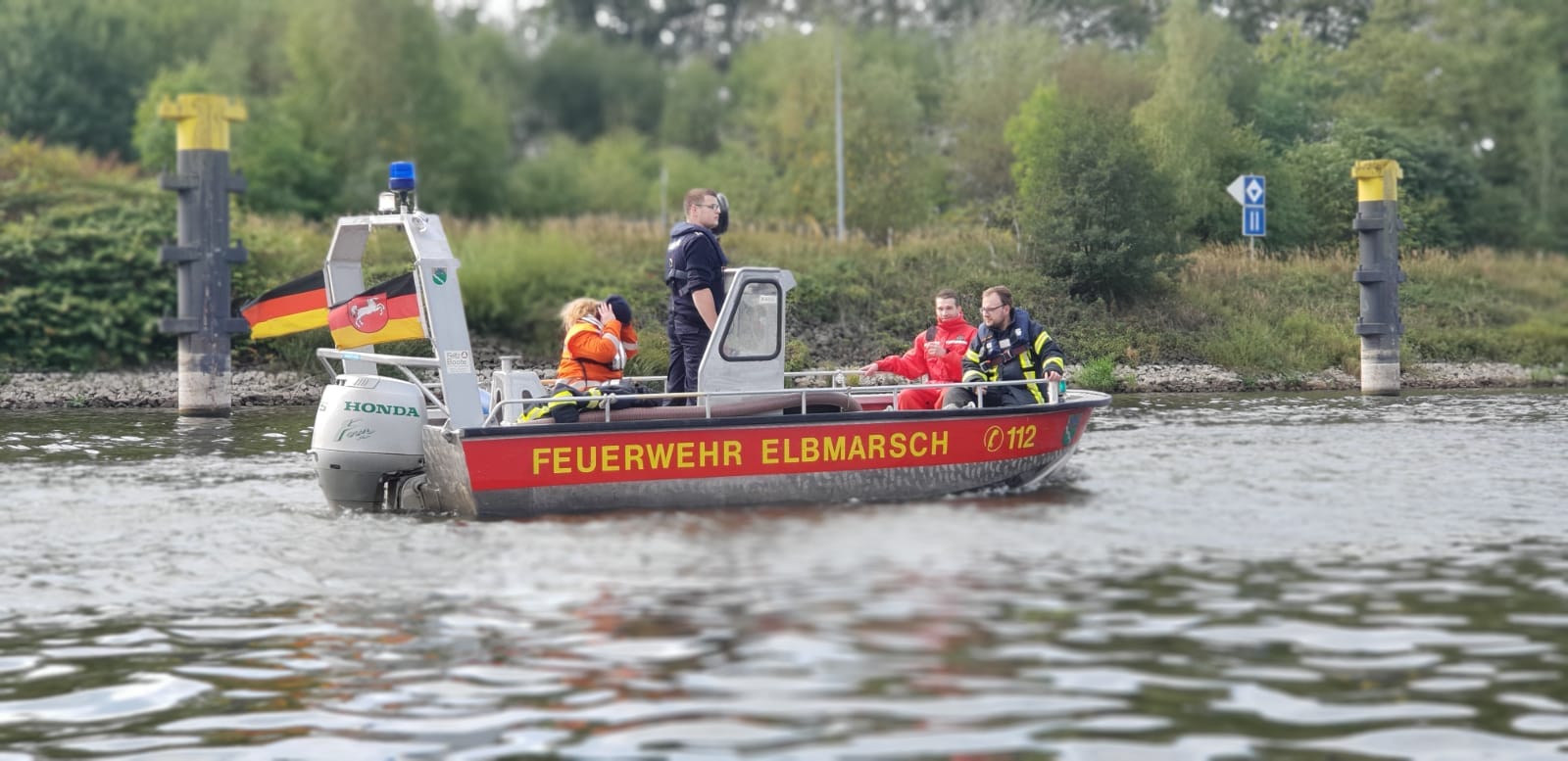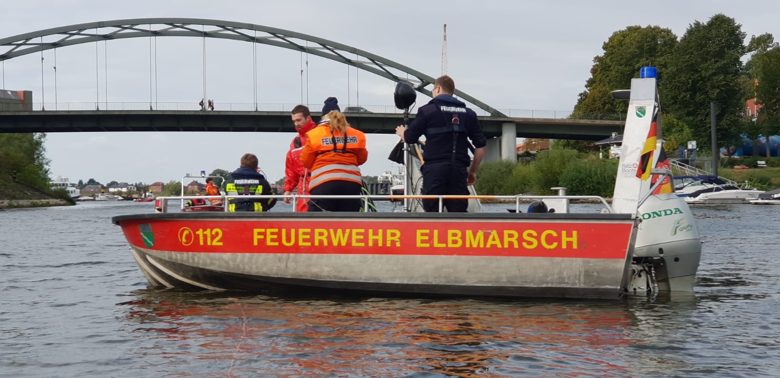 Gemeinsam mit dem Ölschadens-Bekämpfungs-Zug des Landkreises Harburg probten die Lauenburger am Samstag den Ernstfall. Die Kolonne aus Harburg setzte sich gegen 8 Uhr in Bewegung und machte sich auf den Weg nach Schleswig-Holstein. An der Feuerwache nahm Ralf Eckhoff als Übungsleiter die Gäste im Empfang. Gleich mehrere Szenarien wurden abgearbeitet. Nachdem die Boote an der DLRG Wachstation zu Wasser gebracht wurden ging es zum ersten „Einsatz“. Ein Tankschiff verlor größere Mengen Gefahrstoff. Zunächst mussten die Besatzungen die Ausbreitung eindämmen und schließlich die Leckage verschließen. Noch bei den Arbeiten das nächste Szenario: Mann über Bort! – Jeder Handgriff muss sitzen. Sandro Beier aus der Lauenburger Wehr stürzte sich im Überlebensanzug in das kühle nass. Schnell hatten ihn Kameraden aus Marschacht über ein spezielles Rettungssystem wieder an Bord geholt. Am Nachmittag klang die Übung dann an der Feuerwache aus. Zum Dank für die gemeinsame Übung bedankten sich die Harburger mit einem Bild, das sicher einen Platz in unser Feuerwache erhalten wird.