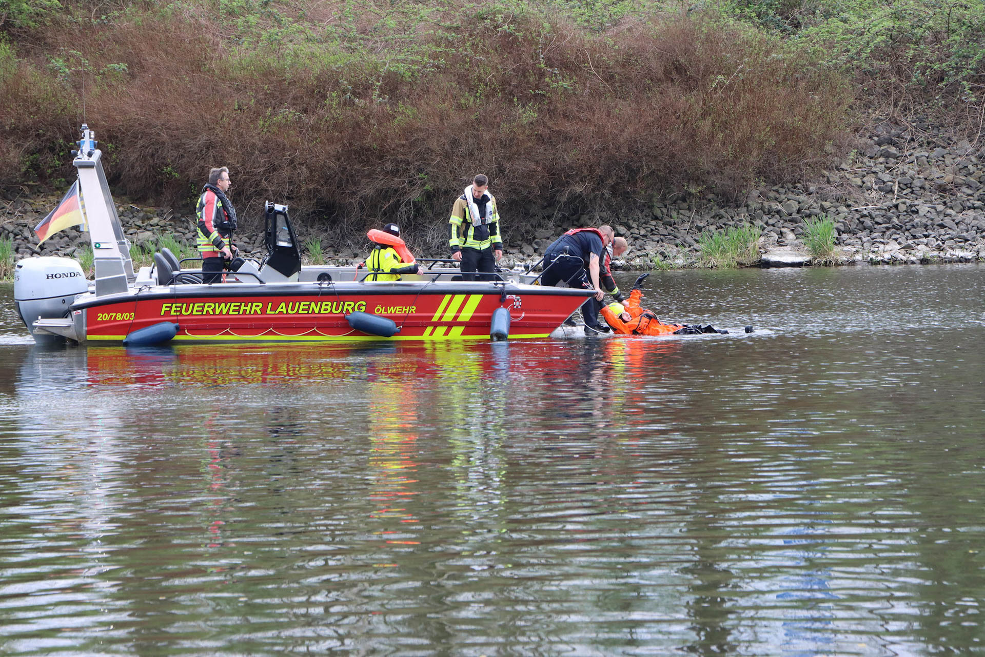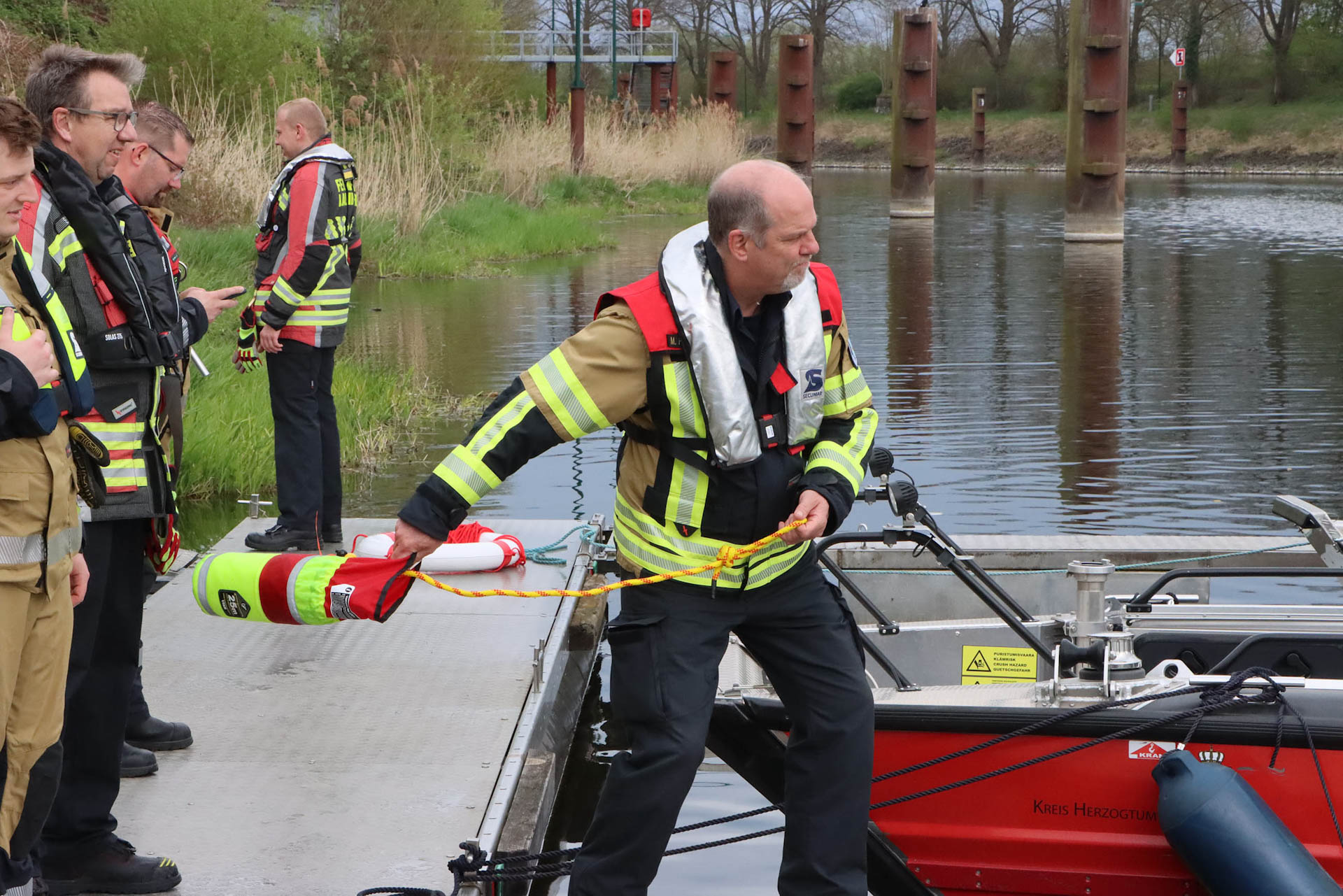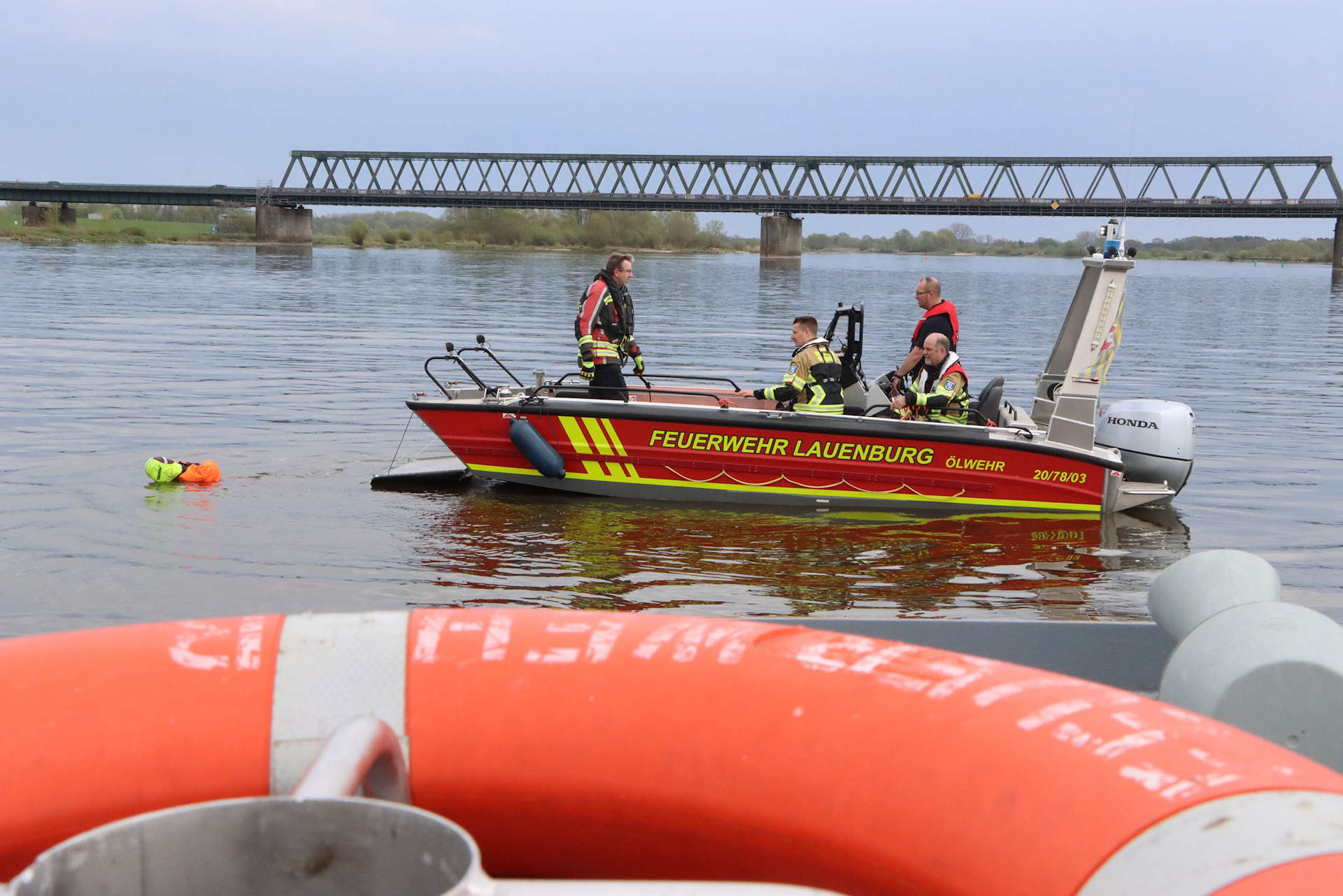 Am Samstag fand in Lauenburg am K-Zentrum ein Workshop zum Thema Gewässereinsatz statt. Durchgeführt wurde dieser durch die Hanseatische Feuerwehrunfallkasse Nord (HFUK). Als Teilnehmer waren neben der Feuerwehr Lauenburg auch Einsatzkräfte der Feuerwehren aus Geesthacht, Mölln und Hohnstorf noch dabei. Nach einem stärkendem Frühstück ging es erst einmal in den Theorieunterricht, hier gab es neben den rechtlichen Grundlagen und einer Übersicht verschiedenster Rettungsmittel viel an Wissen zum aufnehmen. Am frühen Nachmittag ging es dann für den Praxisteil aufs Wasser. Mit allen drei Booten der Feuerwehr Lauenburg wurden hier zum Beispiel verschiedene Rettungsmöglichkeiten von Personen im Wasser durchgespielt und geübt. Es war ein sehr informationsreicher und erfolgreicher Workshop. An dieser Stelle vielen Dank an die HFUK und an die Feuerwehr Hohnstorf für das Bereitstellen ihrer Wasserrettungspuppe.