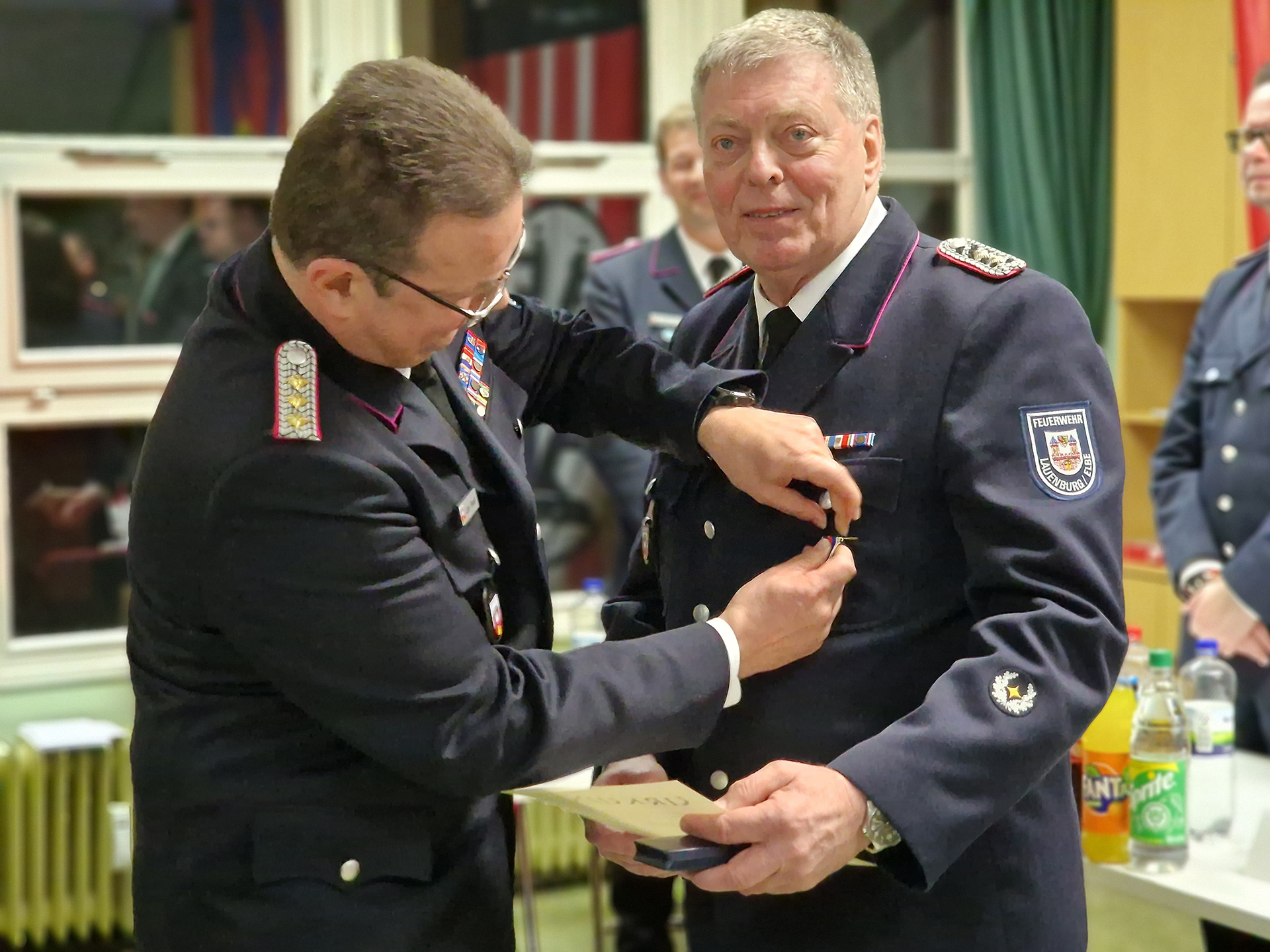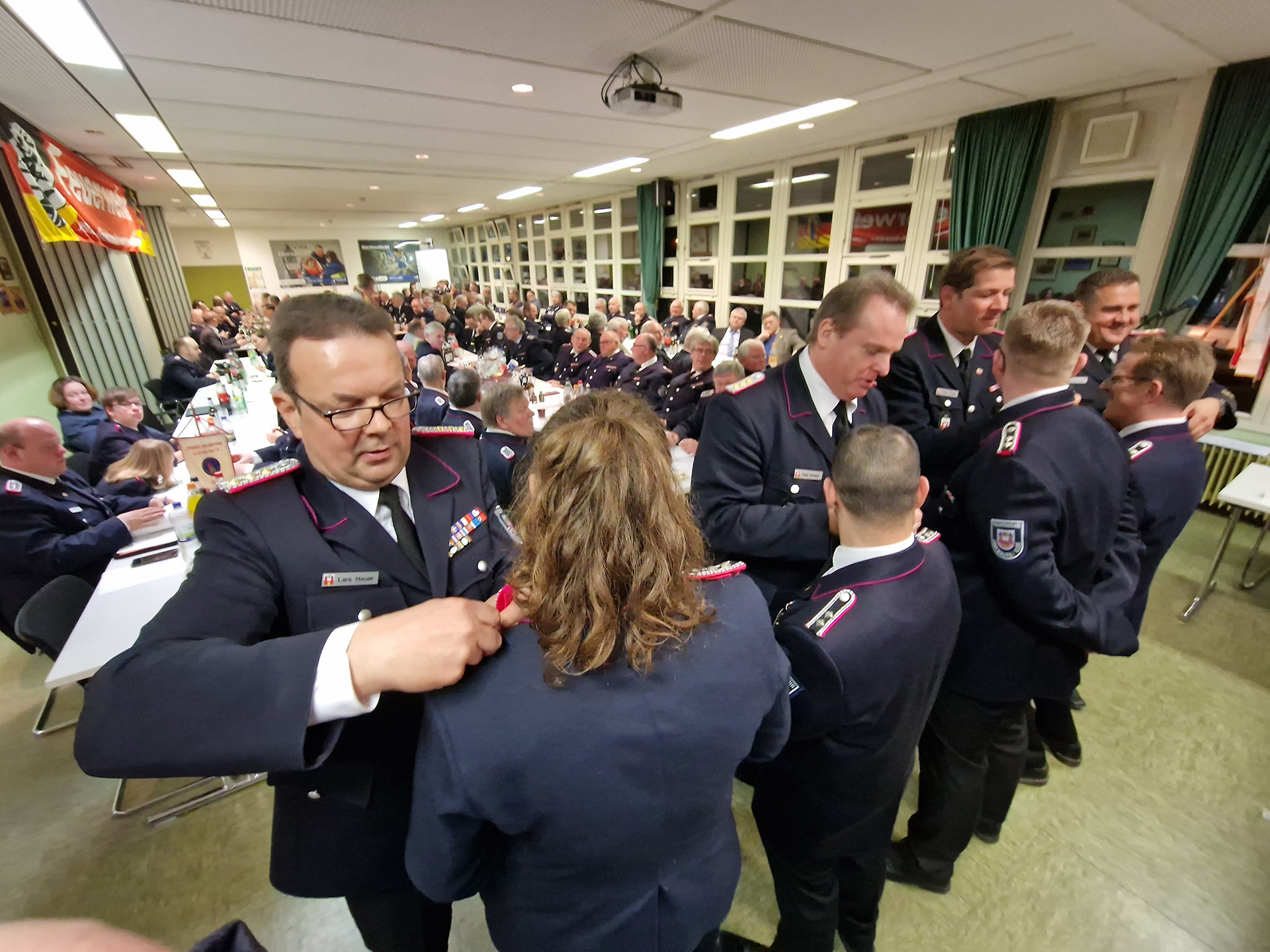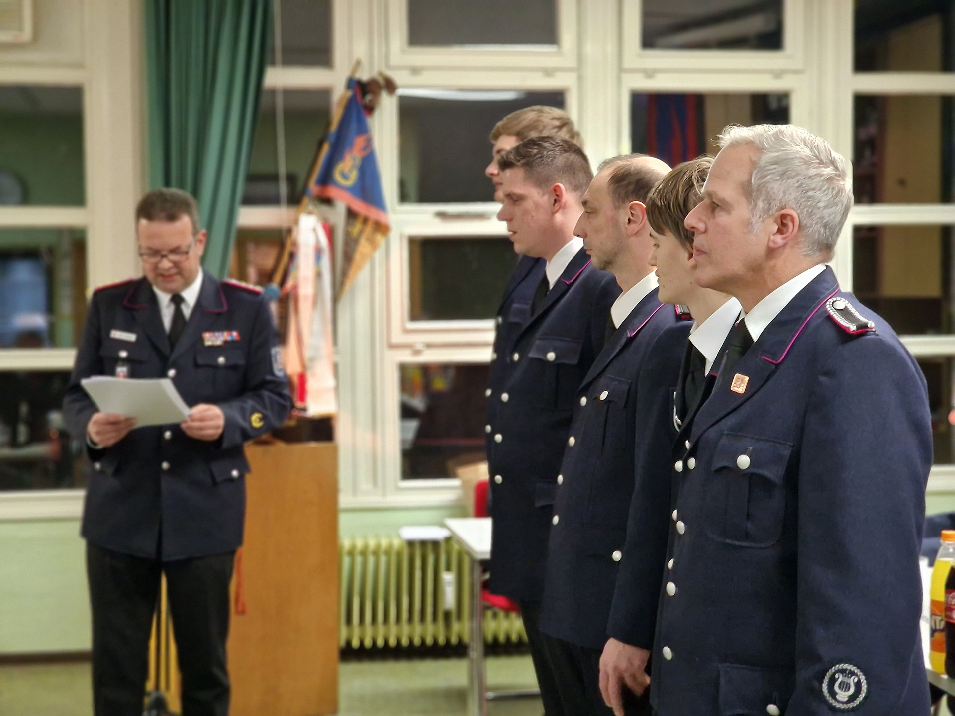 Nachdem die Versammlung des Förderverein beendet war, begrüßte Wehrführer Lars Heuer neben den Mitgliedern seiner Wehr auch die zahlreich erschienen Gäste aus Politik und befreundeten Feuerwehren und Vereinen. Ganz besonders erwähnte er Bürgermeister Andreas Thiede, der dieses Jahr zum letzten mal als Bürgermeister an der Versammlung teilgenommen hat. „Andreas hat die Feuerwehren in den Letzten Jahren maßgeblich mit geprägt und einen großen Investitionsstau trotz klammer Stadtkassen aufgeholt“ erklärt Heuer in seinem Bericht. „Erst kürzlich wurde feierlich das neue LF 10 an die Wehr übergeben. Ein großer Zuwachs an Sicherheit für die Bürgerinnen und Bürger in unserer Stadt“ so Heuer. Doch über einen Punkt reden wir seit Jahren, die Baumaßnahmen am Katastrophenschutzzentrum. Noch immer sind maßgebliche Punkte offen. Von dem Plan im Jahr 2023 mit den Umbauarbeiten zu beginnen ist man weit entfernt. Im Anschluss übernahm Bürgermeister Thiede das Wort. In seinen Grußworten dankte er allen Mitgliedern der Wehr für die hervorragende Arbeit während seiner gesamten Dienstzeit. Es begann mit einem großen Hochwasser, bei dem er den unermüdlichen Einsatz der Mitglieder kennenlernte. Mehrere Großbrände, welche das Stadtbild geprägt haben, gab es in seiner Amtszeit und wie vom Wehrführer angesprochen auch einen großen Investitionsstau, welcher nicht nur die Feuerwehr betrifft. Auch bei den Lauenburger Schulen sind große Summen notwendig, um den Betrieb aufrecht zu erhalten. Jedoch hält die Stadt an einem Masterplan für das K-Zentrum fest, mit welchem die dringlichsten Mängel schnellstmöglich abgestellt werden sollen. Nachfolger von Bürgermeister Thiede wird Thorben Brackmann. Der Junge Lauenburger übernimmt ab 1. April das Amt und verfolgte die Versammlung gespannt. Auch die Vertreter der Politik dankten den Einsatzkräften für ihren großartigen Einsatz. Ob in der Silvesternacht oder zu anderer Stunde, die Lauenburger Wehr ist stets zur Stelle. Die Bedarfe der Feuerwehr sind der Politik bekannt und werden in den entsprechenden Gremien mit Hochdruck behandelt versichern die Mitglieder der verschiedenen Parteien. Nachdem die Jugendabteilungen über ihr vergangenes Jahr berichtet hatte ging es nach einem Bericht über die Finanzen zu den anstehenden Wahlen. Nachdem Ralf Eckhoff alters bedingt in die Ehrenabteilung überführt werden musste, stand das Amt des Gruppenführer 5. Gruppe zur Wahl. Einstimmig wählte die Wehr Uwe Bahr zum neuen Gruppenführer. Anschließend stand die Wahl des Jugendwart an, Thomas Hampicke stand zur Wiederwahl und wurde von der Mehrheit der Versammlung für weitere 6 Jahre gewählt. Neu im Vorstand der Wehr ist nun Tarik Heins als Kassenwart. Er wurde ebenfalls einstimmig gewählt. Schließlich wurden die Mitglieder, welche im vergangenen Jahr erfolgreich ihre Anwärterausbildung abgelegt haben in die Feuerwehr aufgenommen und zu Feuerwehrmännern bzw. Feuerwehrfrauen befördert.