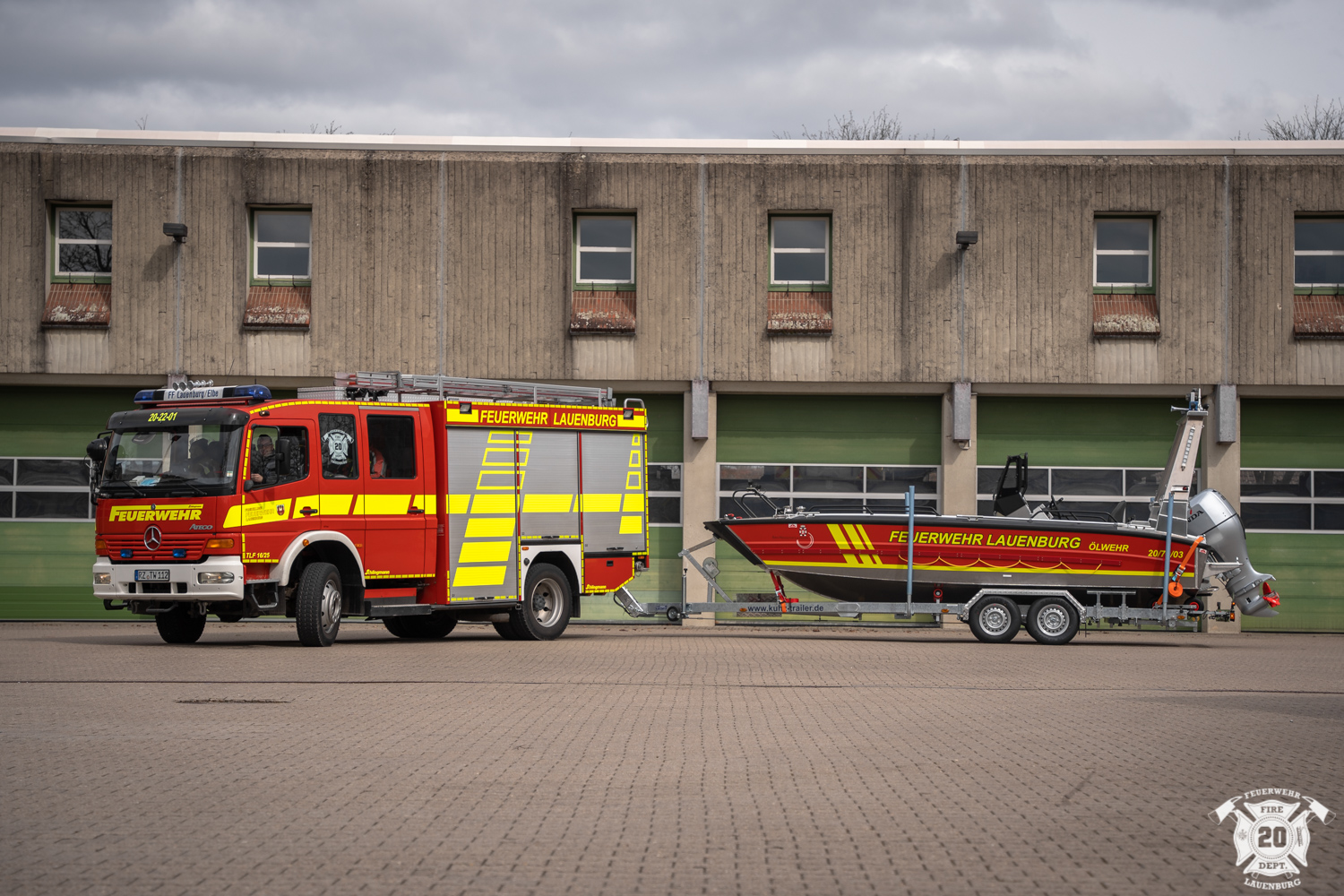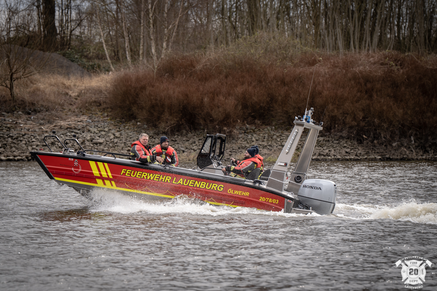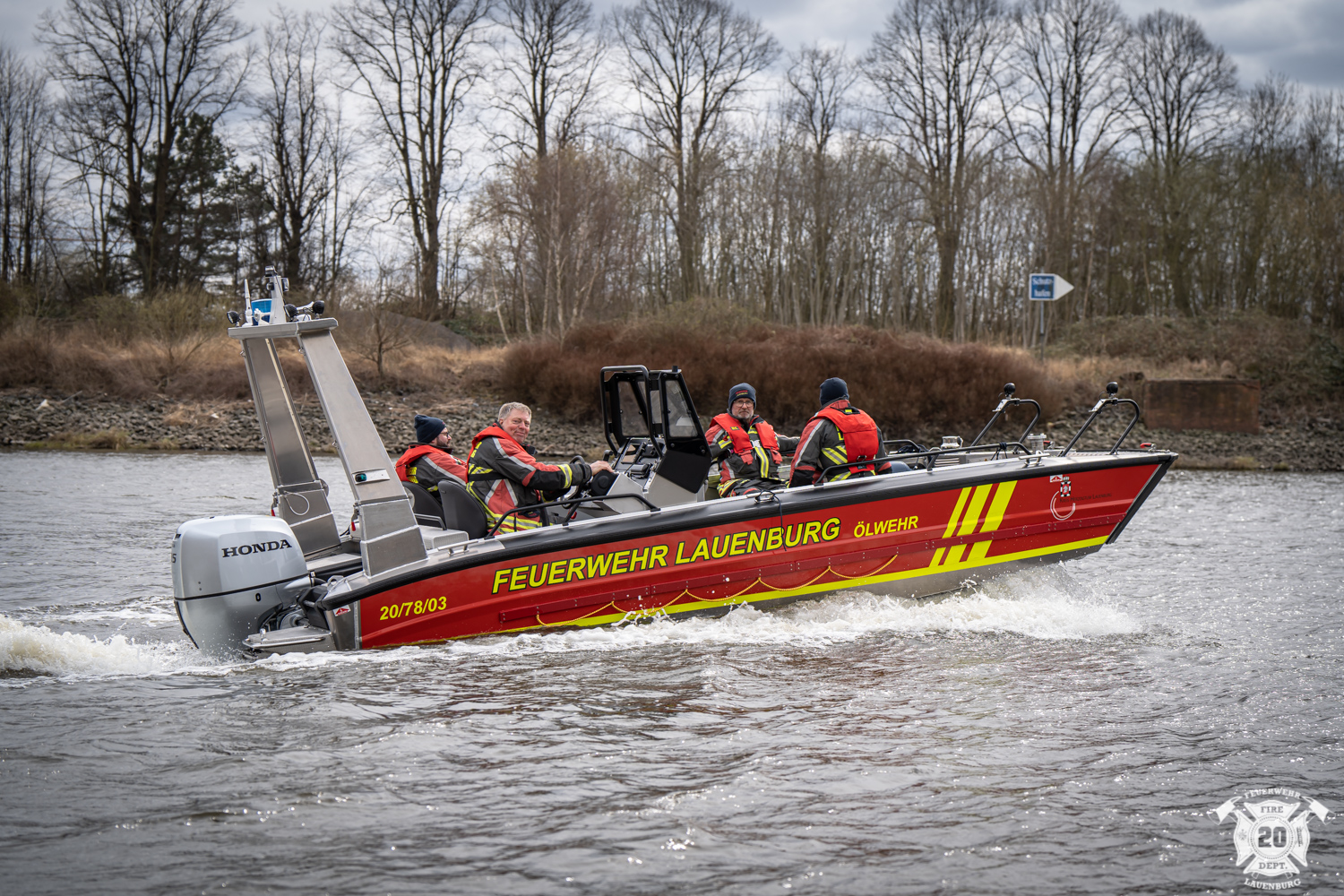 Während viele Feuerwehren ihren Aprilscherz veröffentlichen, rollte in Lauenburg ein neues Einsatzmittel auf den Hof. Die Firma „Faster Workboats“ vom Standort in Rostock hatte das neue Ölwehr Boot des Kreises Herzogtum Lauenburg angeliefert. Offiziell wird das neue Boot am 12. April übergeben und in Dienst gestellt. Zur Einweisung durch den Hersteller waren jedoch heute schon Probe- und Einweisungsfahrten auf der Elbe notwendig. Das Mehrzweckboot ist künftig unter dem Funkrufnamen „Florian Lauenburg 20-78-03“ im Einsatz. Es wird vorrangig im Rahmen der Ölschadensbekämpfung eingesetzt. Das Fahrzeug vom Typ CAT635 ist 6,6m lang und verfügt über einen 135 PS Außenbordmotor. Durch das geringe Gewicht von nur rund 1t kann das Boot auch mit einem Kran zu Wasser gebracht werden. Besondere Merkmale sind die große Ladefläche auf der auch eine Pumpe befestigt werden kann. Über ein Wenderohr kann dann ein Löschangriff durchgeführt werden. Weiter ist das Boot mit einer Schleppvorrichtung und einer selbst holende Winsch ausgerüstet.