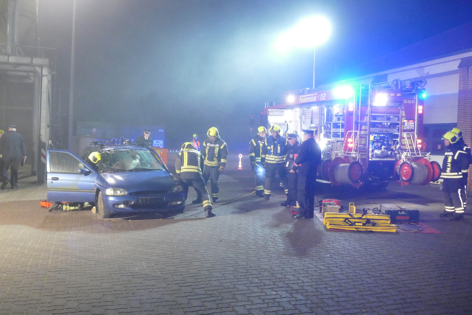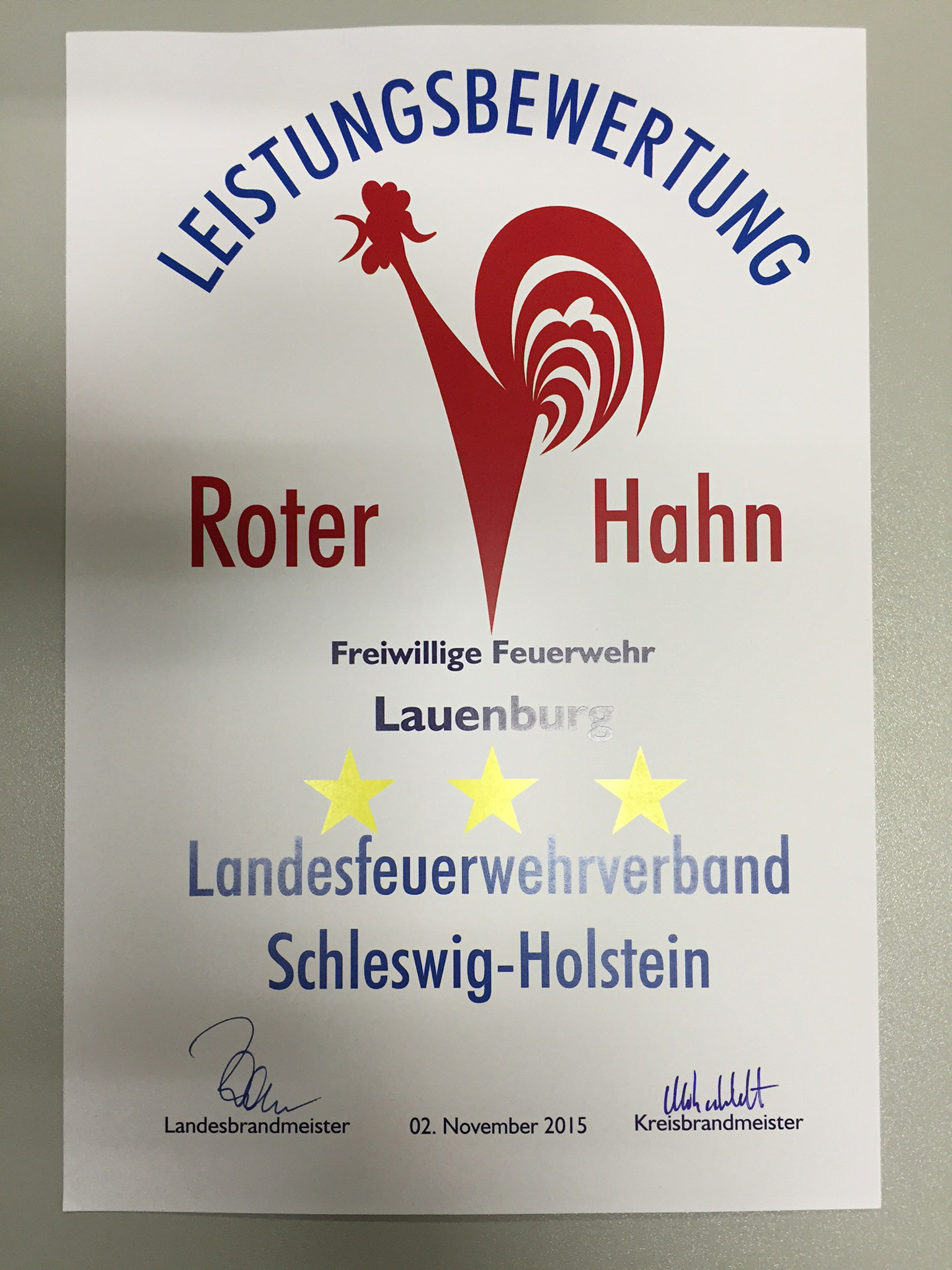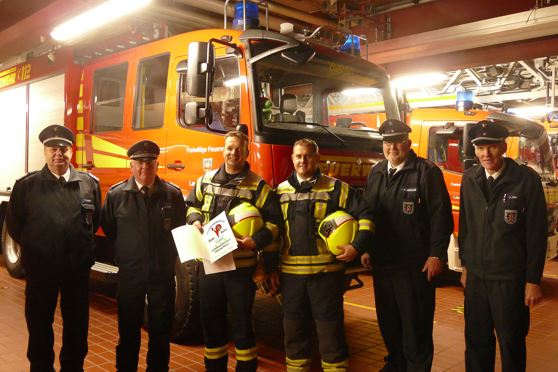 Zur Abnahme der Leistungsbewertung Roter Hahn III trat am Montagabend die Feuerwehr Lauenburg pünktlich um 19 Uhr an. In verschiedenen Einsatzlagen mussten die Aktiven ihr Können unter Beweis stellen. Beim Formaldienst marschierte die gesamte Wehr auf dem Innenhof, einheitliches Auftreten war hier gefragt. Anschließend hielt der Sicherheitsbeauftrage einen Unterricht über die Gefahren auf dem Weg zur Einsatzstelle. Schon zuhause besteht Unfallgefahr, etwa durch herumliegendes Spielzeug erklärt Thomas Jänicke. Auch der Stellvertretende Wehrführer Dennis Lühr machte in einer Präsentation auf das geruch- und farblose Kohlenmonoxid aufmerksam. Beide Unterrichte waren Bestandteil der Leistungsbewertung. Lühr erklärte wie es zur Bildung des gefährlichen Gases kommt. – Ursache ist eine unvollständige Verbrennung, etwa durch eine defekte Heizungsanlage. Im Anschluss ging es für den 2. Zug zur ersten Einsatzübung. Am Bauhof wurde ein Übungsszenario aufgebaut. „Verkehrsunfall eingeklemmte Person“ meldete Zugführer Florian Grundmann an seine Mannschaft auf HLF und LF16. Routiniert begannen die Kräfte mit der Versorgung des Dummys im Fahrzeug, bereiteten die Rettung vor. Schweres hydraulisches Gerät wurde in Stellung gebracht und die Einsatzstelle ausgeleuchtet. Wenig später begann der Wassertrupp mit der Befreiung der Person. In mehreren Schritten wurden zunächst die Türen des PKW entfernt, bis schließlich das Dach abgetrennt wurde. Mit einem Spineboard wurde der Verunfallte gerettet. Während der Rettung waren zwei Rettungsassistenten mit der Versorgung der Person beschäftigt, betreuten sie wie es auch im Ernstfall geschehen würde. Im Anschluss bereitete sich der 1. Zug vor. Am Lütten Markt war eine unklare Rauchentwicklung aus einem Geschäftsgebäude gemeldet worden. Von zwei Seiten wurden Löschfahrzeuge in Stellung gebracht. In Windeseile brachten die Mannschaften Verteiler und Schläuche in Stellung. Der Angriffstrupp ging unter Atemschutz in das Gebäude vor. Das 30m Schlauchpaket wurde vor dem Eingang in Stellung gebracht. Der extra lange C-Schlauch verhindert ein verhaken zum Beispiel an Möbelstücken im Gebäude. Währenddessen stand bereits ein zweiter Trupp vor dem Gebäude bereit. – Der Sicherungstrupp kann im Notfall eingreifen, sorgt für die Sicherheit des im Einsatz befindlichen Atemschutztrupps oder unterstützt bei der Rettung einer Person. Nach kurzer Zeit wurde „Feuer aus“ gemeldet. Nach dem Einsatz wurde das Gebäude belüftet, um die Verqualmung zu beseitigen. Zurück an der Feuerwache ging es an die Auswertung. Vor der angetretenen Wehr überbrachte Andreas Knoop, Leiter der Bewertungskommission die freudige Botschaft. Die Feuerwehr Lauenburg hat mit Bravur die III Stufe erreicht. Alle Mitglieder der Kommission waren mit dem ruhigen und sicheren Auftreten von Mannschaft und Führung sehr zufrieden. Kritikpunkte gab es keine, das machte auch Wehrführer Heuer sichtlich stolz. Gegen kurz nach 23 Uhr übergab Thorsten Möller, Stellvertretender Kreiswehrführer dann die Urkunde und somit den dritten Stern.