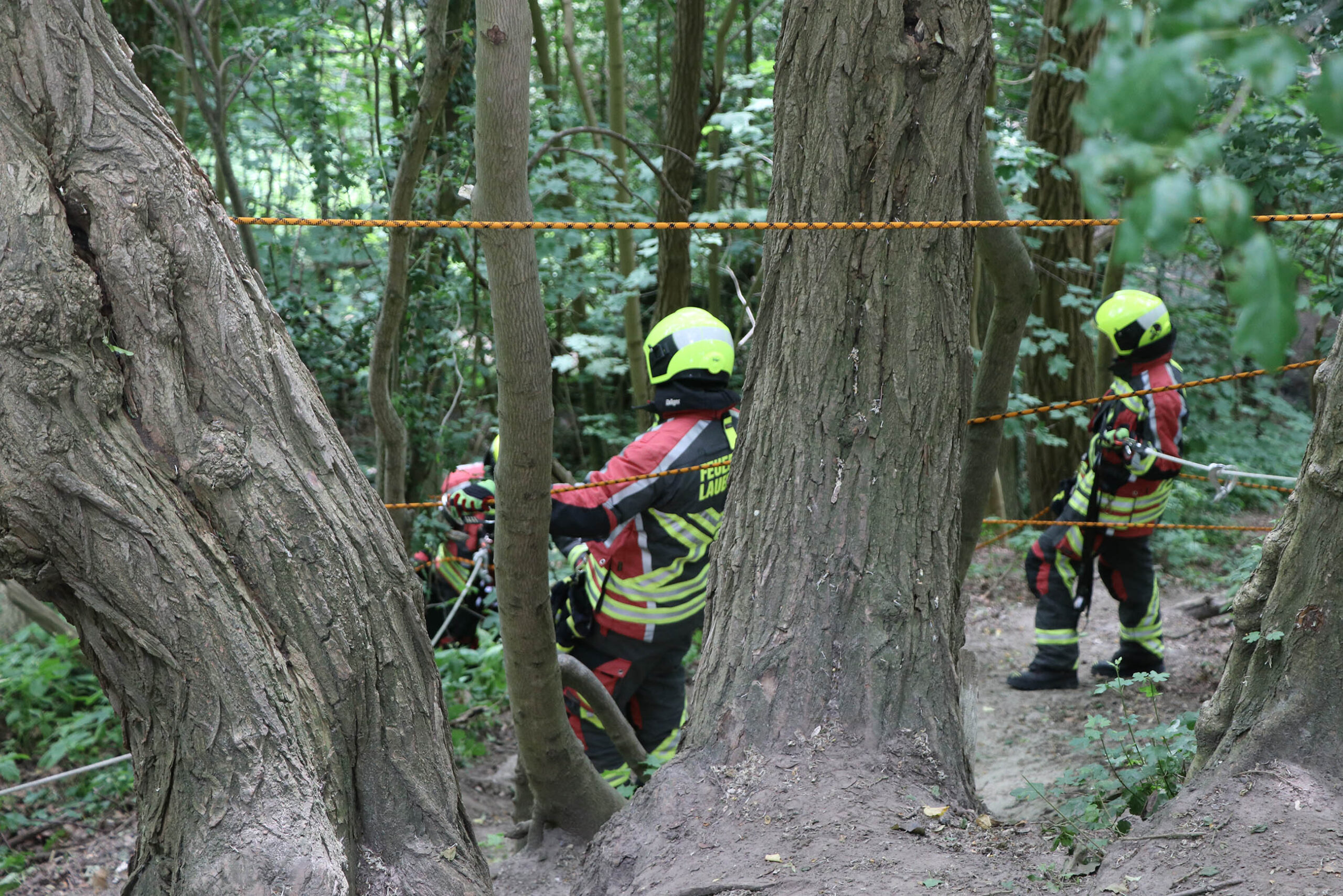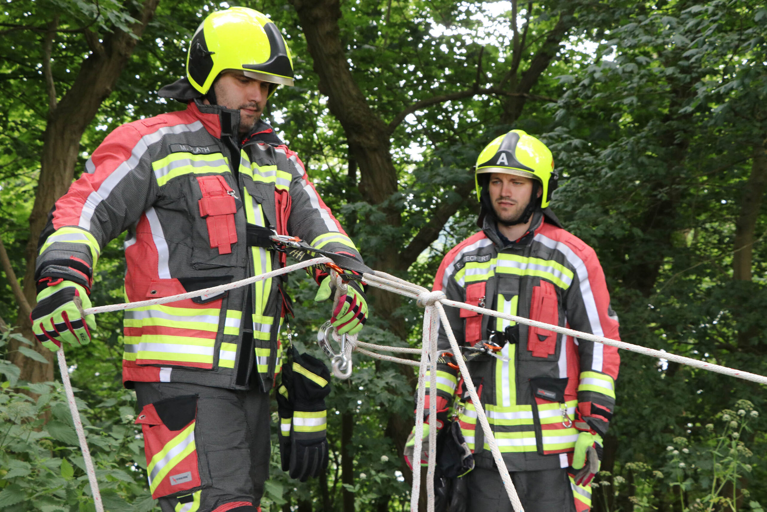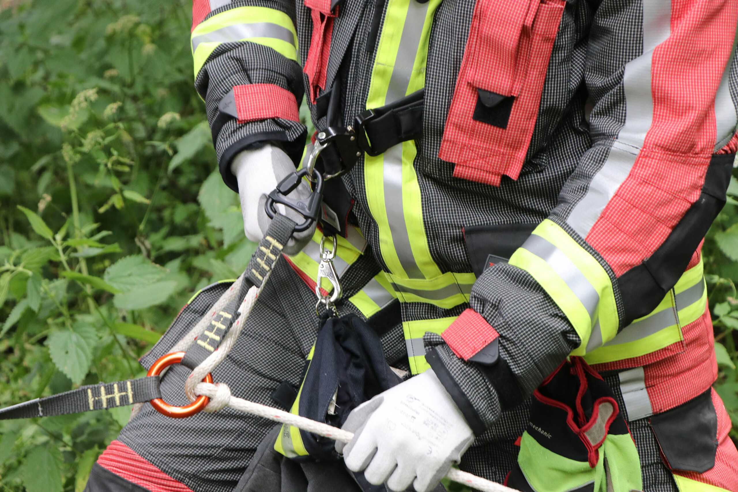 Um den Einsatzwert unserer neuen Schutzkleidung vollumfänglich zu nutzen, wurden Ende Juni 15 Multiplikatoren ausgebildet. Der neue Anzug, welchen die Feuerwehr im Frühjahr erhalten hat, schützt die Retter vor Flammen, Wetter Einflüssen und mechanischen Einwirkungen. Doch im Inneren verbirgt sich noch mehr. Eine Gurtsystem welches in der Jacke integriert ist, kann zum Beispiel zur Selbstrettung oder Standplatzsicherung in absturzgefährdeten Bereichen genutzt werden. Eigens dafür reiste Ausbilder Wolfgang Werft von Red-Line Solution an. Am Freitag stand Theorie auf dem Stundenplan, Werft, selbst Berufsfeuerwehrmann in Nürnberg erklärte den Teilnehmern, worauf es bei dem „IRS“ ankommt. Welche Möglichkeiten und Grenzen es dabei gibt. Auch Björn Baumann von Firma Texport war vor Ort und erklärte wie das System in die Jacke eingezogen und wieder entfernt wird. Am Samstagmorgen ging es dann in die Praxis. Die 15 Teilnehmer sollen schließlich künftig allen anderen Mitgliedern der Wehr den sicheren Umgang mit dem System nahebringen. So wurde die Handhabung im Einsatz trainiert. Anschließend wurde Vertrauen in das System aufgebaut. Auf einer Steckleiter sicherten sich die Teilnehmer und lehnten sich freihändig in das Gurtsystem. „Da muss man schon Vertrauen haben“ sagt Feuerwehrfrau Julia Bollhorn. Weiter ging es bei der Station selbstretten. Zusätzlich gesichert mit einem Sitzgurt ließen sich die Teilnehmer von der Drehleiter aus ab. Schließlich standen am Nachmittag noch praktische Einsatzszenarien wie sich uns schon öfter erreicht haben auf dem Stundenplan. Am Elbhang nahe der Jugendherberge mussten Einsatzkräfte sicher den Hang hinabsteigen. Ausbilder Wolfgang Werft hatte dafür verschiedene Möglichkeiten vorbereitet. Zunächst übten die Teilnehmer einzelne Kräfte abzulassen. Das wäre denkbar, wenn schnell 2 Retter zu einem verunfallten gelangen müssen. Doch auch um viele Einsatzkräfte gleichzeitig ins Gelände zu schicken, gibt es Möglichkeiten. So spannten 3 gesicherte Einsatzkräfte ein 60m langes Seil im Zick-Zack den Hang hinunter. Später konnten sich die Kräfte mit einem Bandschlingen-Knoten sichern und den Hang hinabsteigen. Bei einer Nachbesprechung überreichte Ausbilder Werft die Lehrgangszertifikate und Lektüren zur Ausbildung.