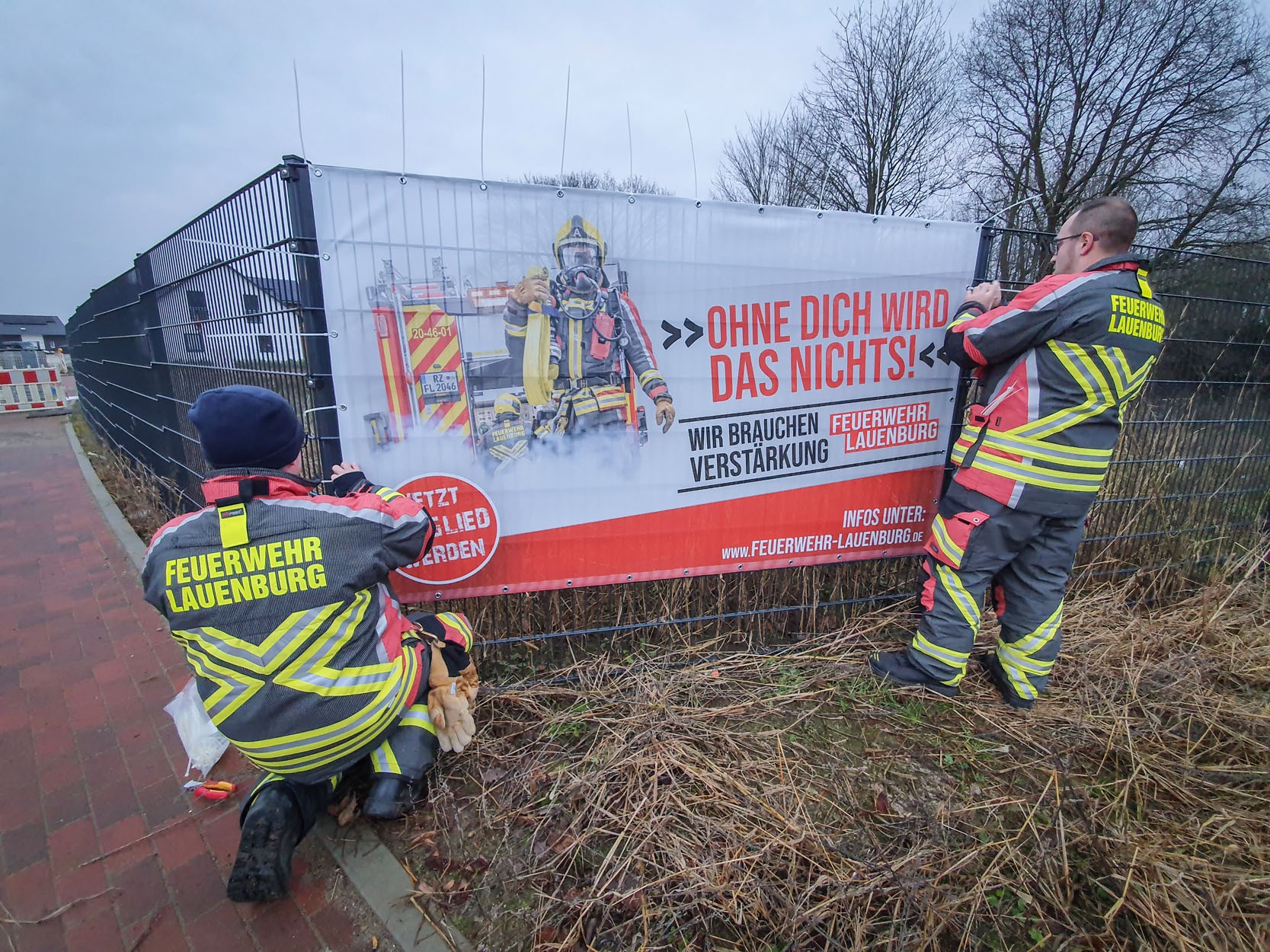 Mit diesem Motto wirbt die Lauenburger Feuerwehr um neue Mitglieder. Seit Mittwoch begrüßt die Anwohner des Neubaugebiet Birnbaumkamp das Banner an der Einfahrt. „Gezielt möchten wir die neuen Bürgerinnen und Bürger ansprechen“ sagt Wehrführer Lars Heuer. „Viele sind aus Großstädten zugezogen und haben sich noch nie mit dem Thema freiwillige Feuerwehr auseinandergesetzt“ so Heuer weiter. Denn anders als z.B. in Hamburg, Lübeck oder Kiel wird hier der Brandschutz vollständig ehrenamtlich sichergestellt. Das heißt freiwillige kommen neben der Arbeit, Familie oder Freizeit zum Einsatz, wenn sie gebraucht werden. Jan Ole Klose und Timo Naujoks platzierten den Banner am Mittwochabend, zogen damit schon einige Blicke an. „Wir freuen uns auf neue Mitstreiter in unseren Reihen“ erklärt Timo Naujoks, der für die Fahrerausbildung in der Wehr verantwortlich ist. „Auch Frauen sind bei uns herzlich willkommen“ unterstreicht Jan Ole Klose.