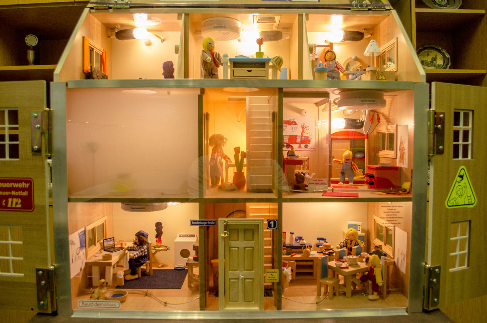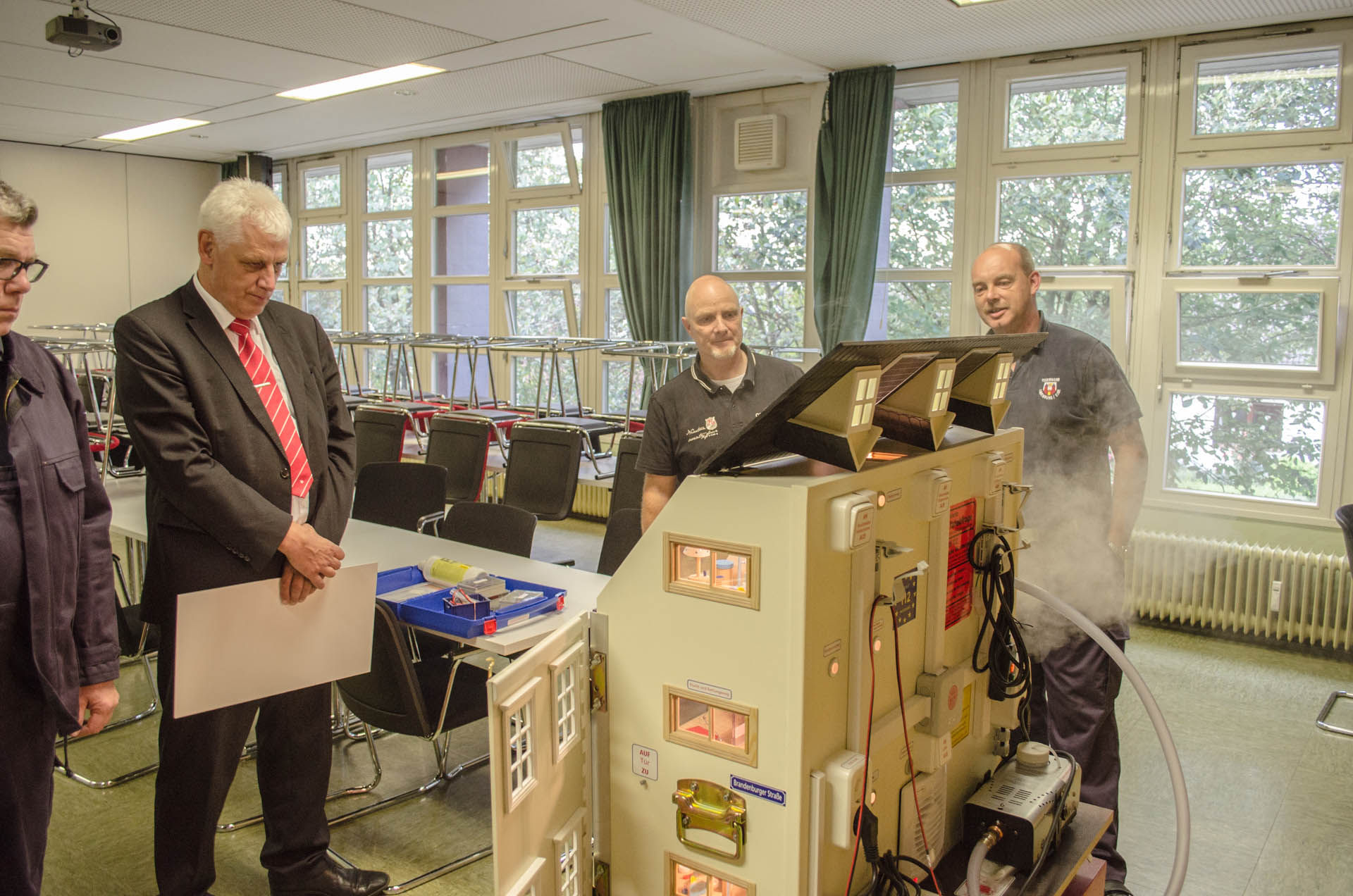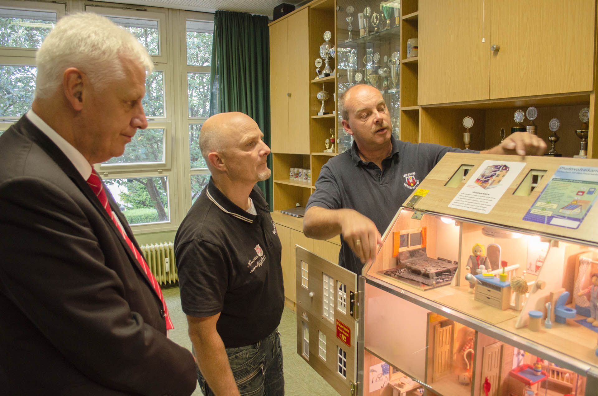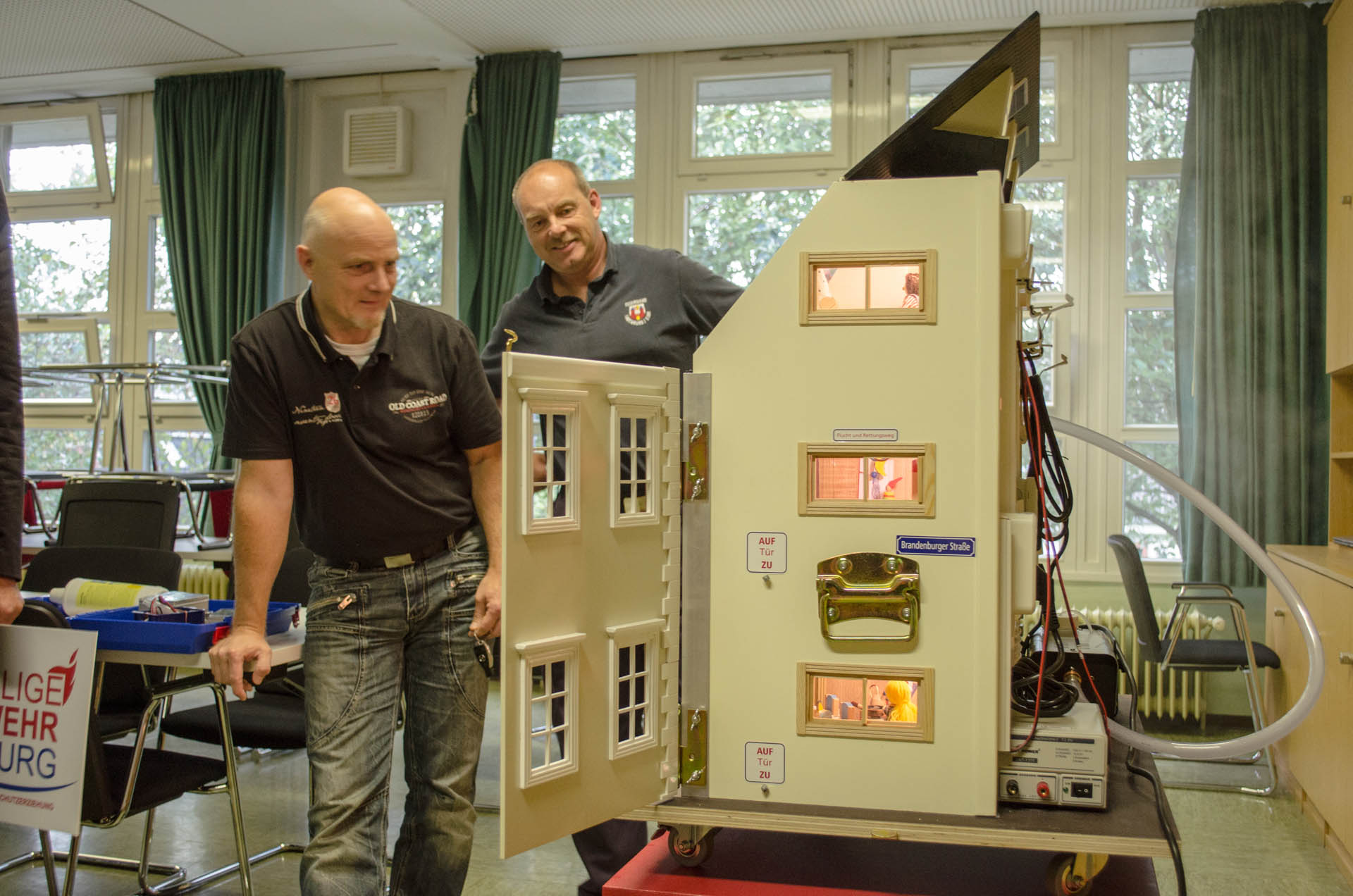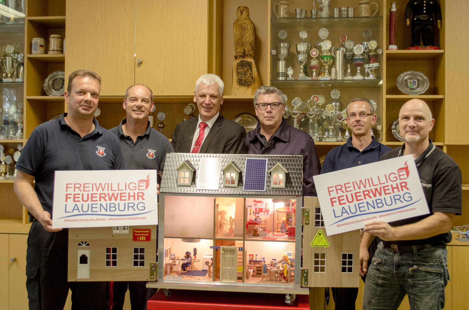 Was passiert bei einem Feuer? Wie verhalte ich mich richtig? Was muss ich machen? All dies sind Fragen, welche die Brandschutzerzieher Dirk Bollhorn und Andreas Rogge bei ihren Besuchen in Schulen und Kindergärten beantworten. Die Feuerwehrmänner sind Lauenburgs Brandschutzerzieher und vielen Kindern bereits bekannt. „In der Regel besuchen wir die Schulen in der 3. Klasse, dann wird im Unterricht das Thema besprochen und von uns noch einmal vertieft“, erklärt Bollhorn. „An der Feuerwache kommen uns die Klassen der Grundschulen dann auch mal besuchen“, so Andreas Rogge, Stv. Zugführer in der Feuerwehr Lauenburg. „Der Kontakt mit den Feuerwehrleuten nimmt die Angst. „Das unheimliche Atemgeräusch des Pressluftatmers, welcher bei einem Feuer von uns getragen werden muss, soll die Kinder nicht verängstigen; das machen wir deutlich, wenn Dirk die Montur vor den Kindern anlegt“, erklärt Andreas Rogge. Nun wurden die Möglichkeiten für die Brandschutzerziehung und Brandschutzaufklärung noch einmal deutlich erhöht. Stolz berichtet Dirk Bollhorn über das neue Rauchhaus. Ein Mehrfamilienhaus, welches im ersten Moment an ein Puppenhaus erinnert. Treppenhaus, Schlafzimmer, Wohnzimmer und Büro. Doch überall sind Gefahrenquellen versteckt, welche zu einem simulierten Brandausbruch führen können. „Etwa eine zugedeckte Lampe im Schlafzimmer. Wird diese zu heiß, entzündet sich die Lampe von selbst“, erklärt der Brandschutzerzieher. Das Rauchdemohaus kommt von der Firma Bals in Süddeutschland, diese hat sich auf die Anfertigung solcher Häuser spezialisiert. Kleine Nebelmaschinen im Inneren verdeutlichen den Kindern, wie sich der Rauch ausbreitet, wie geschlossene Türen vor dem giftigen Rauch schützen und was Rauchmelder bewirken können. Auch für die Einsatzabteilung ist dieses Rauchdemohaus sinnvoll, erklärt Wehrführer Lars Heuer. Mit kleinen Lüftern kann die Entrauchung und taktische Belüftung eines Hauses simuliert werden, ohne gleich ein echtes Wohnhaus mit Kunstnebel zu verdunkeln. „Mit Rauchvorhängen, wie wir sie auf unseren Löschfahrzeugen mitführen, können wir zum Beispiel den Flur in einem Mehrfamilienhaus rauchfrei halten“, erklärt Wehrführer Heuer. „Mit Klettverschluss lassen sich im Rauchdemohaus Mini-Rauchvorhänge an den Türen anbringen, in Verbindung mit den Mini-Lüftern lässt sich so realitätsnah simulieren.“ „Möglich wurde die Anschaffung des Rauchdemohauses nur durch Spenden“, erklärt Thomas Burmester, Vorsitzender des Fördervereines der Feuerwehr Lauenburg. Die Kreissparkasse Lauenburg sowie das Steuerbüro Maurer leisteten einen erheblichen Beitrag für die Finanzierung des insgesamt rund 2800€ teuren Demohauses. Auch aus Mitteln des Fördervereines wurde das Rauchhaus bezuschusst. Künftig können die Brandschutzerzieher dank der Hilfe der Sponsoren mit modernsten Mitteln die Kinder unterrichten. Auch an dieser Stelle noch einmal vielen Dank für die Unterstützung.