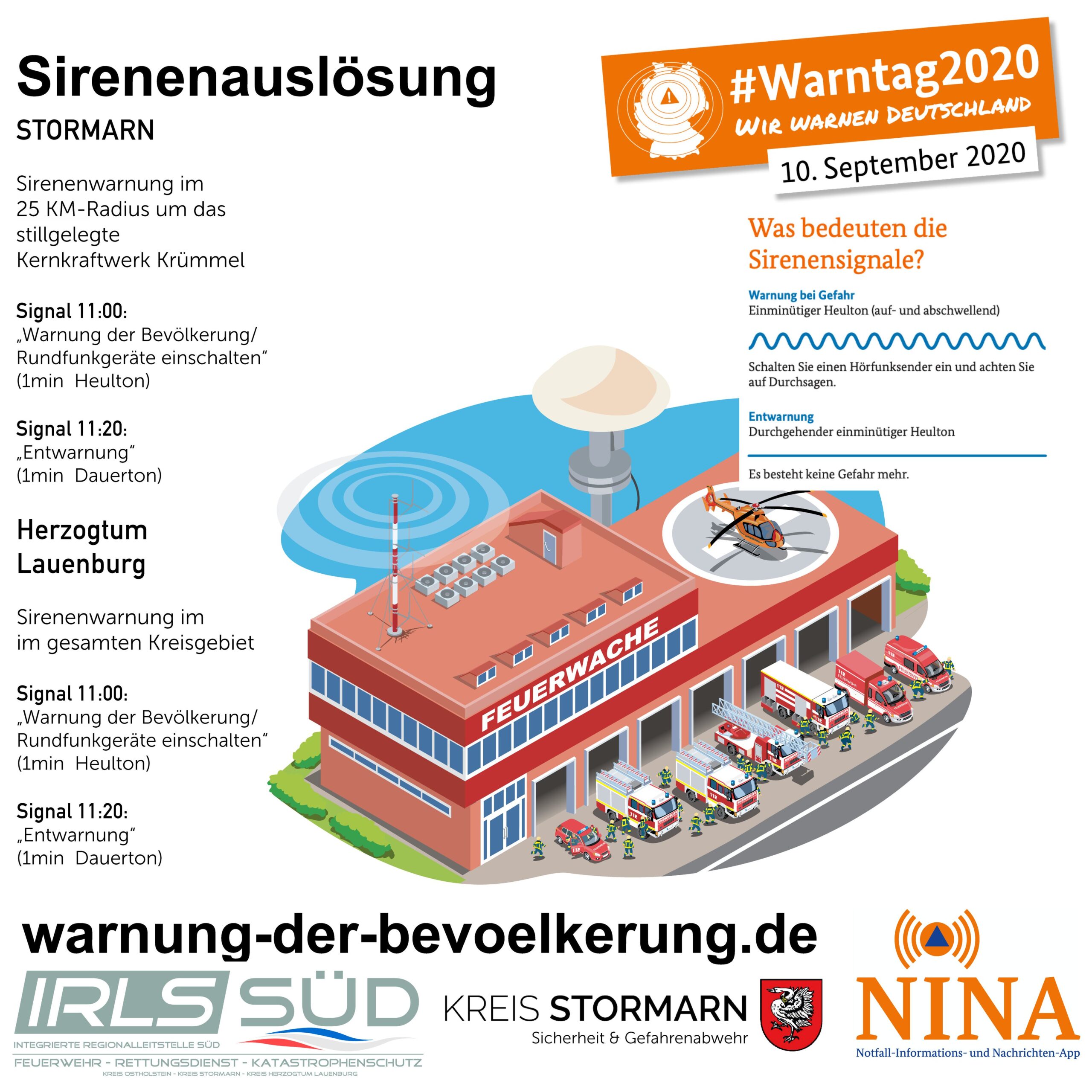 Am Donnerstag den 10. September werden Bundesweit Sirenen getestet. In unserer Region ist das Geräusch nicht gänzlich unbekannt. Einige Feuerwehren werden noch immer über die Sirene zum Einsatz alarmiert. Dennoch sorgt es immer wieder für Aufregung und unnötige Nachfragen beim Notruf 112. In einem Radius von 25 Kilometer rund um das Kernkraftwerk werden gegen 11 Uhr die Sirenen mit einem 1 Minute auf und abschwellenden Heulton laut geben. Das Signal bedeutet: „Rundfunkgeräte (gemeint ist das Radio) einschalten und auf Durchsagen achten.) Etwa 20 Minuten später folgt ein 1 Minute andauernder Ton, dieser bedeutet: Entwarnung. Sie brauchen nichts weiter zu tun und vor allem keine Angst haben, da es sich um einen geplanten Probelauf handelt. Informieren Sie Nachbarn, Freunde und ältere, denen möglicherweise die Anbindung an moderne Medien fehlt.