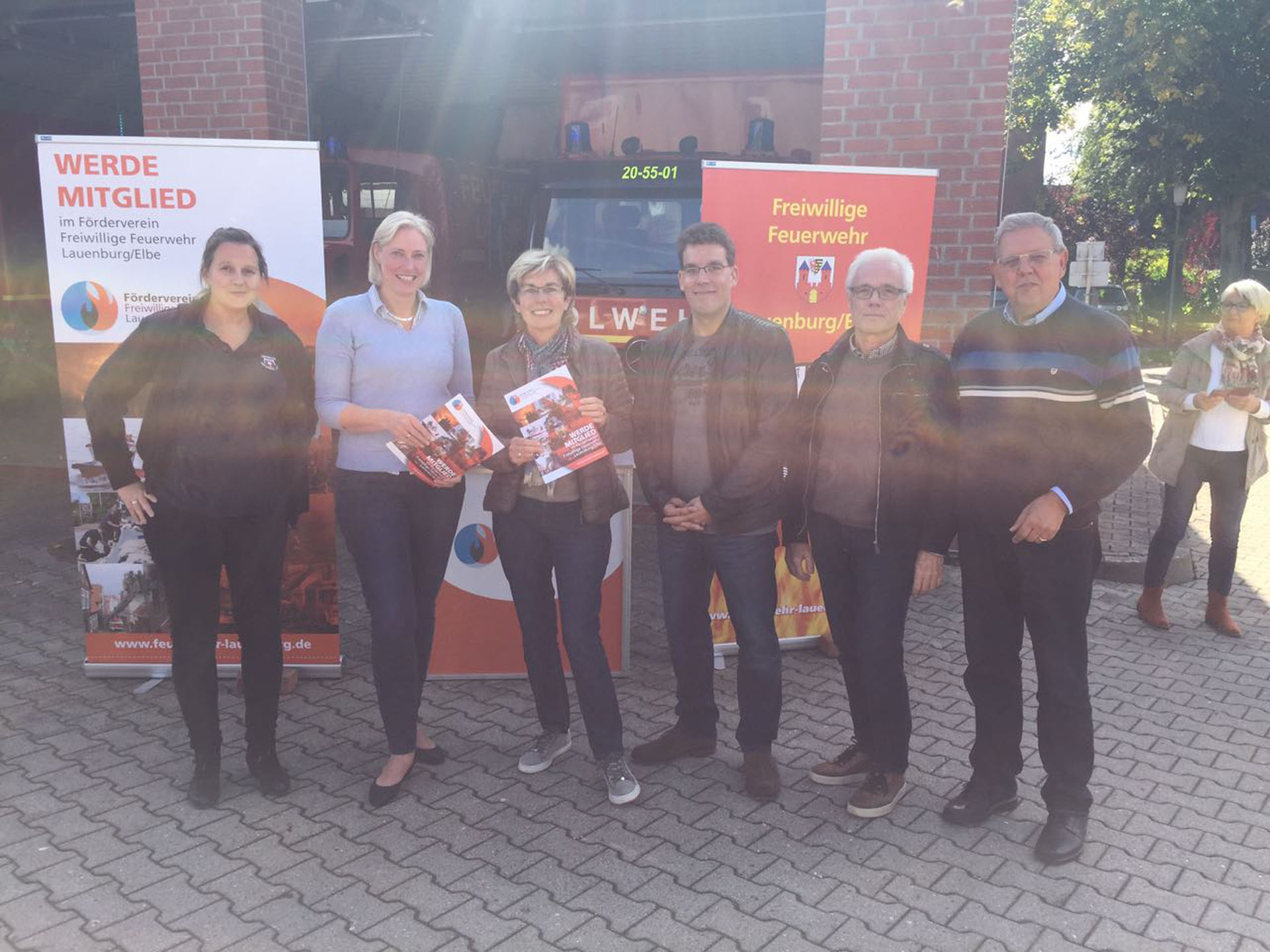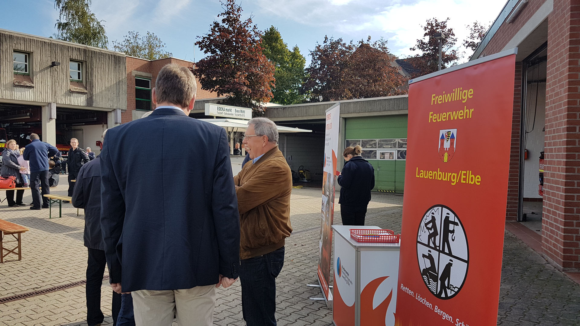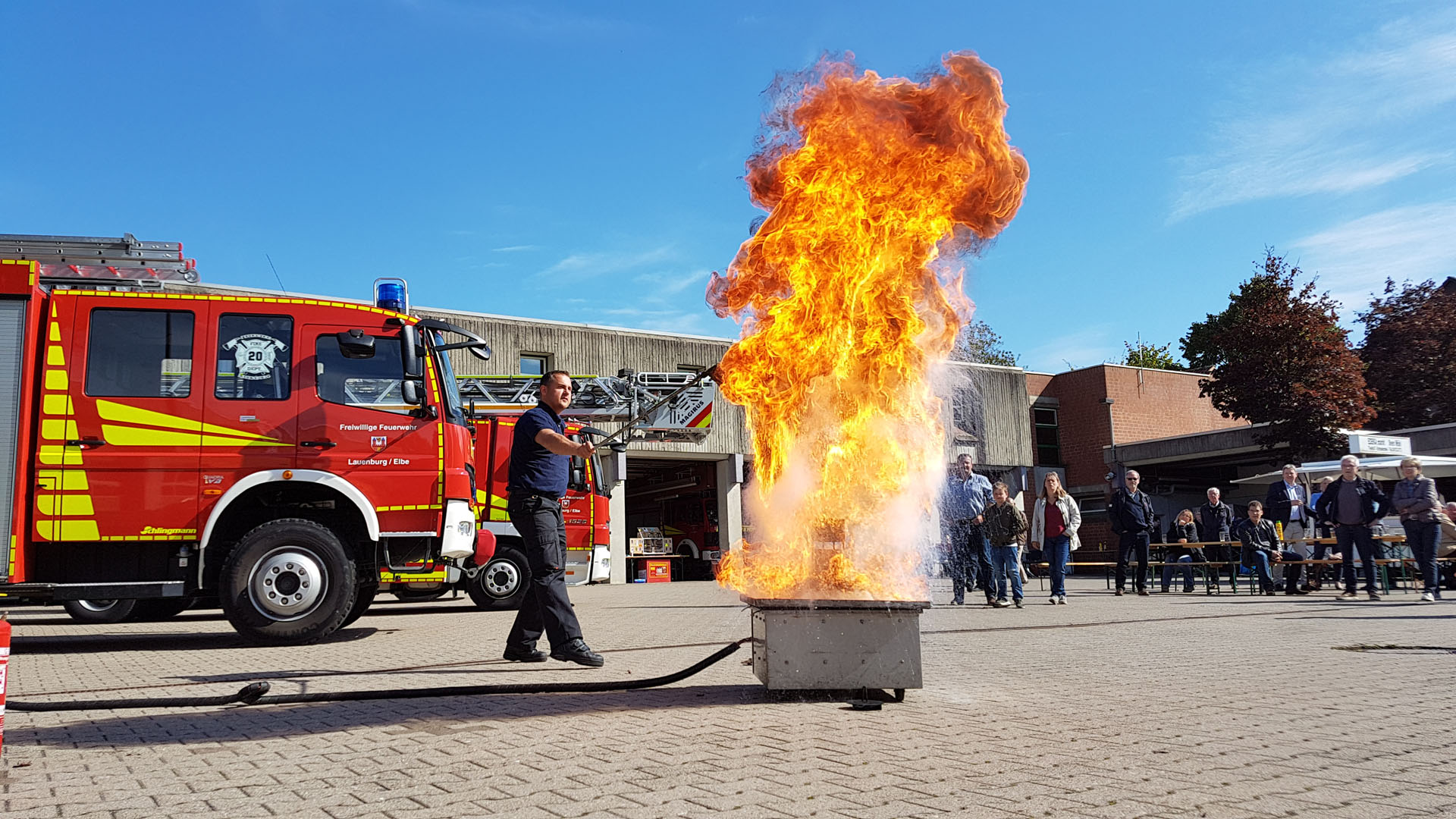 Zu einem Treffen der Förderer lud der Förderverein seine Mitglieder ein. Bei bestem Sonnenschein empfing Blasmusik des Feuerwehr-Musikzuges Lauenburg Süd die Gäste der Veranstaltung. Der Löschzug der Feuerwehr schmückte den Hof und zog die Aufmerksamkeit auf sich. Mit Dankesworten begrüßte der erste Vorsitzende Thomas Burmester die Mitglieder des Fördervereines, welcher nun schon seit vier Jahren existiert. Die Initiative hat sich zur Aufgabe gemacht, die Arbeit der freiwilligen Feuerwehrleute zu würdigen und zu unterstützen. Auch zur Freude von Wehrführer Lars Heuer steigt die Mitgliederzahl im Verein weiter an. Durch die finanziellen Mittel, welche der Verein durch die Förderer bekommt, konnte zum Beispiel ein Rauchdemohaus beschafft werden, welches bei der Brandschutzaufklärung und Brandschutzerziehung zum Einsatz kommt. Als nächstes soll ein einheitliches Outfit für die aktiven Mitglieder beschafft werden. Bestehend aus einer dünnen Bundhose und einem Hemd, welches bei Veranstaltungen ein einheitliches Bild bietet. Neben Wurst vom Grill und Getränken konnten sich die Besucher die Einsatzfahrzeuge erklären lassen, neben dem HLF und dem TLF war aber die Drehleiter der Magnet. Das imposante Fahrzeug ist wohl der Begriff, wenn es um die Feuerwehr geht, beeindruckend für Jung und Alt. Auch Vorführungen durften natürlich nicht fehlen und so wurde neben einer Fettexplosion auch die Detonation einer Haarspraydose vorgeführt. – Der Knall und die Stichflamme waren gewaltig und schreckten alle auf. Der Respekt, den man vor dieser mit Gas gefüllten Kartusche haben sollte, ist nun wohl allen Besuchern bekannt. Doch auch selbst durften die Mitglieder Hand anlegen, ein brennender Papierkorb musste fachgerecht gelöscht werden. Dabei gab es Instruktionen vom stellv. Wehrführer und Ausbilder Dennis Lühr. Mit dem Feuerlöscher konnten die Flammen schnell und gezielt eingedämmt werden. Bei strahlendem Sonnenschein klang der Vormittag langsam aus. Wir danken allen Besuchern und darüber hinaus allen Mitgliedern des Fördervereins für ihre Unterstützung!