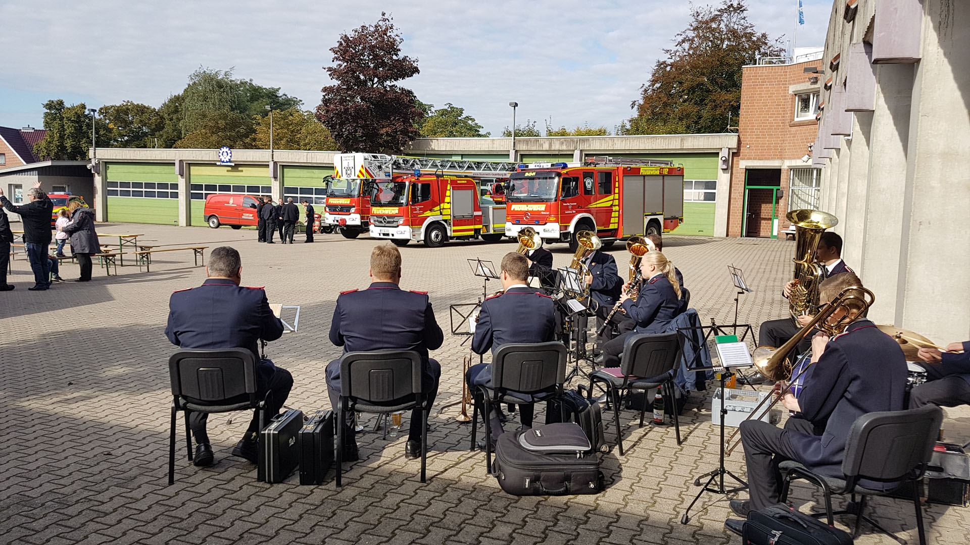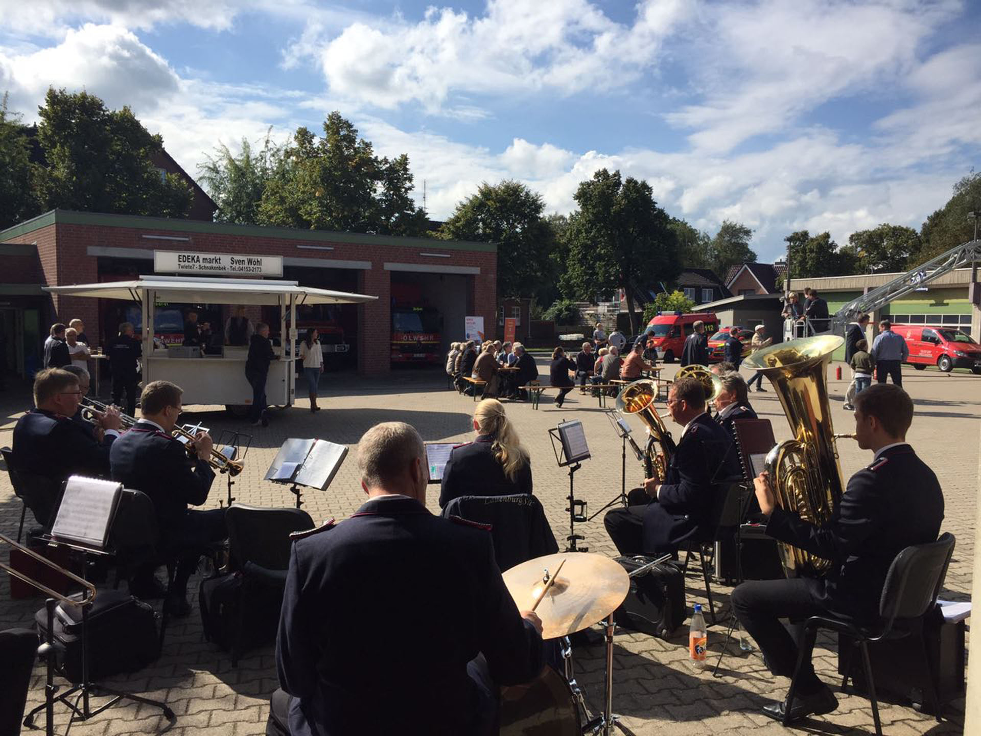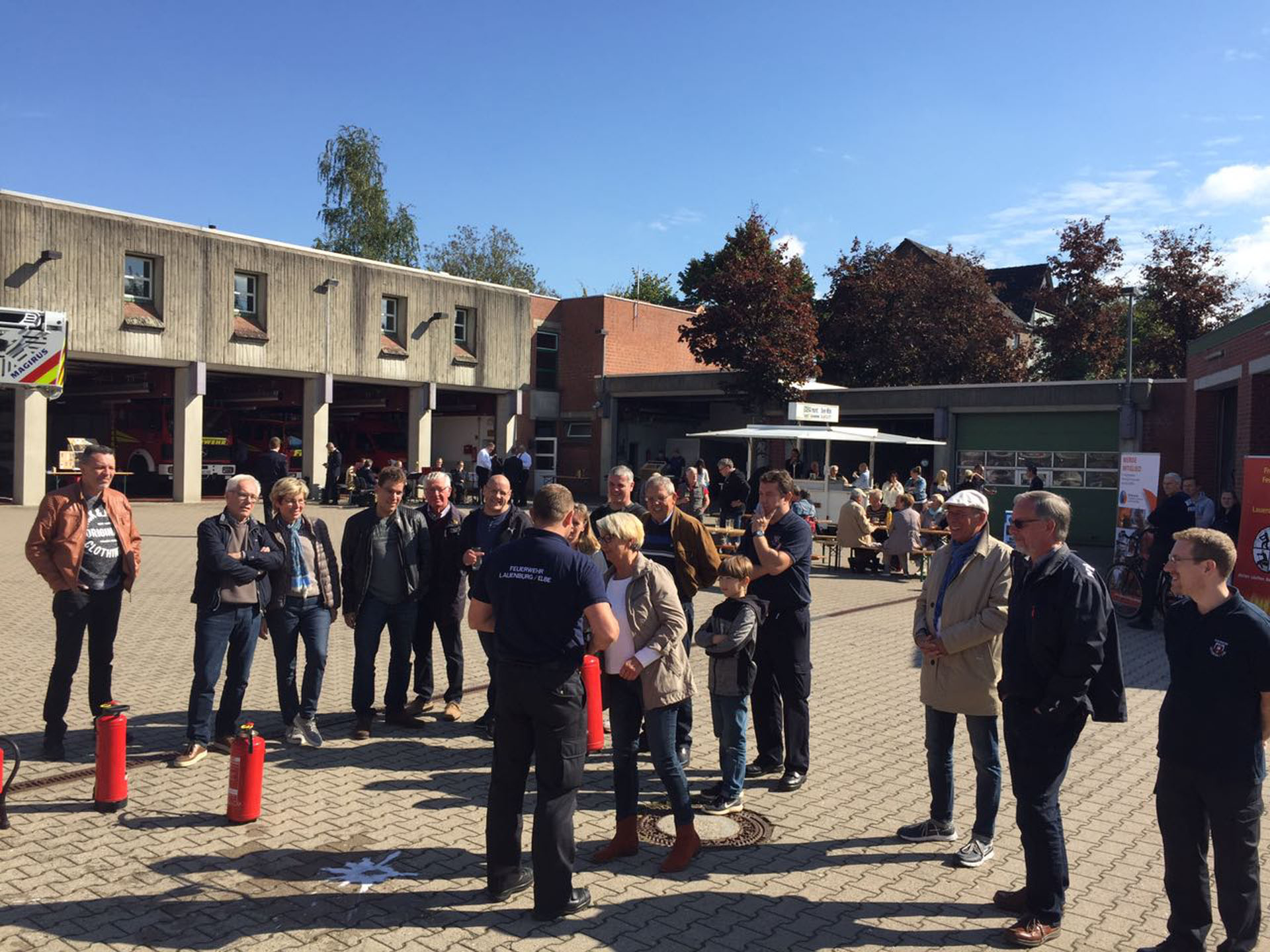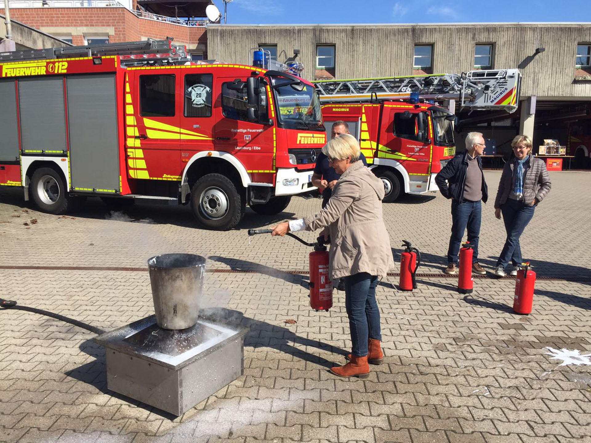 Zu einem Treffen der Förderer lud der Förderverein seine Mitglieder ein. Bei bestem Sonnenschein empfing Blasmusik des Feuerwehr-Musikzuges Lauenburg Süd die Gäste der Veranstaltung. Der Löschzug der Feuerwehr schmückte den Hof und zog die Aufmerksamkeit auf sich. Mit Dankesworten begrüßte der erste Vorsitzende Thomas Burmester die Mitglieder des Fördervereines, welcher nun schon seit vier Jahren existiert. Die Initiative hat sich zur Aufgabe gemacht, die Arbeit der freiwilligen Feuerwehrleute zu würdigen und zu unterstützen. Auch zur Freude von Wehrführer Lars Heuer steigt die Mitgliederzahl im Verein weiter an. Durch die finanziellen Mittel, welche der Verein durch die Förderer bekommt, konnte zum Beispiel ein Rauchdemohaus beschafft werden, welches bei der Brandschutzaufklärung und Brandschutzerziehung zum Einsatz kommt. Als nächstes soll ein einheitliches Outfit für die aktiven Mitglieder beschafft werden. Bestehend aus einer dünnen Bundhose und einem Hemd, welches bei Veranstaltungen ein einheitliches Bild bietet. Neben Wurst vom Grill und Getränken konnten sich die Besucher die Einsatzfahrzeuge erklären lassen, neben dem HLF und dem TLF war aber die Drehleiter der Magnet. Das imposante Fahrzeug ist wohl der Begriff, wenn es um die Feuerwehr geht, beeindruckend für Jung und Alt. Auch Vorführungen durften natürlich nicht fehlen und so wurde neben einer Fettexplosion auch die Detonation einer Haarspraydose vorgeführt. – Der Knall und die Stichflamme waren gewaltig und schreckten alle auf. Der Respekt, den man vor dieser mit Gas gefüllten Kartusche haben sollte, ist nun wohl allen Besuchern bekannt. Doch auch selbst durften die Mitglieder Hand anlegen, ein brennender Papierkorb musste fachgerecht gelöscht werden. Dabei gab es Instruktionen vom stellv. Wehrführer und Ausbilder Dennis Lühr. Mit dem Feuerlöscher konnten die Flammen schnell und gezielt eingedämmt werden. Bei strahlendem Sonnenschein klang der Vormittag langsam aus. Wir danken allen Besuchern und darüber hinaus allen Mitgliedern des Fördervereins für ihre Unterstützung!