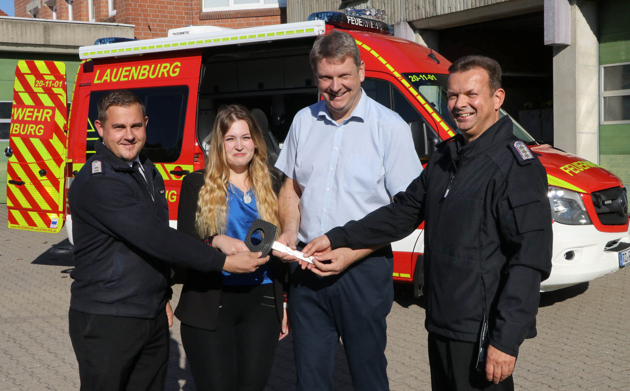 Am Freitagvormittag übergab Bürgermeister Andreas Thiede gemeinsam mit Lara Dieckmann Symbolisch den Schlüssel des neuen Einsatzleitwagen an die Lauenburger Feuerwehr. Bereits vor Drei Wochen holten ihn Mitglieder der Wehr aus Twist im Emsland ab. „Eine feierliche Übergabe ist geplant, wenn auch das neue Löschfahrzeug in Lauenburg angekommen ist“ erklärt Wehrführer Lars Heuer. „Jedoch kann der Einsatzleitwagen schon jetzt von der Wehr für Einsatzlagen genutzt werden“ ergänzt Bürgermeister Thiede. Das hochmoderne Einsatzfahrzeug ersetzt einen VW LT aus dem Jahre 2005. Mit modernster EDV- und Funktechnik ausgestattet, wird das Fahrzeug künftig bei mittleren und größeren Einsatzlagen eingesetzt. Es dient dann etwa als Verbindungsstelle zur Leitstelle, oder aber als Meldekopf bei Unwetterlagen. Gleich 5 Digitalfunkgeräte sind verbaut, damit das zulässig ist, war eine abgesetzte Antenne notwendig. Diese ist auf einem pneumatisch ausfahrbaren, 6m langen Mast montiert. An der Spitze sind zudem Scheinwerfer und eine rote Kennleuchte montiert. Gemeinsam mit der Umfeldbeleuchtung wir der Nahbereich um den ELW bei Nacht bestens ausgestrahlt. Im inneren stehen zur Einsatzlenkung zwei vollwertige Funkarbeitsplätze zur Verfügung. Mit je zwei Monitoren kann der Funker Lagekarten, Funktagebücher und Protokolle führen. An einem abgesetzten dritten Arbeitsplatz kann zum Beispiel ein Meldekopfführer die Einsätze einsehen oder bearbeiten. Die seitlich montierte Markise kann zu einem Besprechungsraum ausgebaut werden. Durch extra Schnittstellen könnte hier bei Einsätzen sogar eine Lagekarte auf einem Bildschirm angezeigt werden. Dass das Fahrzeug benötigt wird, zeigte sich bereits, erklärt Stellv. Wehrführer Dennis Lühr. Bei einem angedrohten Suizid an der Elbbrücke hielt der ELW die Kommunikation zwischen den Kräften aus Niedersachsen und Schleswig-Holstein aufrecht. – Bürgermeister Andreas Thiede freute sich über das Engagement, dass die Arbeitsgruppe zuvor in den ELW investiert hatte. „Nun ist die Feuerwehr für kommende Einsätze bestens gerüstet“ erklärt er weiter. Für die Besetzung des Fahrzeuges wurde eine extra Einheit innerhalb der Wehr gegründet, um das Fahrzeug zielführend im Einsatz einzubinden.