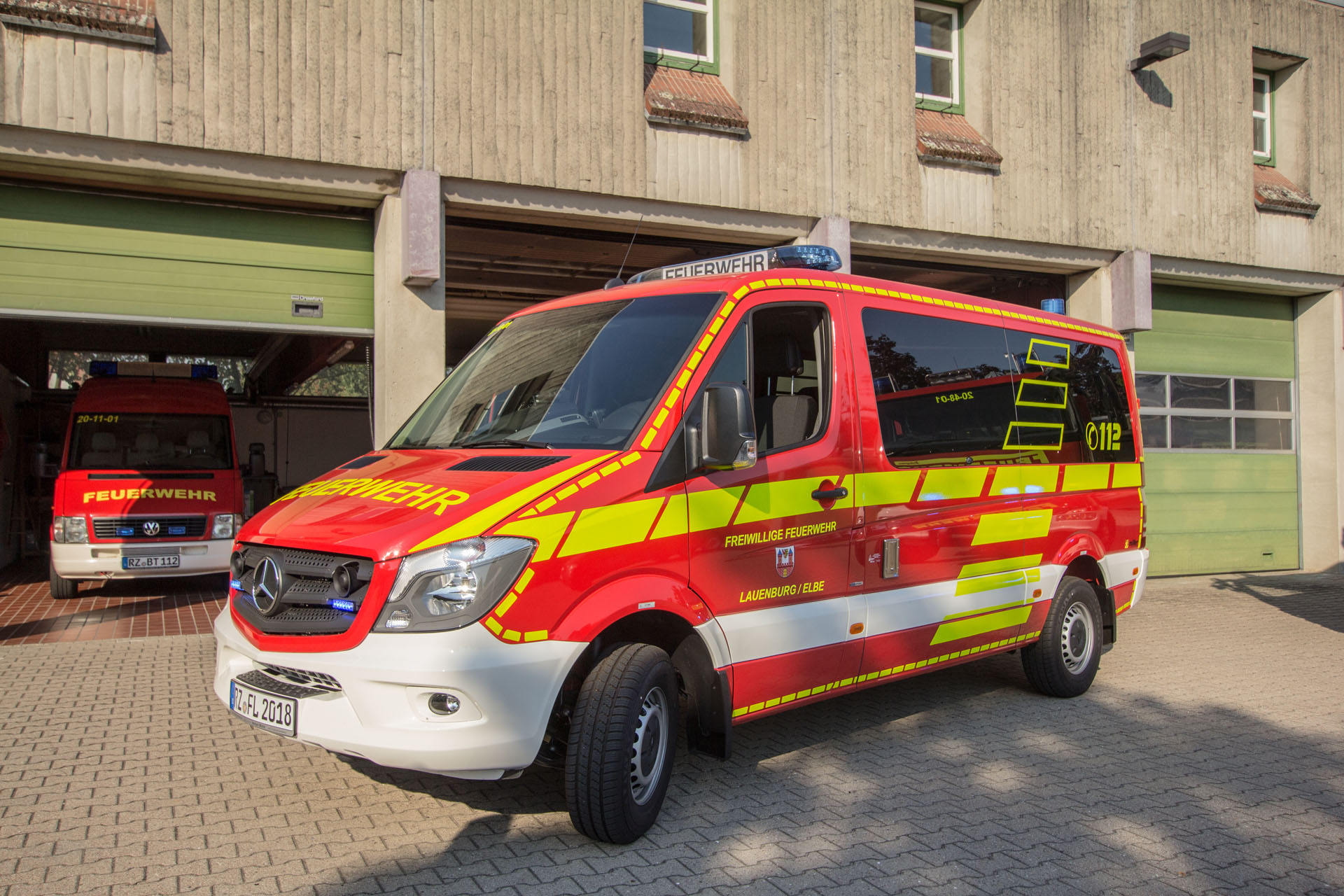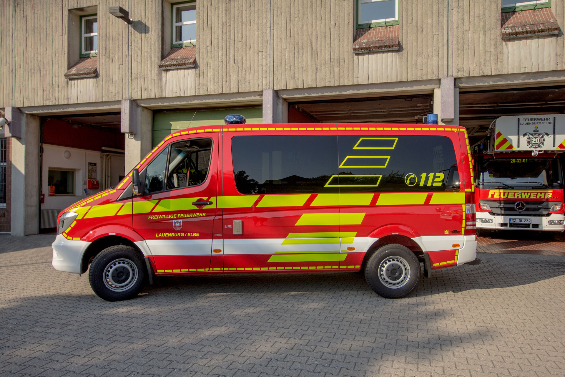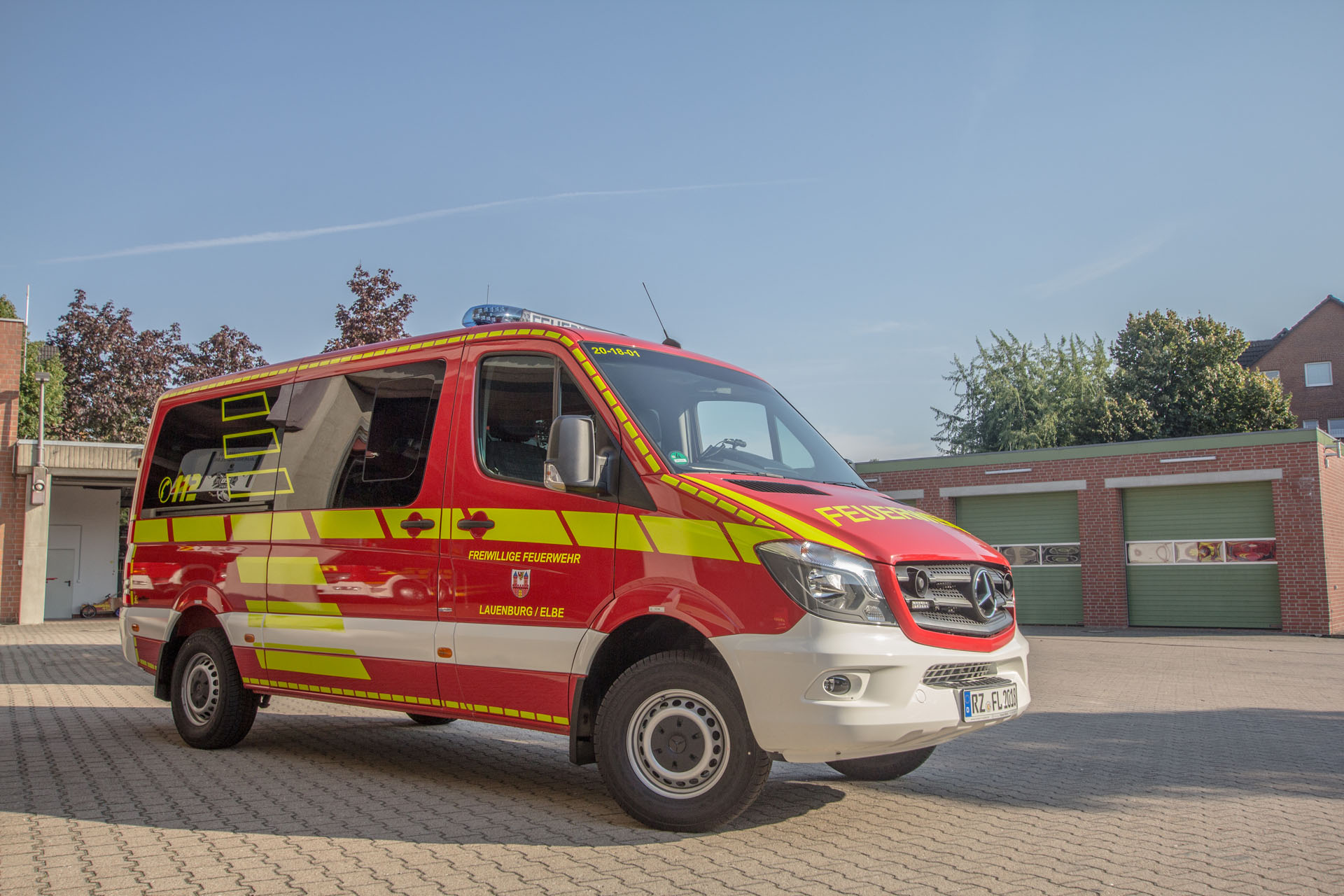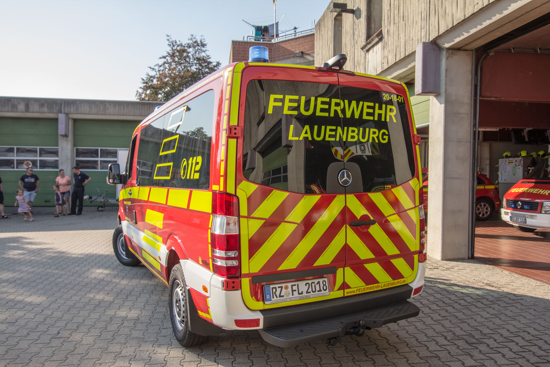 Zum Dienstabend am 29. August begrüßte Wehrführer Lars Heuer neben seinen aktiven Mitgliedern auch Vertreter der Stadt, der Mercedes-Benz Niederlassung Bergedorf sowie Bürgermeister Andreas Thiede. Grund war die Übergabe eines lang ersehnten Fahrzeuges. Das neue Mannschaftstransportfahrzeug, kurz MTF, kündigte Bürgermeister Thiede genau vor einem Jahr auf der 140-Jahr Feier an. Nun, ein Jahr später, übergab er symbolisch den Schlüssel für den neuen Mercedes Sprinter. Das Fahrzeug löst einen in die Jahre gekommenen VW LT ab, bietet viele Neuerungen und macht das Fahrzeug auch für den Einsatzdienst sinnvoll einsetzbar. Wehrführer Lars Heuer freute sich über das neue Fahrzeug, dankte den Vertretern der Stadt. Bürgermeister Andreas Thiede beteuerte, dass es bei den nächsten Anschaffungen nicht so lange dauern würde, bis eine Entscheidung gefällt wird. Vor der Versammlung zeigte sich Bürgermeister Thiede interessiert zu den neuen Alarmmonitoren in der Wache und ließ sich diese vorführen. Während der Übergabe ehrte er Sebastian Porthun stellvertretend auch für weitere Mitglieder, welche an dem Projekt mitgewirkt haben, mit einer Urkunde und einem Gutschein. Schließlich wurde symbolisch der Schlüssel vor den rund 45 angetretenen Mitgliedern der Feuerwehr übergeben. Der Mercedes Benz Sprinter verfügt über einen 160PS Diesel-Motor. Das Fahrzeug dient vorrangig zum Transport der Mannschaft. Der Innenausbau erfolgte durch Firma Müller. Der Boden ist mit Alu-Riffelblech ausgelegt, um ihn im Bedarfsfall reinigen zu können. Der Kofferraum ist mit einem Trenngitter zum Font abgetrennt, eine Durchlademöglichkeit im unteren Bereich ist dennoch gegeben. Eine Nachtbeleuchtung mit farbigen LED´s im Innenraum soll den Fahrer nicht ablenken und dennoch genügend Licht für die Mitfahrer spenden. Das Fahrzeug ist auffällig mit retroreflektierenden Folien im Lauenburger Design beklebt. Die umlaufende Konturbeklebung zeichnet nachts die Ausmaße des Fahrzeuges wieder. Die markante Seitenbeklebung passt sich perfekt in den bestehenden Fuhrpark ein und erhöht die Tages- und Nachtsichtbarkeit des Fahrzeuges um ein Vielfaches gegenüber eines normalen, schlicht roten Feuerwehrfahrzeuges. Das Heck ist mit einer Heckschraffur in rot-gelb beklebt, diese reflektiert das Licht etwa von Autoscheinwerfern und sorgt für größte Aufmerksamkeit und damit Sicherheit der Einsatzkräfte. Die Heckwarneinrichtung der Blaulichtanlage vom Typ Hänsch DBS4000 ergänzt die Warnwirkung. Das Fahrzeug steht der Feuerwehr künftig als Zugfahrzeug für das Rettungsboot sowie für die Fahrten zur feuerwehrtechnischen Zentrale oder anderen Fortbildungen zur Verfügung.