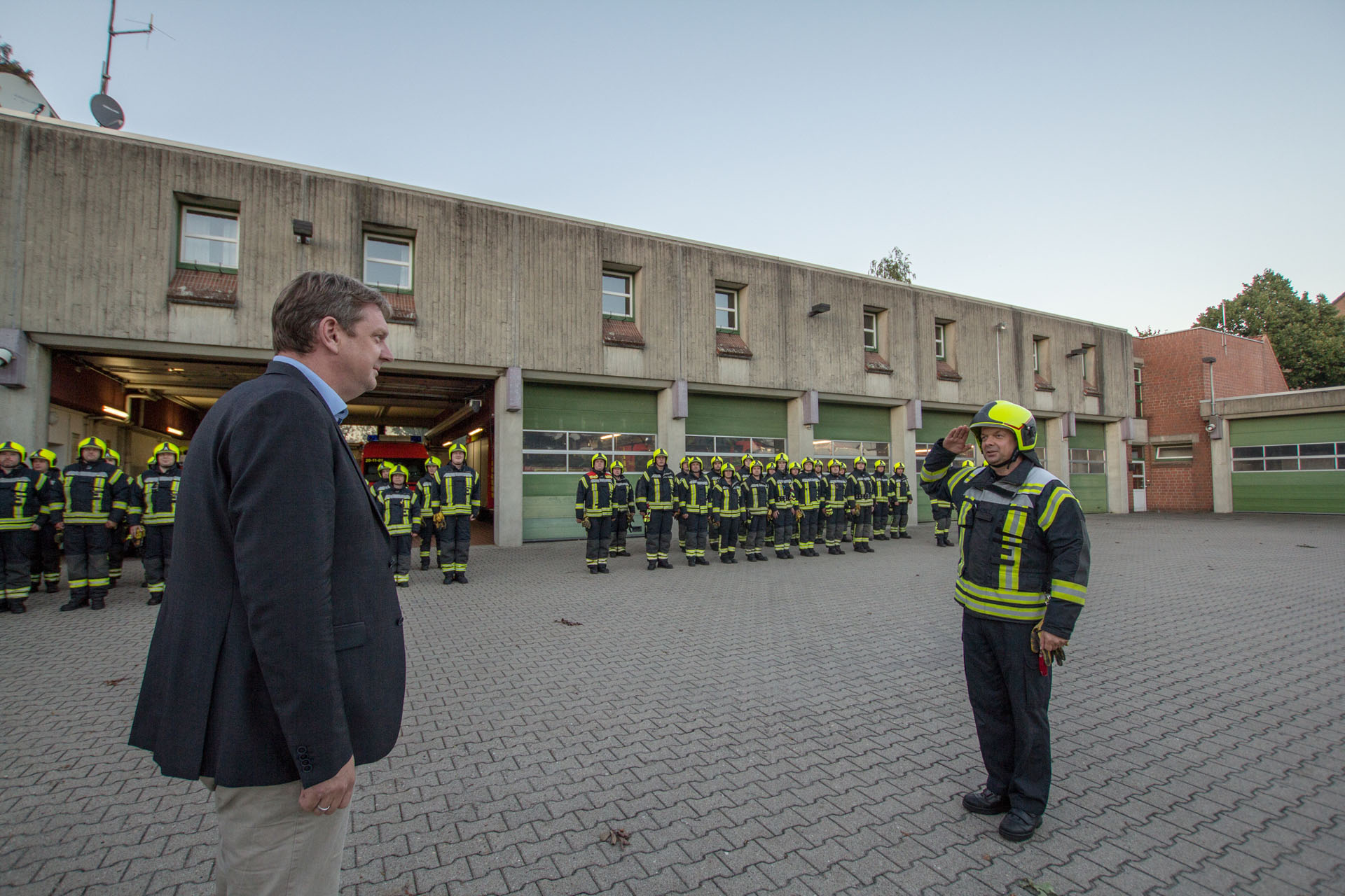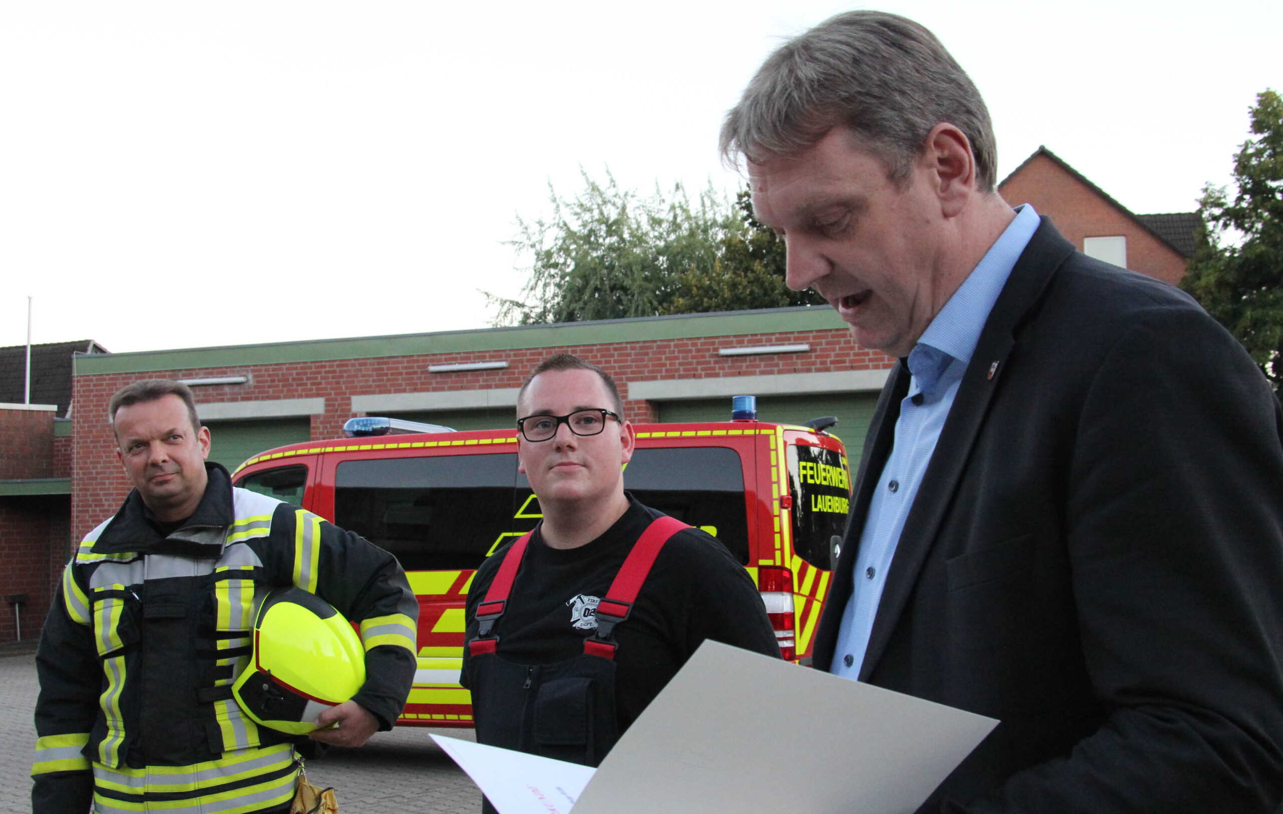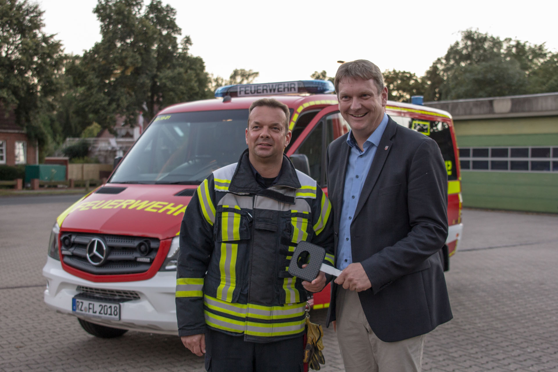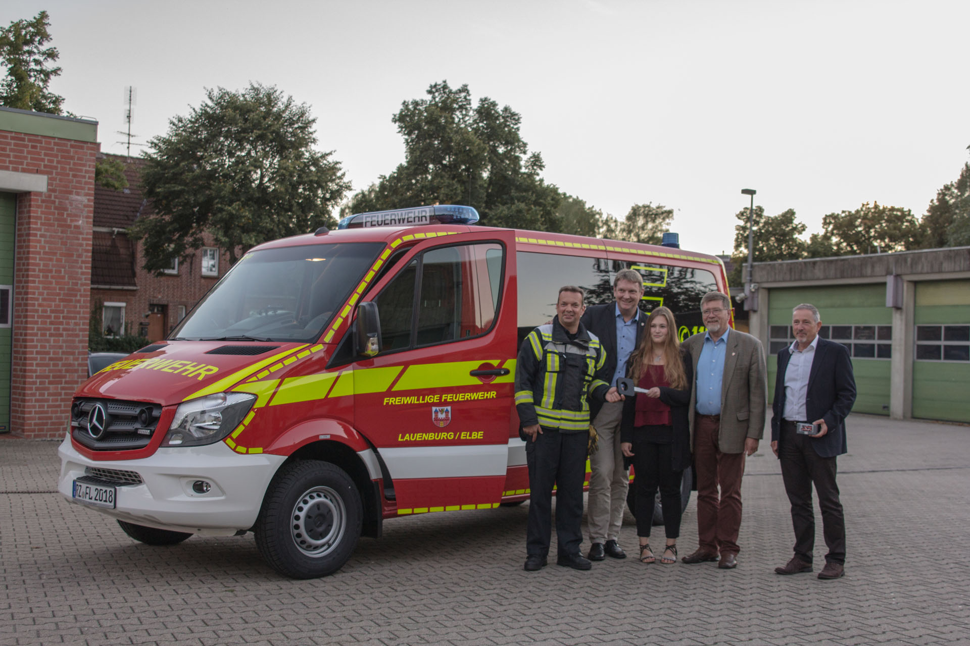 Zum Dienstabend am 29. August begrüßte Wehrführer Lars Heuer neben seinen aktiven Mitgliedern auch Vertreter der Stadt, der Mercedes-Benz Niederlassung Bergedorf sowie Bürgermeister Andreas Thiede. Grund war die Übergabe eines lang ersehnten Fahrzeuges. Das neue Mannschaftstransportfahrzeug, kurz MTF, kündigte Bürgermeister Thiede genau vor einem Jahr auf der 140-Jahr Feier an. Nun, ein Jahr später, übergab er symbolisch den Schlüssel für den neuen Mercedes Sprinter. Das Fahrzeug löst einen in die Jahre gekommenen VW LT ab, bietet viele Neuerungen und macht das Fahrzeug auch für den Einsatzdienst sinnvoll einsetzbar. Wehrführer Lars Heuer freute sich über das neue Fahrzeug, dankte den Vertretern der Stadt. Bürgermeister Andreas Thiede beteuerte, dass es bei den nächsten Anschaffungen nicht so lange dauern würde, bis eine Entscheidung gefällt wird. Vor der Versammlung zeigte sich Bürgermeister Thiede interessiert zu den neuen Alarmmonitoren in der Wache und ließ sich diese vorführen. Während der Übergabe ehrte er Sebastian Porthun stellvertretend auch für weitere Mitglieder, welche an dem Projekt mitgewirkt haben, mit einer Urkunde und einem Gutschein. Schließlich wurde symbolisch der Schlüssel vor den rund 45 angetretenen Mitgliedern der Feuerwehr übergeben. Der Mercedes Benz Sprinter verfügt über einen 160PS Diesel-Motor. Das Fahrzeug dient vorrangig zum Transport der Mannschaft. Der Innenausbau erfolgte durch Firma Müller. Der Boden ist mit Alu-Riffelblech ausgelegt, um ihn im Bedarfsfall reinigen zu können. Der Kofferraum ist mit einem Trenngitter zum Font abgetrennt, eine Durchlademöglichkeit im unteren Bereich ist dennoch gegeben. Eine Nachtbeleuchtung mit farbigen LED´s im Innenraum soll den Fahrer nicht ablenken und dennoch genügend Licht für die Mitfahrer spenden. Das Fahrzeug ist auffällig mit retroreflektierenden Folien im Lauenburger Design beklebt. Die umlaufende Konturbeklebung zeichnet nachts die Ausmaße des Fahrzeuges wieder. Die markante Seitenbeklebung passt sich perfekt in den bestehenden Fuhrpark ein und erhöht die Tages- und Nachtsichtbarkeit des Fahrzeuges um ein Vielfaches gegenüber eines normalen, schlicht roten Feuerwehrfahrzeuges. Das Heck ist mit einer Heckschraffur in rot-gelb beklebt, diese reflektiert das Licht etwa von Autoscheinwerfern und sorgt für größte Aufmerksamkeit und damit Sicherheit der Einsatzkräfte. Die Heckwarneinrichtung der Blaulichtanlage vom Typ Hänsch DBS4000 ergänzt die Warnwirkung. Das Fahrzeug steht der Feuerwehr künftig als Zugfahrzeug für das Rettungsboot sowie für die Fahrten zur feuerwehrtechnischen Zentrale oder anderen Fortbildungen zur Verfügung.