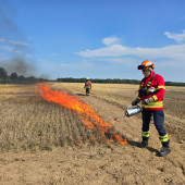 Einen Lehrgang der besonderen Art besuchten Mitglieder der Lauenburger Feuerwehr Anfang August. Vegetationsbrände sind auf Grund anhaltender Trockenheit weiter zunehmend. Lauenburg zwar mitten im grünen, jedoch bergen die großen zumeist landwirtschaftlich genutzten Flächen in den Nachbargemeinden auch ihre Gefahren. Wie schnell sich ein Flächenbrand ausbreiten kann und wie man ihn am besten beherrscht lernten die Teilnehmer zunächst in einem Online Lehrgang. In der Praxis wurde das erlernte dann mit Ausbildern von "Fire Tool Box" umgesetzt. Auf einem abgeernteten Feld wurden Quadrate abgegrenzt, um ein unkontrolliertes ausbreiten zu vermeiden. Zunächst wurden die verschiedenen Handwerkszeuge vorgestellt. Neben den in Deutschland weit verbreiteten Feuerpatschen wurden auch Utensilien aus von Vegetationsbränden stark geforderten Regionen wie Spanien oder Portugal vorgestellt.