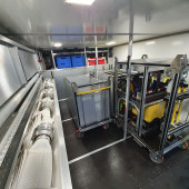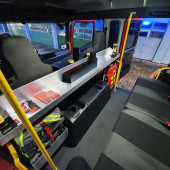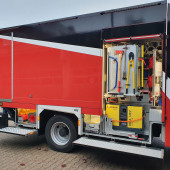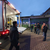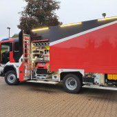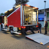 Einen Gerätewagen Logistik der neusten Generation stellte die Firma Ziegler am Dienstagabend interessierten der Lauenburger Feuerwehr vor. Vom Standort in Rendsburg machten sich die zwei Vertreter auf den Weg, um den erst kürzlich gefertigten Gerätewagen zu präsentieren. Die Lauenburger Feuerwehr verfügt aktuell über zwei Gerätewagen, die seinerzeit gebraucht vom Lauenburger Textilservice MEWA übernommen wurden. Eine Neubeschaffung in den nächsten Jahren ist in Planung, denn die aktuellen Fahrzeuge sind stark in die Jahre gekommen. Der vorgeführte MAN verfügt über ein 16t Fahrgestell. Das besondere, neben der großen Ladefläche bietet sich Platz für einen Stromerzeuger, eine Tragkraftspritze, eine Leiter und diverses Zubehör. So kann die Besatzung von bis zu 6 Personen autark mit dem Fahrzeug arbeiten. „Das wäre denkbar bei Unwettereinsätzen“ erklärt Wehrführer Lars Heuer. Über die Ladebordwand kann das Fahrzeug mit Rollcontainern je nach Bedarf bestückt werden. Zum Beispiel können Palletten mit gefüllten Sandsäcken, Stromerzeuger und Scheinwerfer zum Ausleuchten oder anderes Einsatz-Equipment bei größeren Lagen durch das vielseitig einsetzbare Fahrzeug angeliefert werden. Bis zu 2 Tonnen hebt die Ladebordwand am Heck. Als besonderes Feature kann das Fahrzeug auch als Schlauchwagen eingesetzt werden. 600m Schlauchleitung verstecken sich in einer Seitenwand des Fahrzeugs. Während der Fahrt kann die Leitung durch einen Fahrer und eine Person auf der Ladefläche gelegt werden.