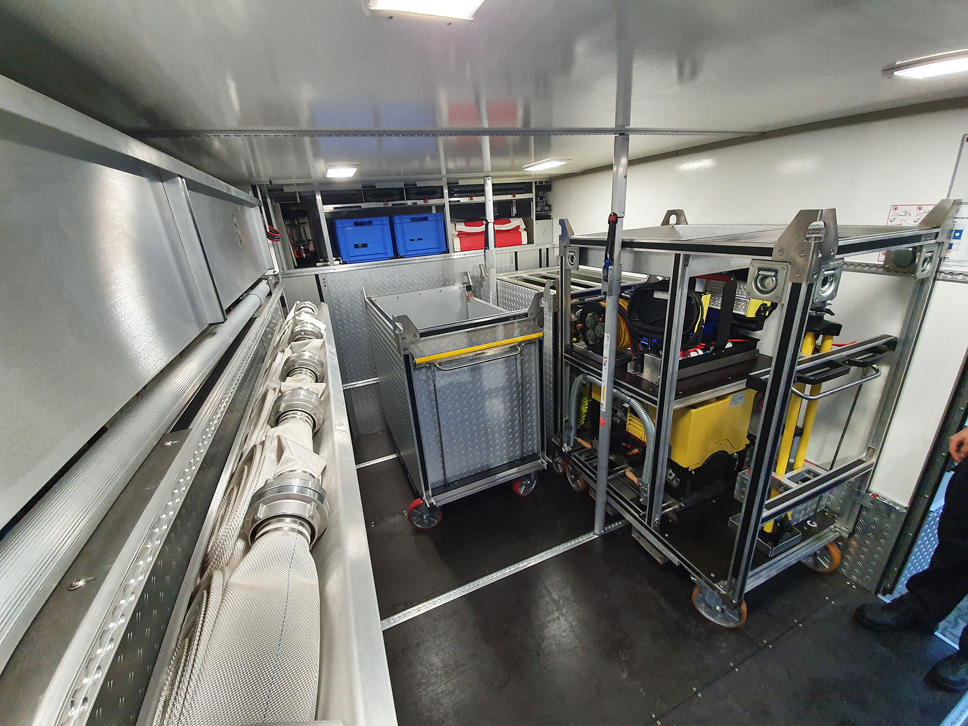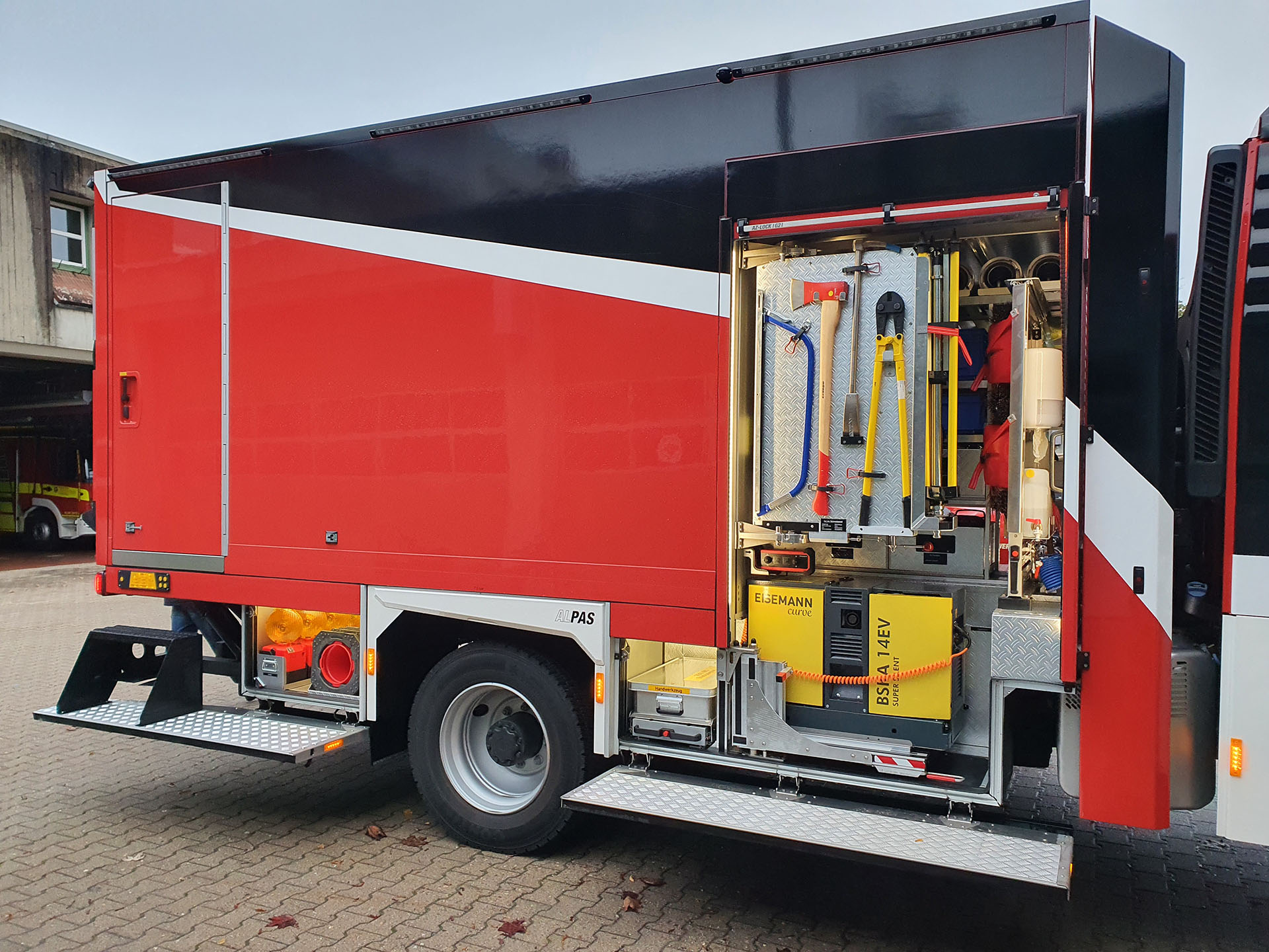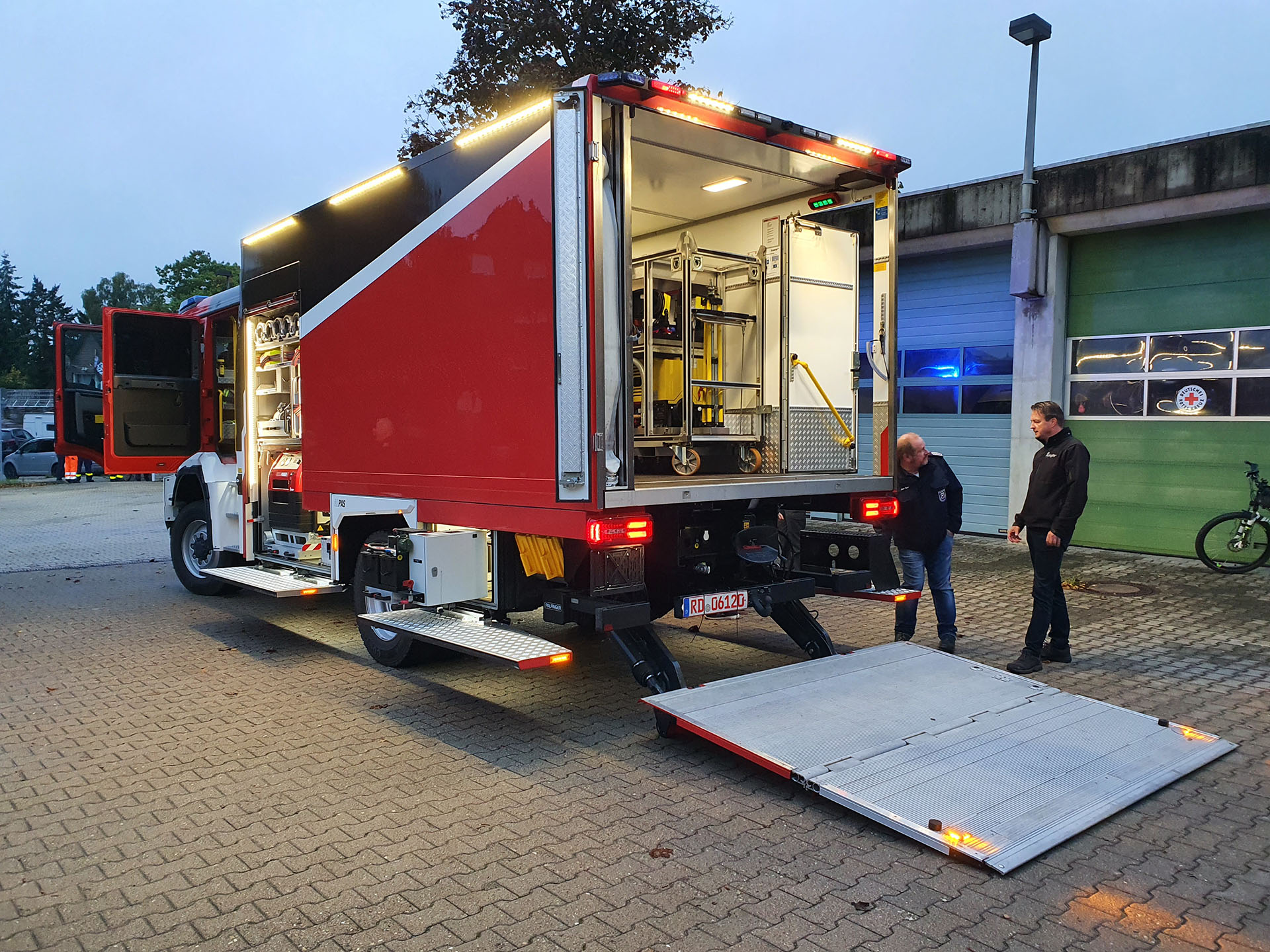 Einen Gerätewagen Logistik der neusten Generation stellte die Firma Ziegler am Dienstagabend interessierten der Lauenburger Feuerwehr vor. Vom Standort in Rendsburg machten sich die zwei Vertreter auf den Weg, um den erst kürzlich gefertigten Gerätewagen zu präsentieren. Die Lauenburger Feuerwehr verfügt aktuell über zwei Gerätewagen, die seinerzeit gebraucht vom Lauenburger Textilservice MEWA übernommen wurden. Eine Neubeschaffung in den nächsten Jahren ist in Planung, denn die aktuellen Fahrzeuge sind stark in die Jahre gekommen. Der vorgeführte MAN verfügt über ein 16t Fahrgestell. Das besondere, neben der großen Ladefläche bietet sich Platz für einen Stromerzeuger, eine Tragkraftspritze, eine Leiter und diverses Zubehör. So kann die Besatzung von bis zu 6 Personen autark mit dem Fahrzeug arbeiten. „Das wäre denkbar bei Unwettereinsätzen“ erklärt Wehrführer Lars Heuer. Über die Ladebordwand kann das Fahrzeug mit Rollcontainern je nach Bedarf bestückt werden. Zum Beispiel können Palletten mit gefüllten Sandsäcken, Stromerzeuger und Scheinwerfer zum Ausleuchten oder anderes Einsatz-Equipment bei größeren Lagen durch das vielseitig einsetzbare Fahrzeug angeliefert werden. Bis zu 2 Tonnen hebt die Ladebordwand am Heck. Als besonderes Feature kann das Fahrzeug auch als Schlauchwagen eingesetzt werden. 600m Schlauchleitung verstecken sich in einer Seitenwand des Fahrzeugs. Während der Fahrt kann die Leitung durch einen Fahrer und eine Person auf der Ladefläche gelegt werden.