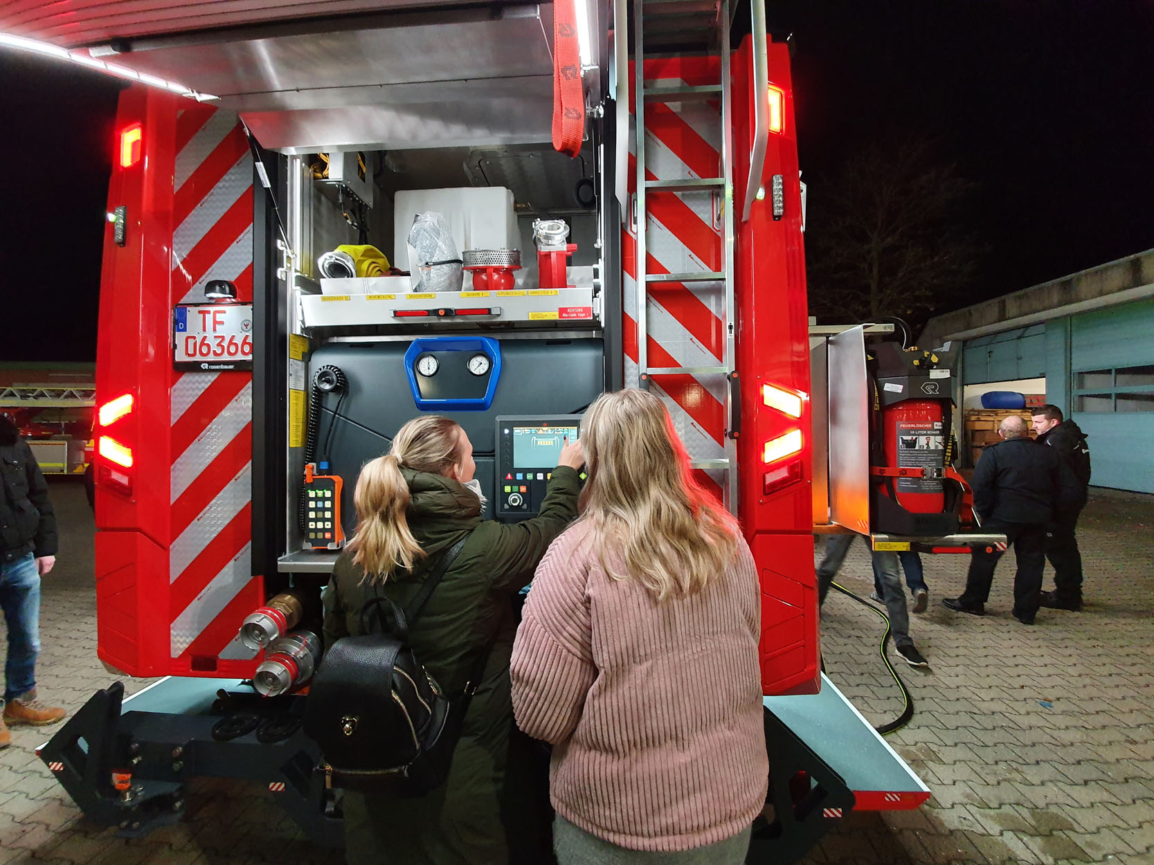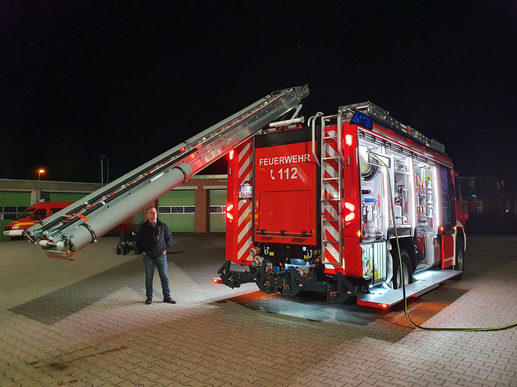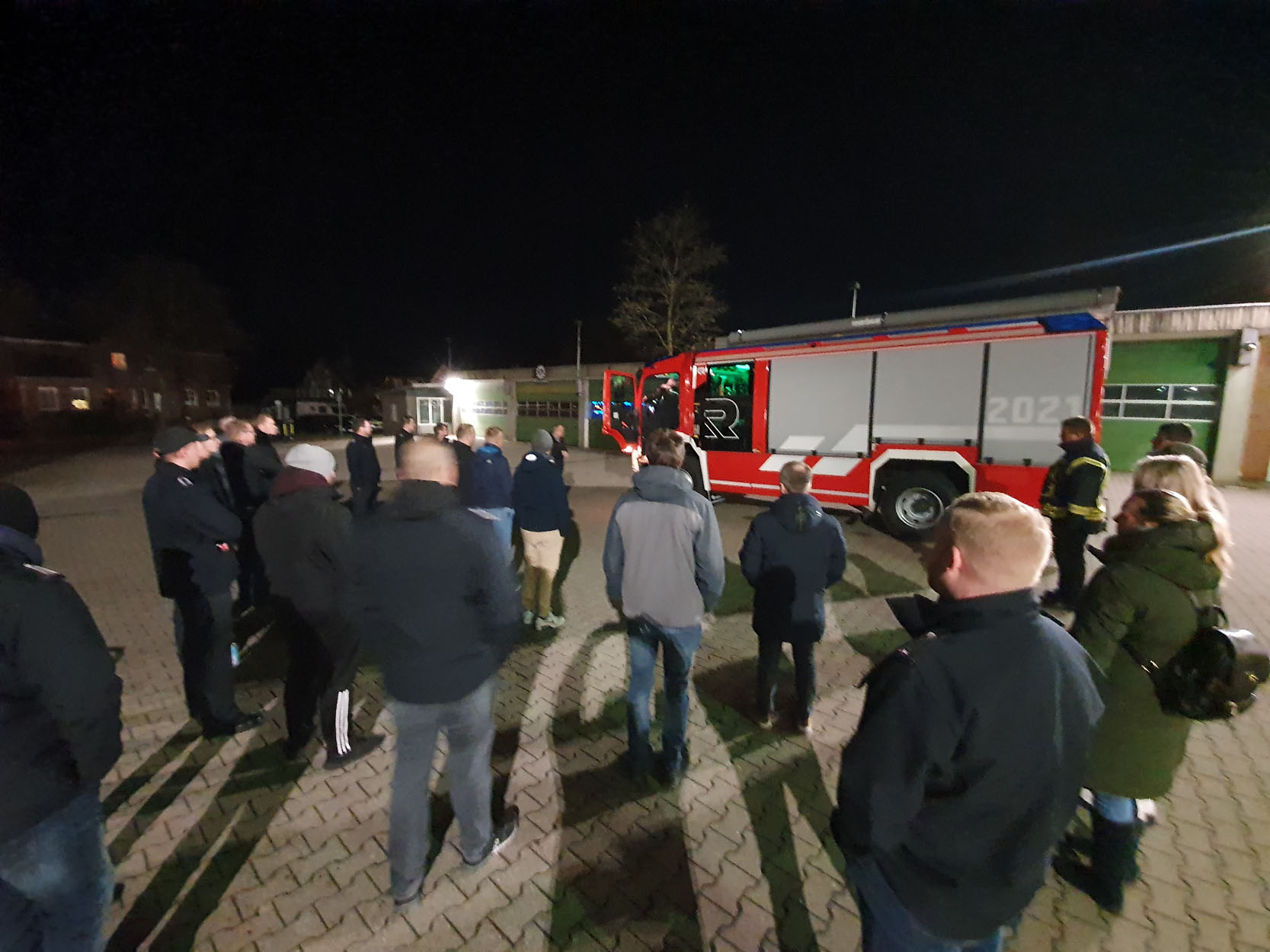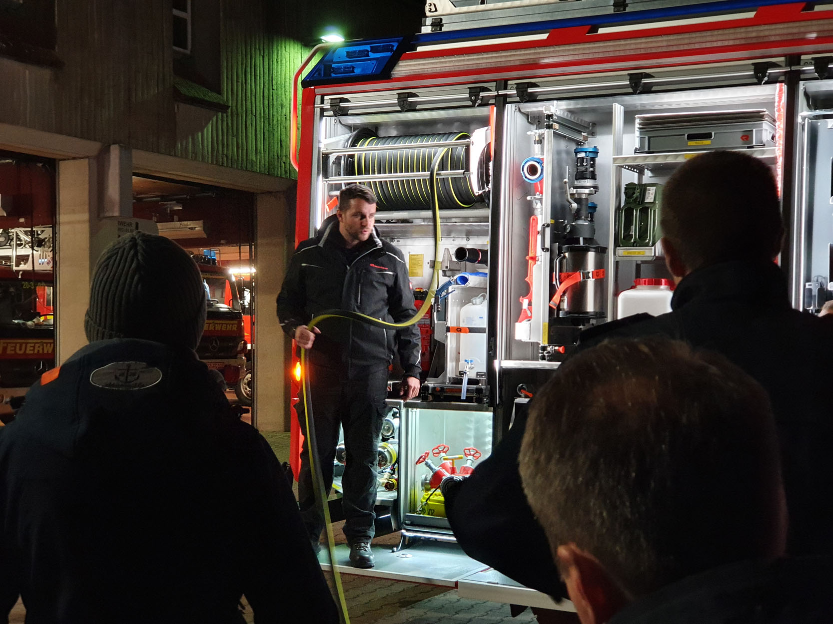 Ein neues HLF 20 stellte die Firma Rosenbauer am Dienstagabend an der Feuerwache in Lauenburg interessierten Mitgliedern vor. Im Rahmen einer Vorführtour organisiert durch Kraft Feuerschutz machten die Vertreter der Firmen halt in Lauenburg. Zahlreiche Mitglieder waren erschienen, um das Messe-Highlight des Österreichischen Herstellers zu bestaunen. Das Hilfeleistungslöschgruppenfahrzeug verfügt über zahlreiche Innovationen. So kann die Bedienung von Pumpe, Blaulicht, Aggregaten oder Beleuchtung gleichzeitig über Tasten aber auch über ein Touchdisplay passieren. Die Schwere Schiebleiter auf dem Dach kann elektrisch abgesenkt werden, sodass eine Entnahme ausschließlich vom Boden möglich ist. Zudem bietet das Fahrzeug viel Platz, um Ausrüstungsgegenstände zu verstauen. Im Mannschaftsraum können sich gleichzeitig Vier Atemschutzgeräteträger ausrüsten. Ganz nebenbei entdeckten die Mitglieder am Heck des Fahrzeuges mehrere Unterschriften, schließlich wurde stolz berichtet, dass dieses Fahrzeug zum Erfolg der Wette bei der ZDF Sendung „Wetten, dass…?“ beigetragen hat. In der Wette hatten Mitglieder aus dem Amt-Hohe-Elbgeest mit Wasserdruck ein Go-Kart beschleunigt.