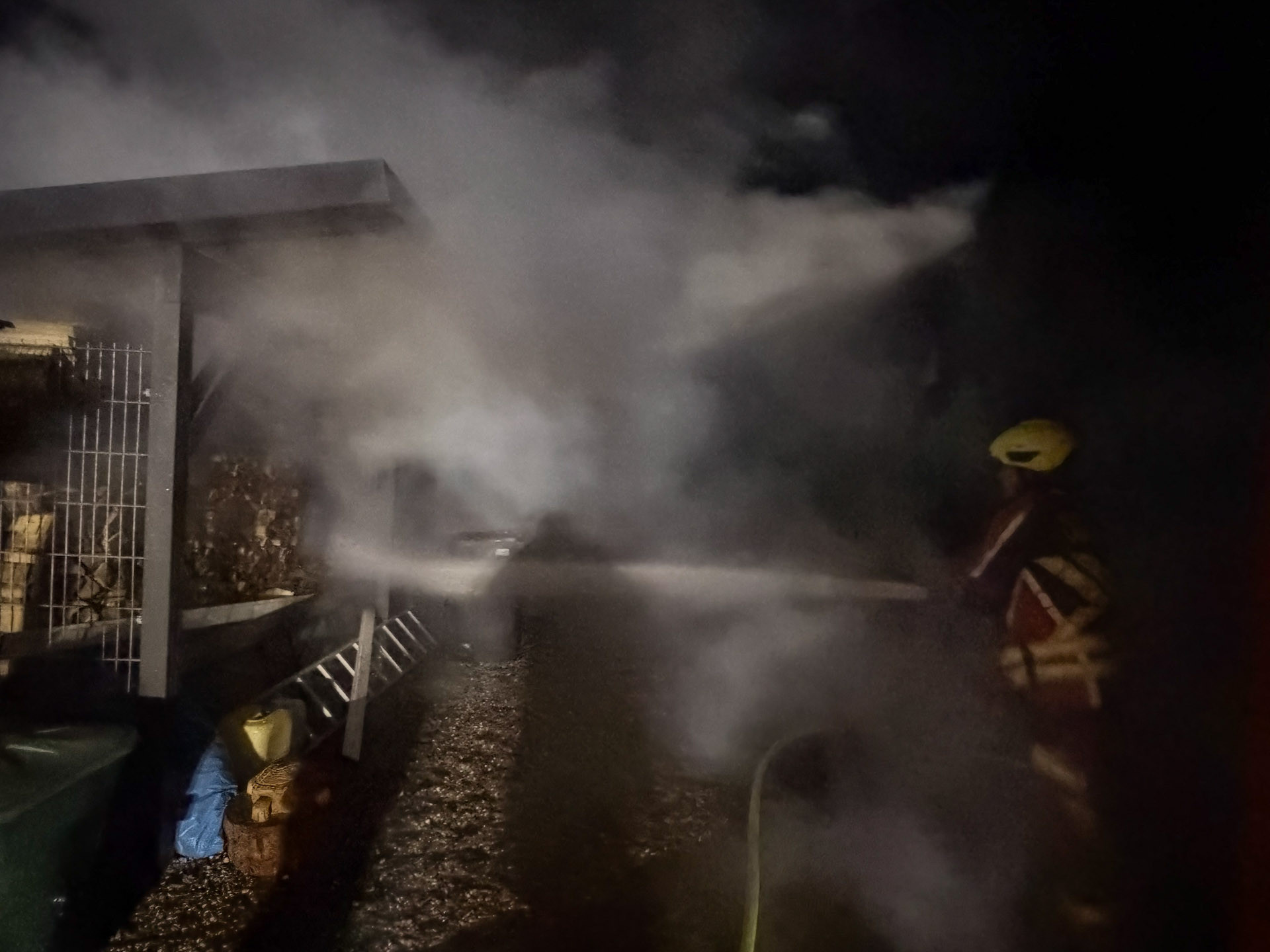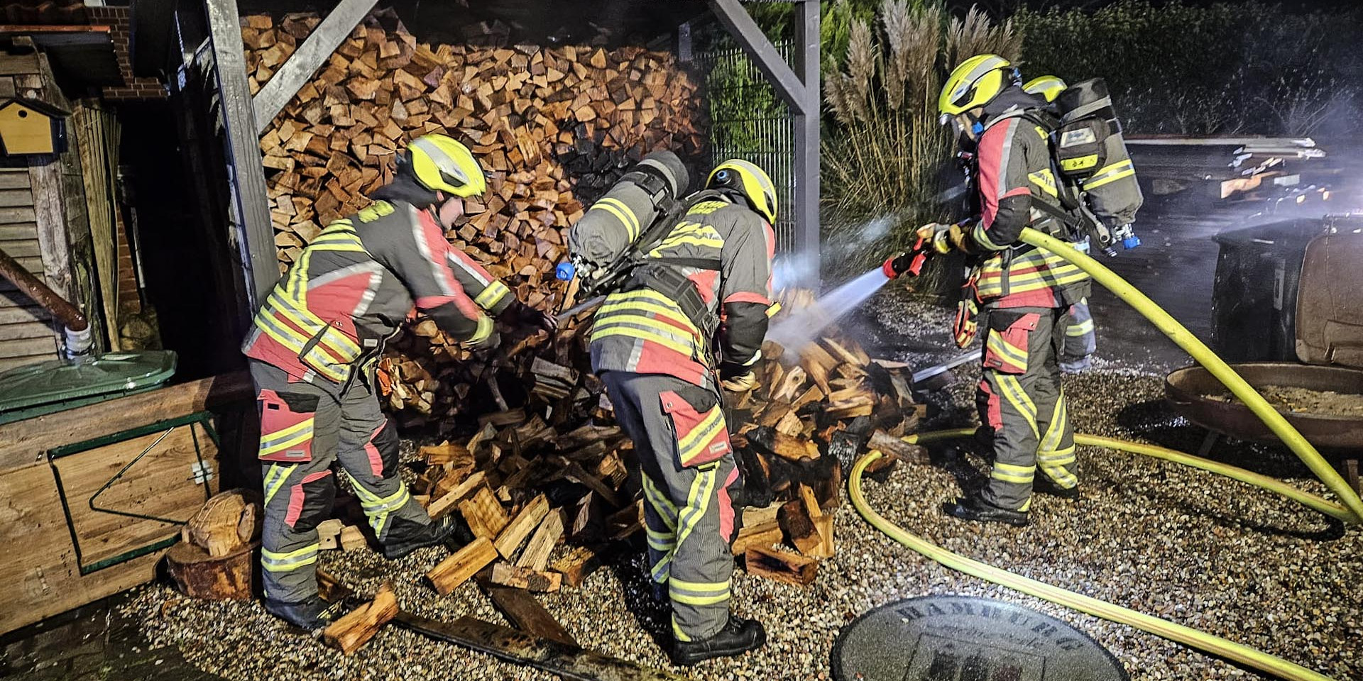 Gegen kurz nach vier in der Nacht ging es dann zu einem weiteren Kleinfeuer. Diesmal brannte beim Eintreffen des LF20 ein Unterstand mit Brennholz, sowie zwei Mülltonnen. Unter Atemschutz löschte der Angriffstrupp die Flammen. Um an letzte Glutnester zu kommen, müsste mühselig das gestapelte Brennholz auseinander gezogen werden. Nach knapp einer Stunde war der Einsatz beendet.