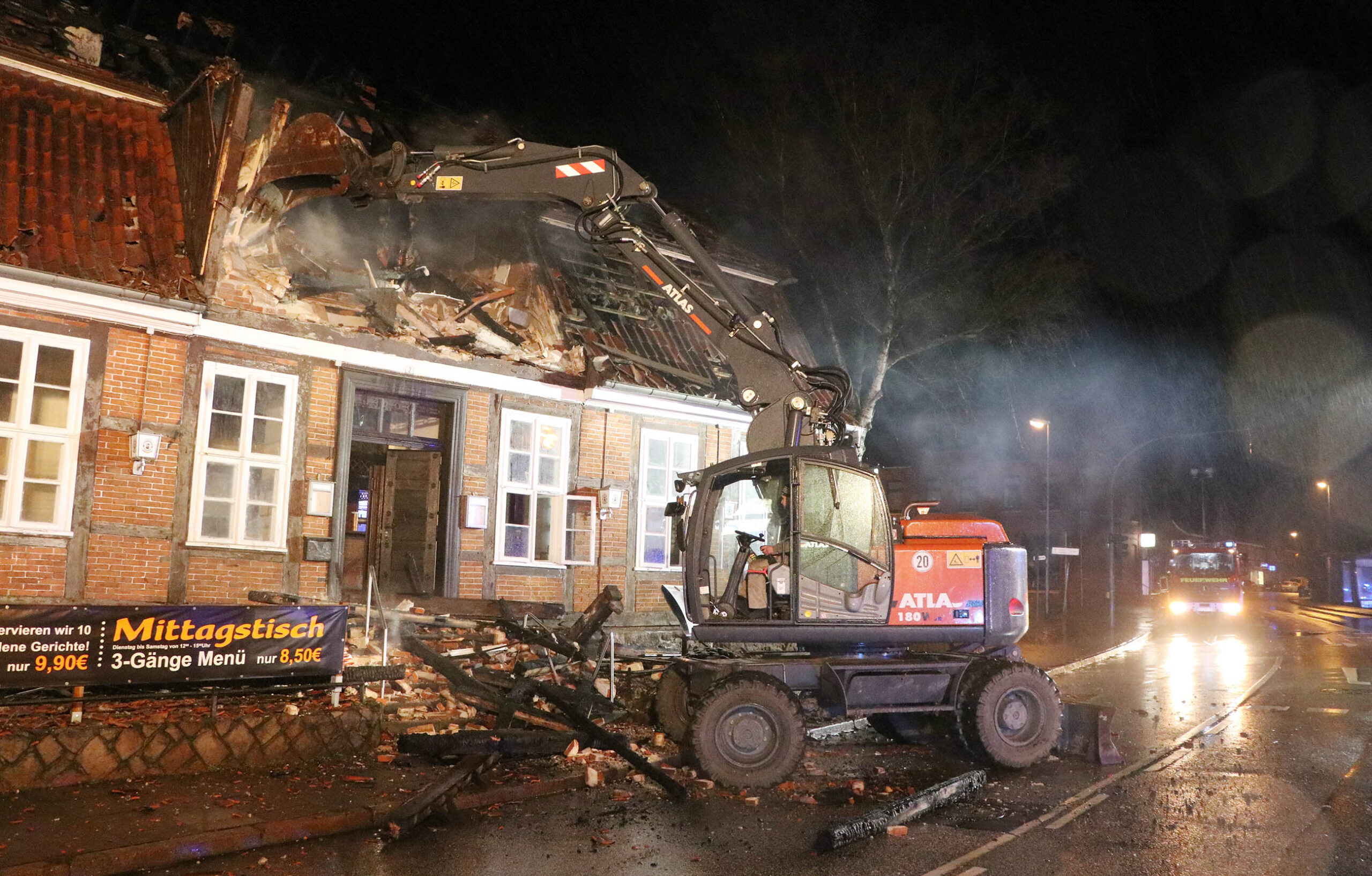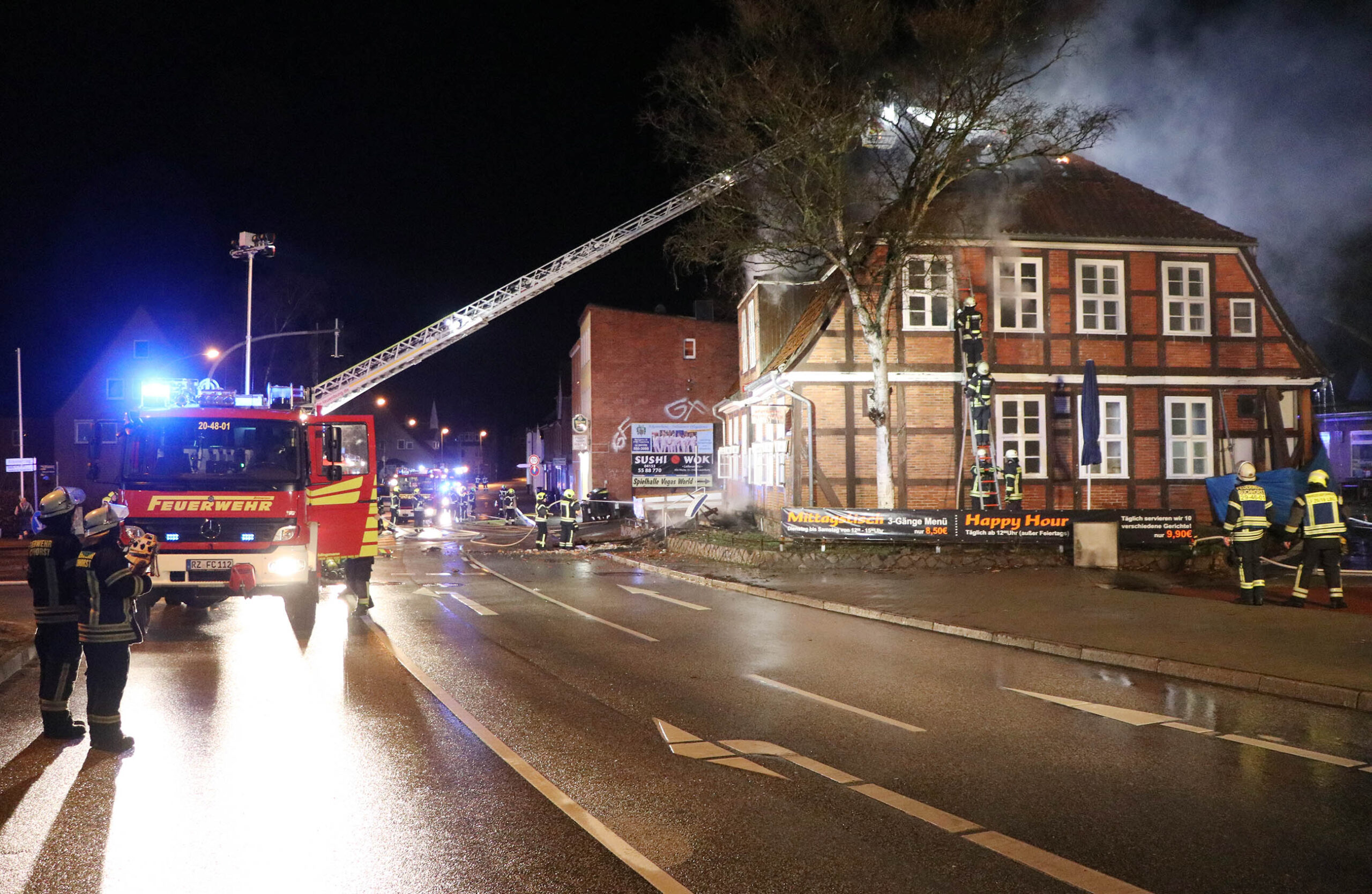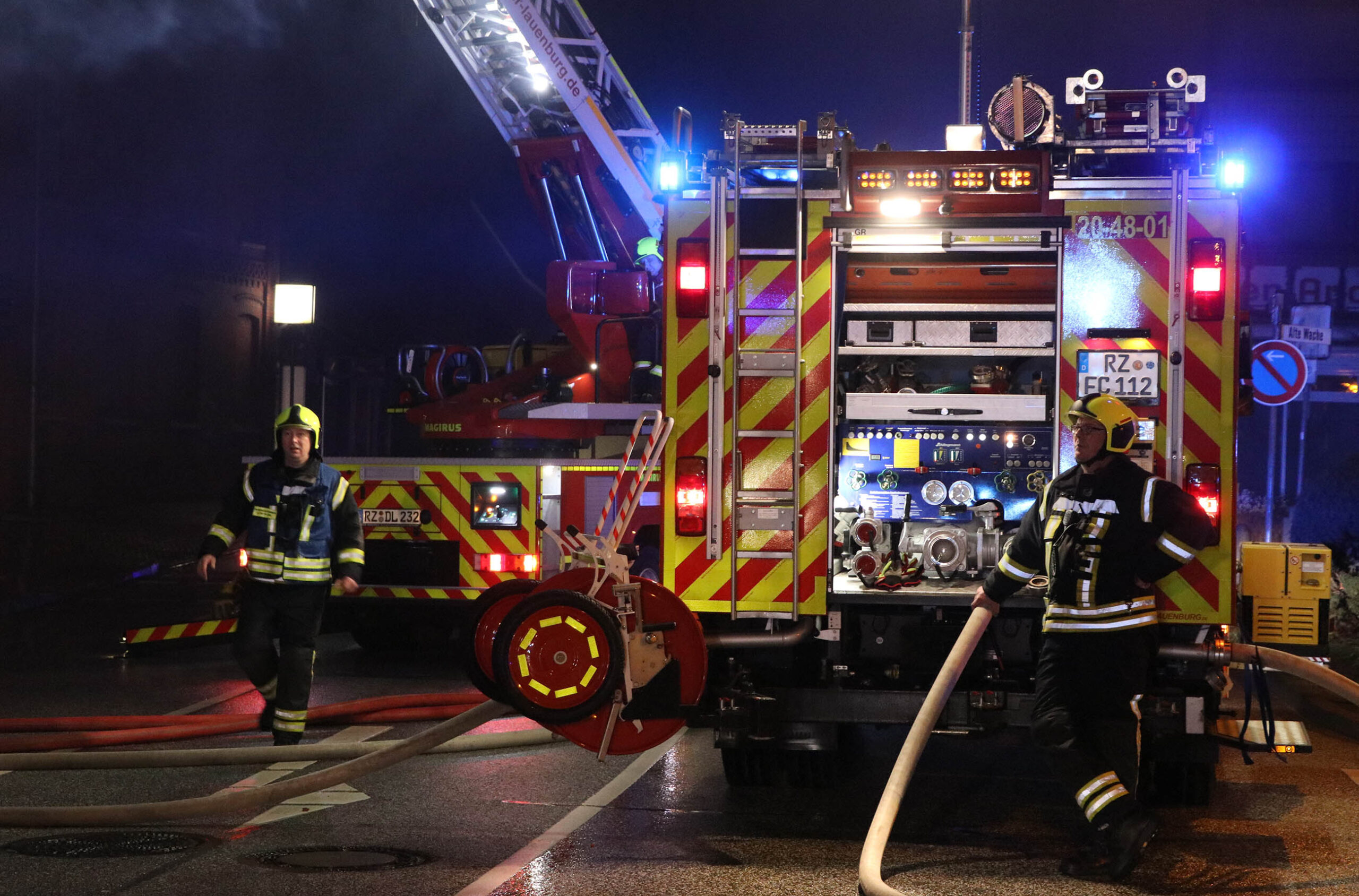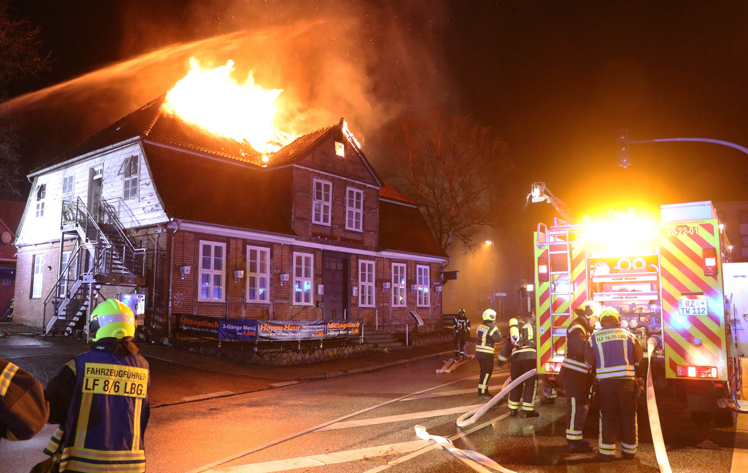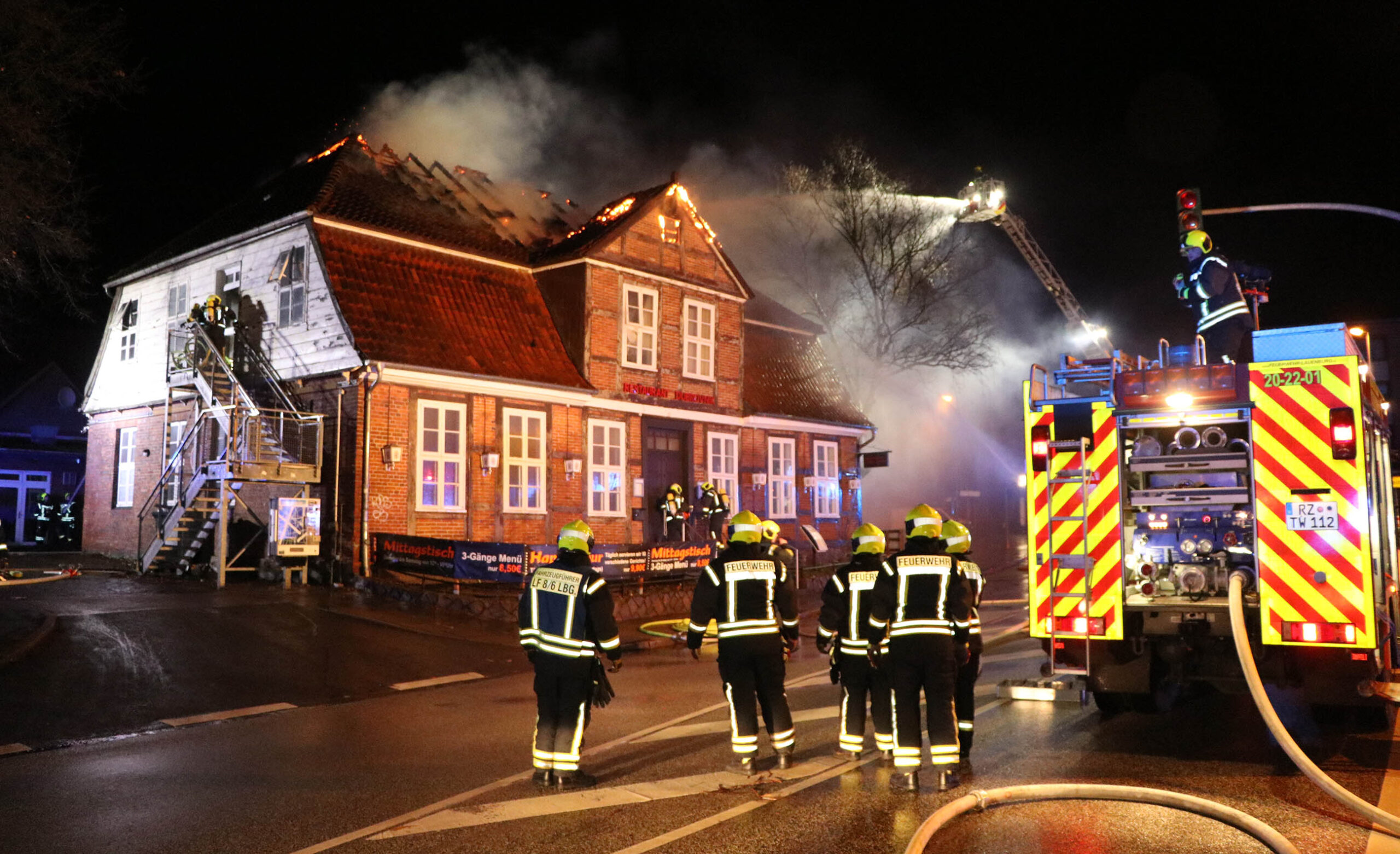In der Nacht zu Dienstag kam es zu einem Großfeuer in der Lauenburger Innenstadt. Ein leerstehendes Fachwerkhaus, das vielen Lauenburgern als Restaurant bekannt war brannte lichterloh. Zahlreiche Anrufe erreichten die Integrierte Regionalleitstelle Süd in Bad Oldesloe, die daraufhin die Lauenburger Feuerwehr zunächst unter dem Stichwort „Feuer Groß“ alarmierte. Wenig später traf Wehrführer Lars Heuer an der Einsatzstelle ein. Meterhohe Flammen schlugen aus dem Dachstuhl des Hauses an der Hamburger Straße. Rasch trafen auch weitere Fahrzeuge des Löschzuges ein. Die Drehleiter wurde in Stellung gebracht und mit Wasser versorgt. Über zwei Wenderohre und zwei Leitungen im Innenangriff wurden die Flammen eingedämmt. Jedoch musste der Innenangriff wenig später abgebrochen werden, da die Lehmdecken instabil wurden. Zur Unterstützung mit weiteren Atemschutzgeräteträgern forderte der ELW wenig später die Feuerwehren aus Buchhorst und Schnakenbek an und erhöhte das Stichwort auf „Feuer 2“. Nachdem die Flammen gelöscht waren, galt es die Glutnester aufzuspüren und abzulöschen. Hierzu rückte die Geesthachter Wehr mit einer zweiten Drehleiter an. Um alle Glutnester zu erreichen rückte auch ein Bagger einer örtlichen Baufirma an, und riss Teile des Gebäudes ab. Die Löscharbeiten dauerten bis in die frühen Morgenstunden an. Wie es zum Brandausbruch kam, ermittelt nun die Polizei. Update: Am Morgen rückte der Löschzug noch einmal zur Brandruine aus, die Polizei meldete eine zunehmende Rauchentwicklung aus dem Dachstuhl des Gebäudes. Mit der Drehleiter wurden die Trümmer erneut abgelöscht, nach 30 Minuten war der Einsatz wieder beendet. Update 14. Januar: Am Montagvormittag kam die Drehleiter im Rahmen der Amtshilfe erneut zum Einsatz an der Brandruine. Die Kriminalpolizei benötigte zur Begutachtung der Brandstellen die Unterstützung der Feuerwehr. Mit der Drehleiter konnte die Beamtin Details aus nächster nähe fotografieren. An ein betreten des Gebäudes ist nach dem Brand nicht zu denken. Zu groß wäre die Gefahr, das die stark beschädigte Decke einbricht.