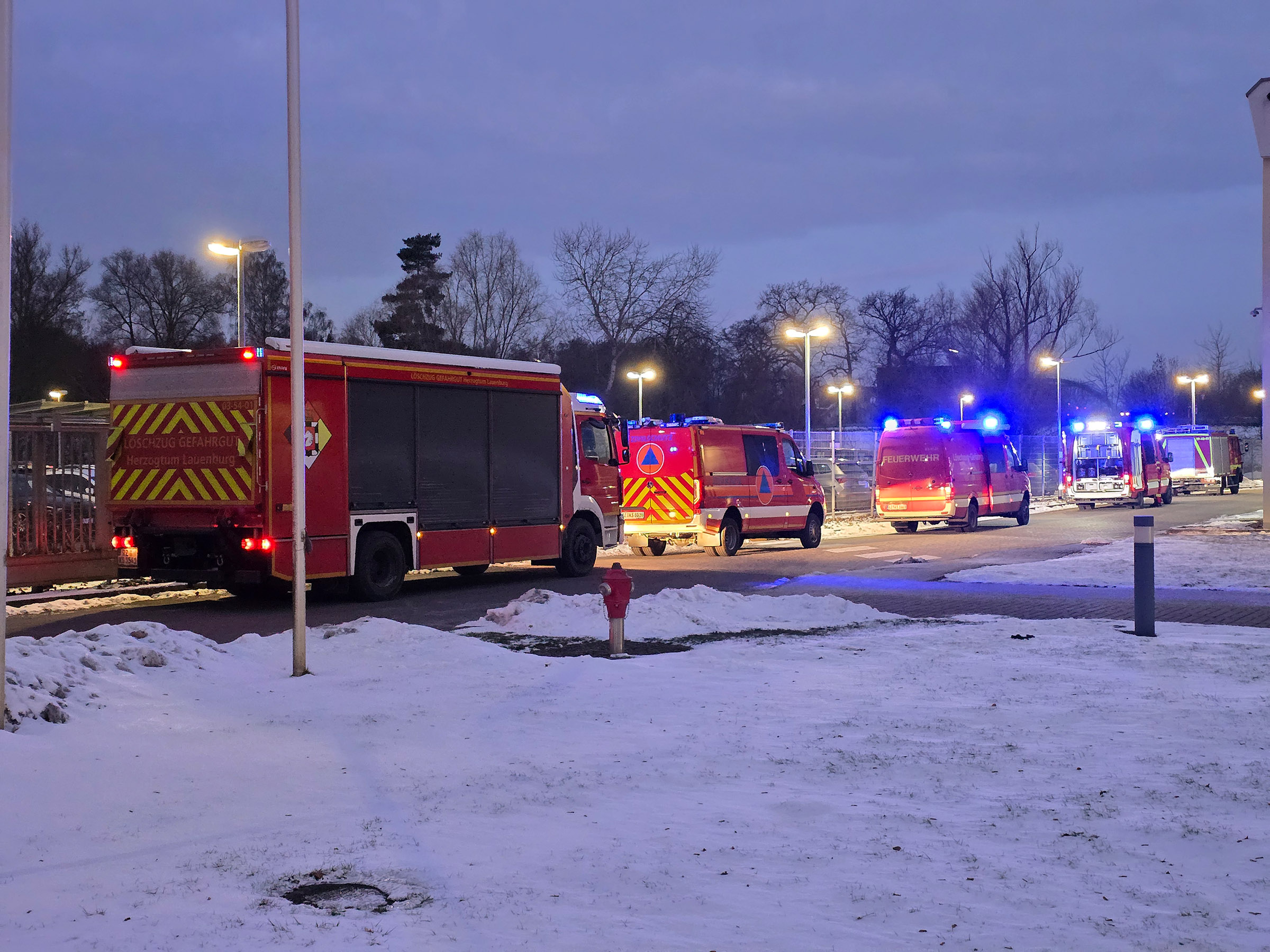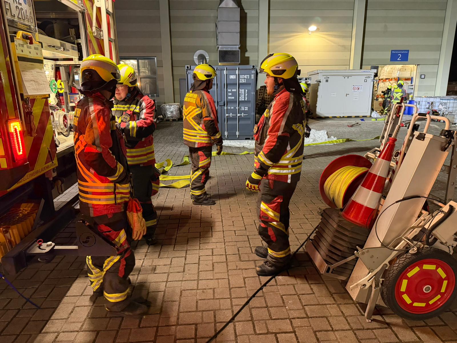 Am Dienstagmorgen wurde die Feuerwehr in das Lauenburger Industriegebiet alarmiert. Anlass war eine ausgelöste Brandmeldeanlage. Kurz nach dem Alarm trafen die Einsatzkräfte ein und begannen mit der Erkundung. Schnell wurde klar, es gab eine Reaktion in einem Chemikalienlager mit Dampfaustritt gab. Die Besatzung des LF 20 bereitete einen Innenangriff vor, während der Einsatzleiter das Einsatzstichwort anpasste und weitere Kräfte nachgefordert hat. Der Angriffstrupp ging zur Erkundung in den Lagerbereich vor. Eine Leitung an einem Gefahrstoffgebinde hatte sich offensichtlich unter Druck gelöst und zu einem Austritt geführt, wodurch die Brandmeldeanlage ausgelöst hatte. Der Austritt konnte gestoppt werden. Gefahr für die Personen oder die Umwelt bestand nicht. Unter Atemschutz waren die Einsatzkräfte damit beschäftigt das ausgetretene Medium zu binden. Vor dem Gebäude wurde währenddessen ein Belüftungsgerät aufgestellt um die Dämpfe aus der Halle zu blasen. Zur Unterstützung rückte auch die Feuerwehr Buchhorst an, die mit einem Angriffstrupp die Arbeiten unterstützte. Nach abschließender Kontrolle mit Messgeräten des Löschzug Gefahrgut wurde die Einsatzstelle an den Betriebsleiter übergeben.