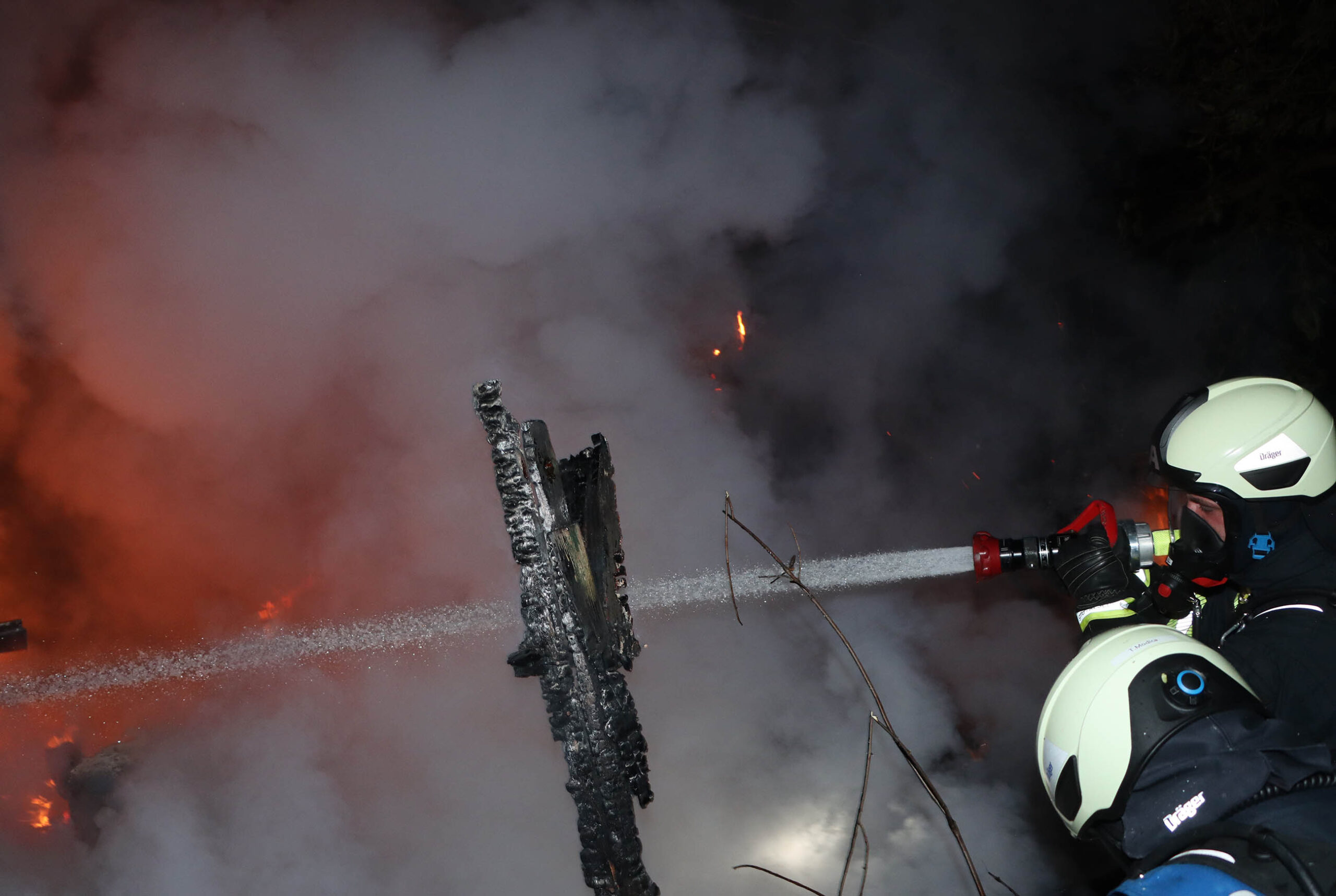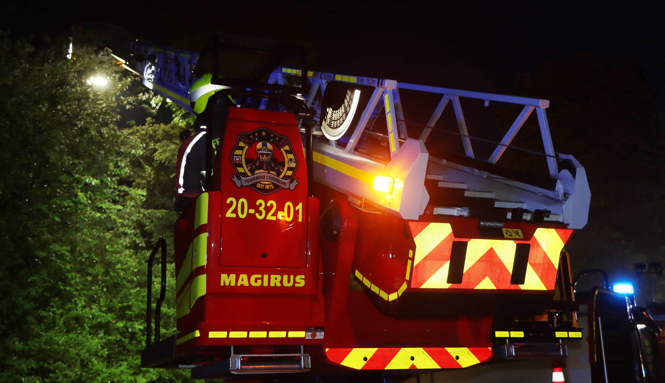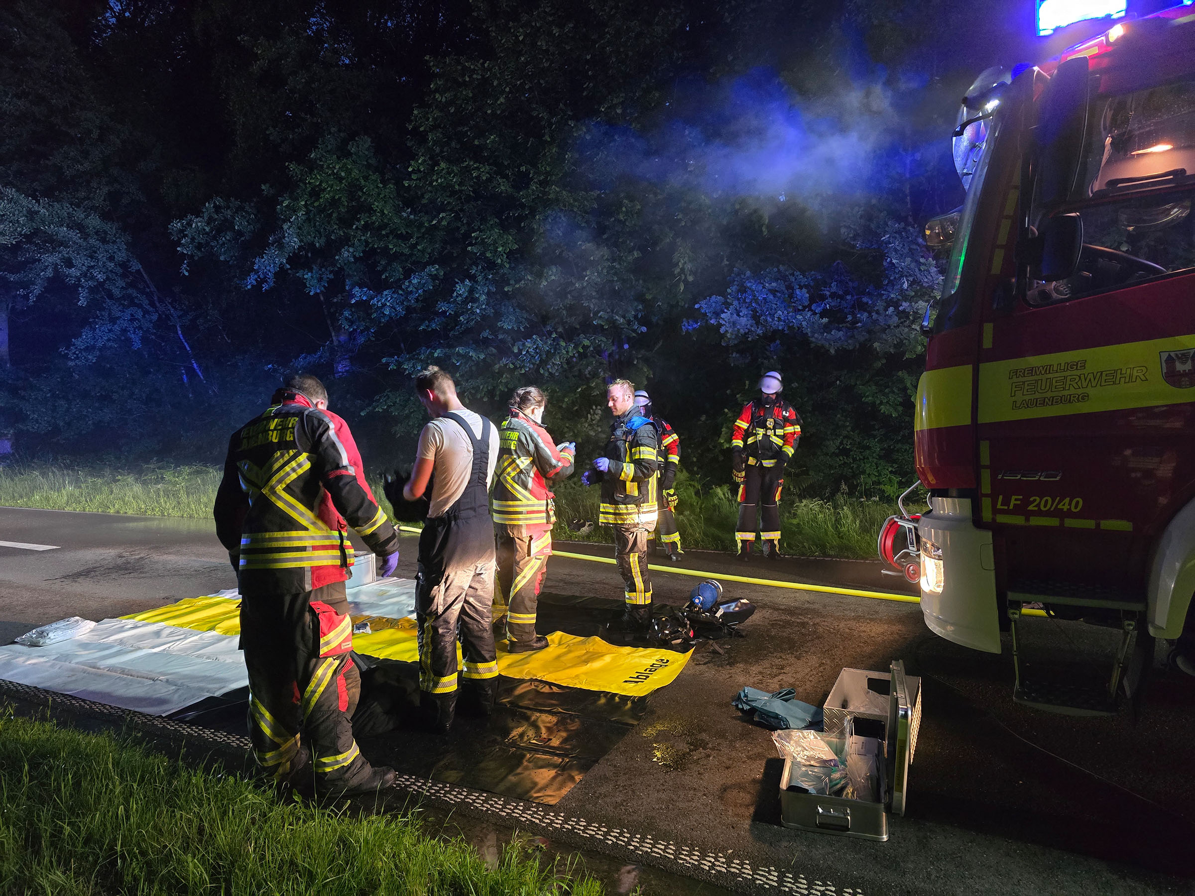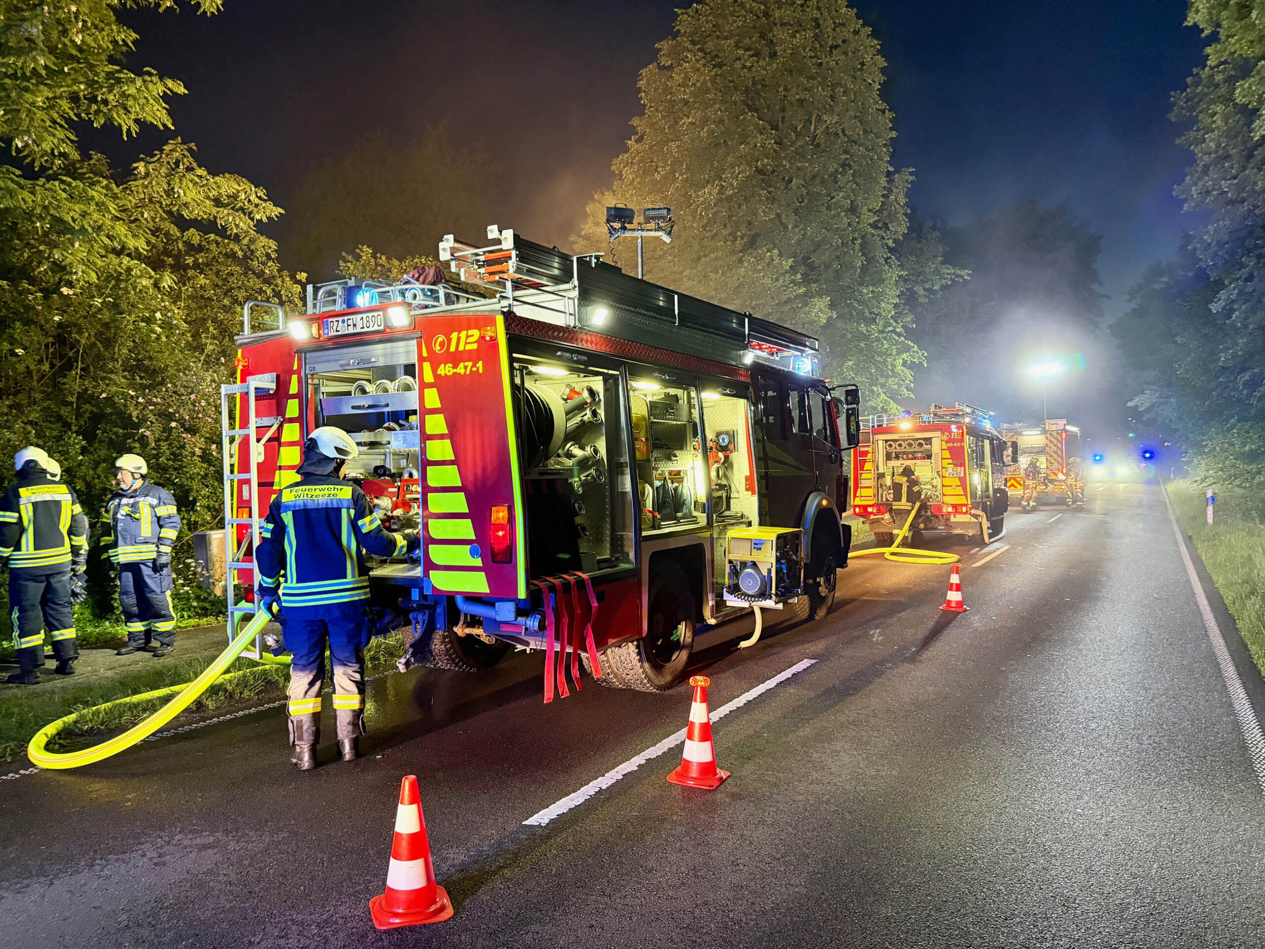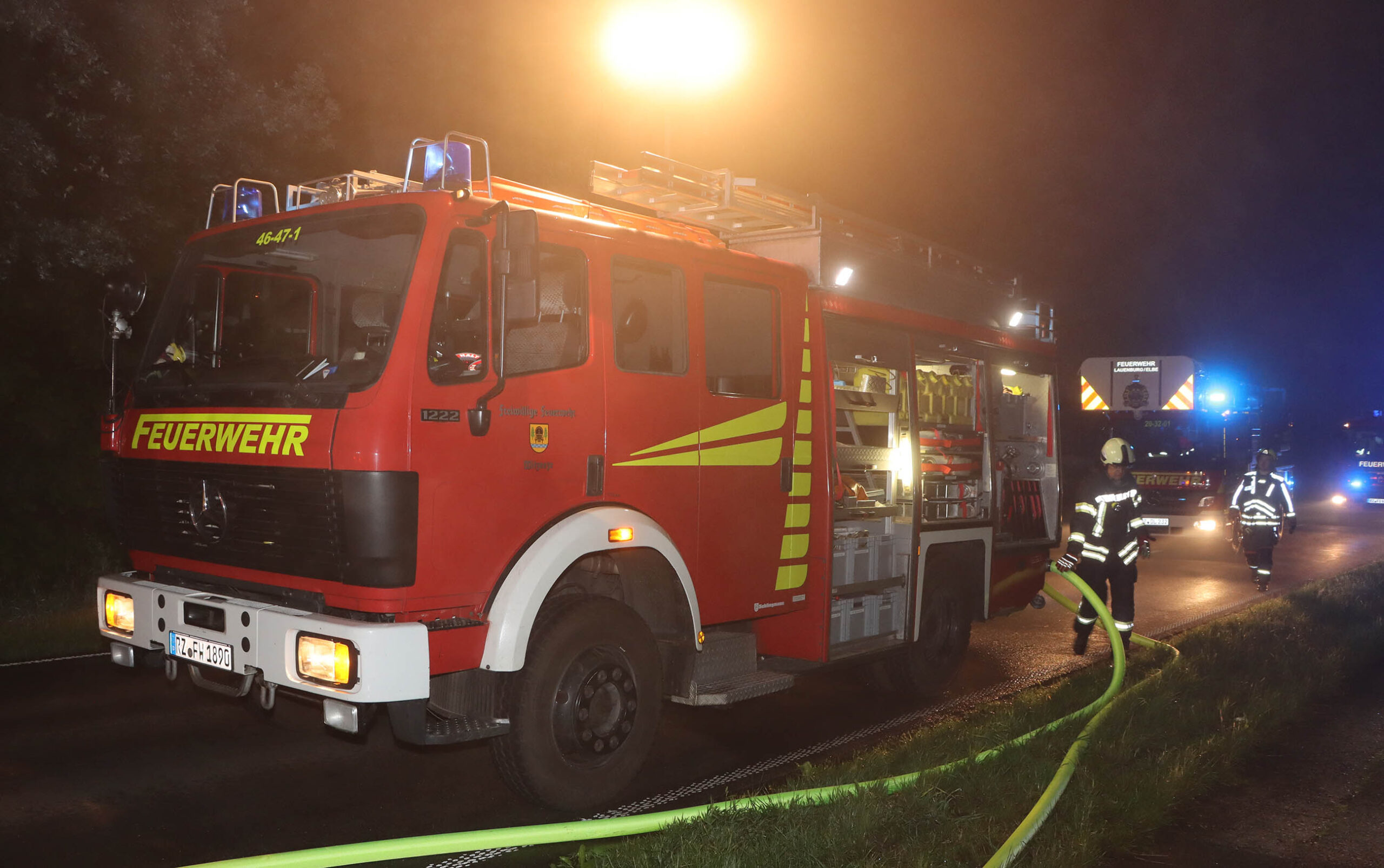 Um bei einem Gebäudebrand zu unterstützen, rückte in der Nacht zu Dienstag die Drehleiter der Lauenburger Feuerwehr aus. Zusätzlich rückten 2 Löschfahrzeuge mit Personal aus, um vor Ort zu unterstützen. Es ging bei dichtem Nebel in die Gemeinde Witzeeze. Kurz vor dem Ortseingang von Büchen brannte an einem leerstehendem Gebäude ein Schuppen. Anwohner hatten das Feuer entdeckt und daraufhin den Notruf gewählt. Beim Eintreffen der Lauenburger Wehr hatten die Kräfte aus Schulendorf und Witzeeze bereits mit der Brandbekämpfung begonnen. Der Einsatz der Drehleiter war aufgrund der Örtlichkeit nicht möglich, jedoch unterstützten wir die Löscharbeiten mit mehreren Atemschutztrupps. – Anschließend übernahm die Besatzung des LF 10 die Entkleidung der aller Atemschutzgeräterträger auf einer vorbereiteten Schwarz-Weiß Ablage. Nach über 2 Stunden war der Einsatz beendet und dir Kräfte rückten zum aufklaren wieder ein.