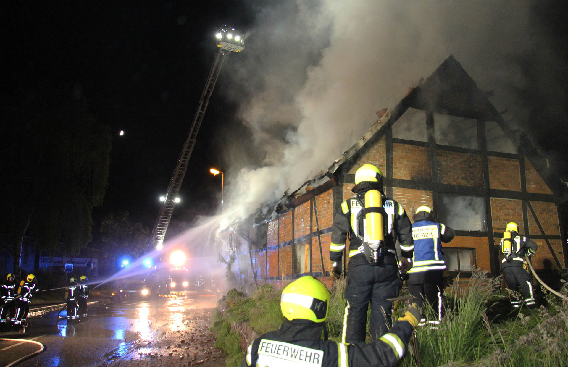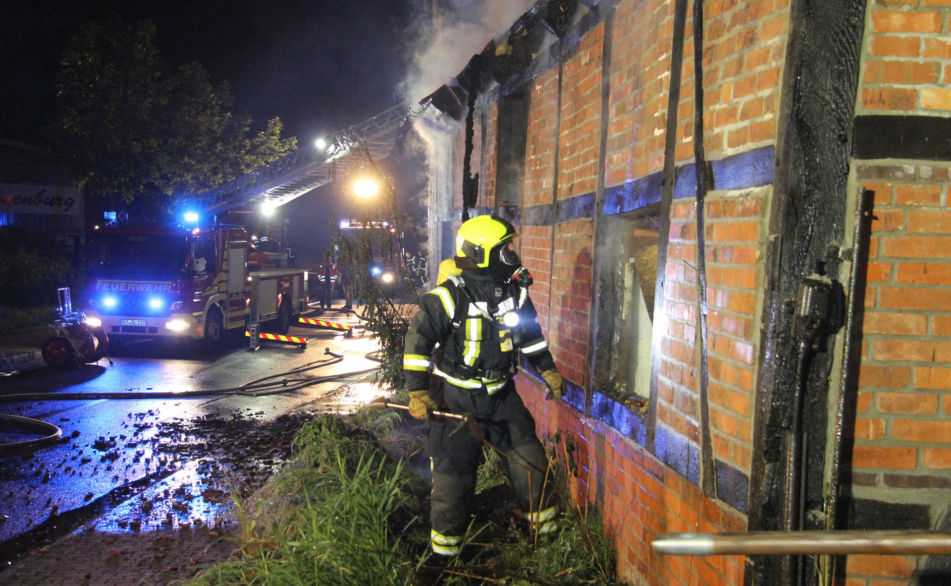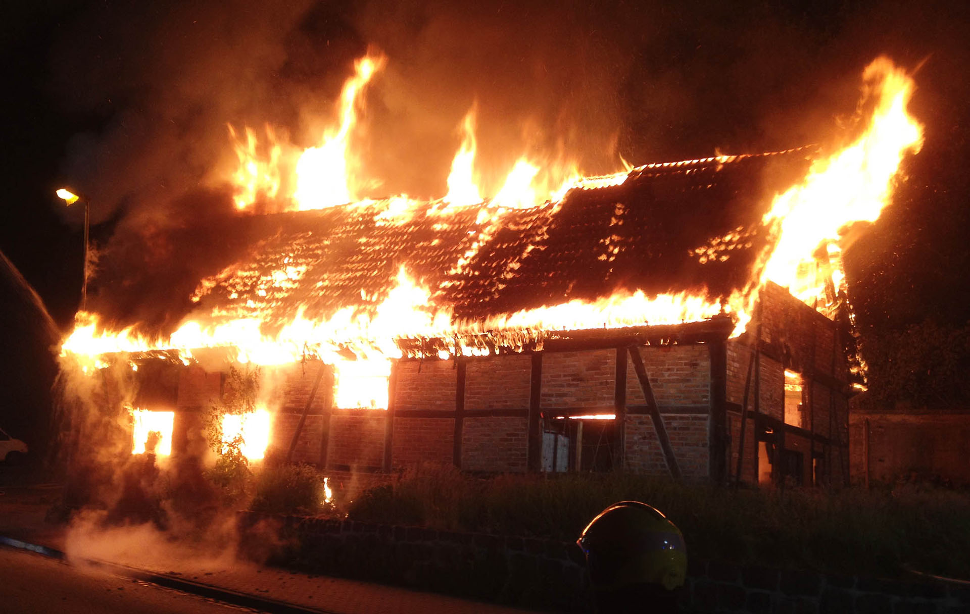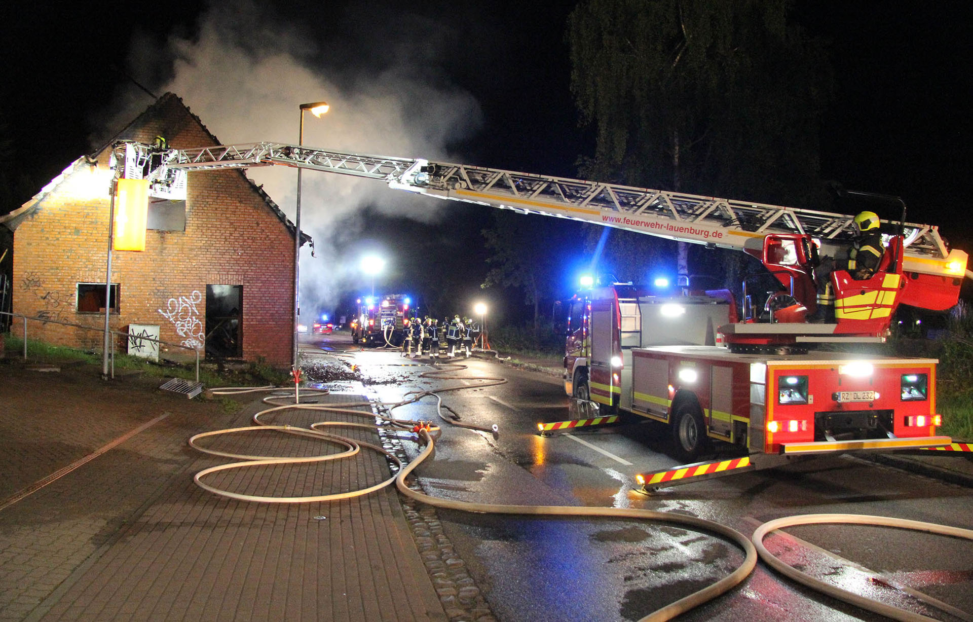 Unter dem Stichwort „Feuer Groß – Gebäude im Vollbrand“ wurden die Lauenburger Kräfte in der Nacht in die Hafenstraße alarmiert. Ein Fachwerkhaus, dass als Lagermöglichkeit genutzt wurde stand beim Eintreffen der Feuerwehr vollständig in Flammen. Meterhoch schlugen Flammen aus dem bereits teilweise eingestürzten Dachstuhl empor. Enormer Funkenflug und große Hitzestrahlung bedrohte benachbarte Gebäude. Nur massiver Wassereinsatz konnte hier noch Erfolg bringen. Über mehrere C-Rohre sowie den Wasserwerfer wurden die Flammen schnell gelöscht, an anliegender Handwerkerbetrieb wurde durch eine Riegelstellung geschützt. Auch ein Übergreifen auf den angrenzenden Hangbewuchs konnte vermieden werden. Noch während der Löscharbeiten nahm die Polizei die Ermittlungen auf. Noch mehrere Stunden war die Feuerwehr mit den Nachlöscharbeiten beschäftigt, mit der Wärmebildkamera wurde von außen nach Glutnestern gesucht, da ein Betreten der Ruine eine zu große Gefahr darstellte.