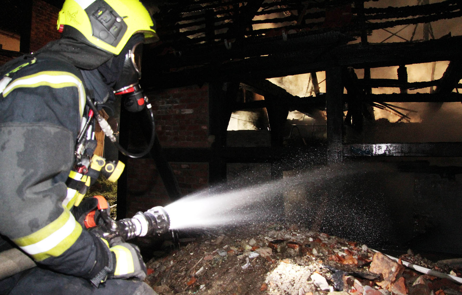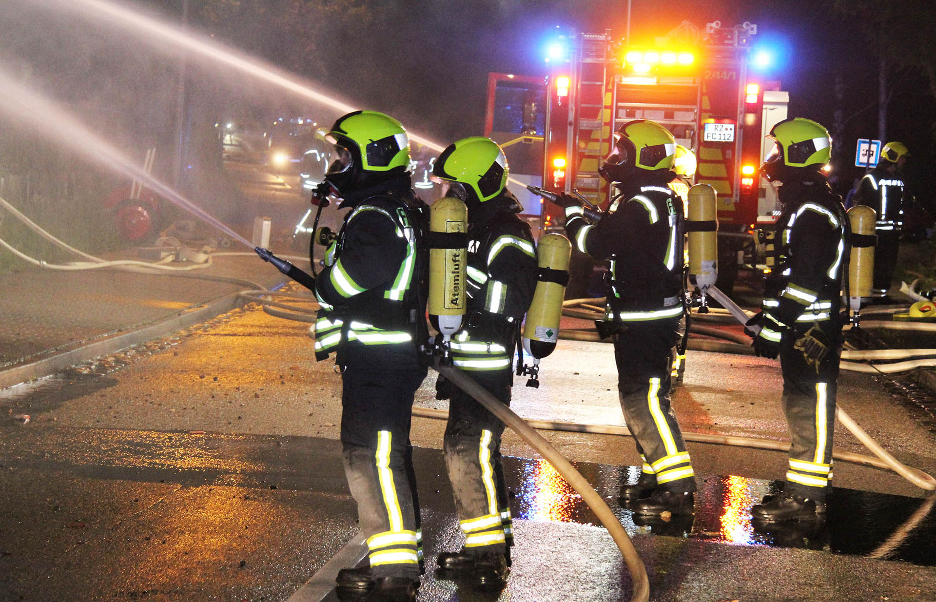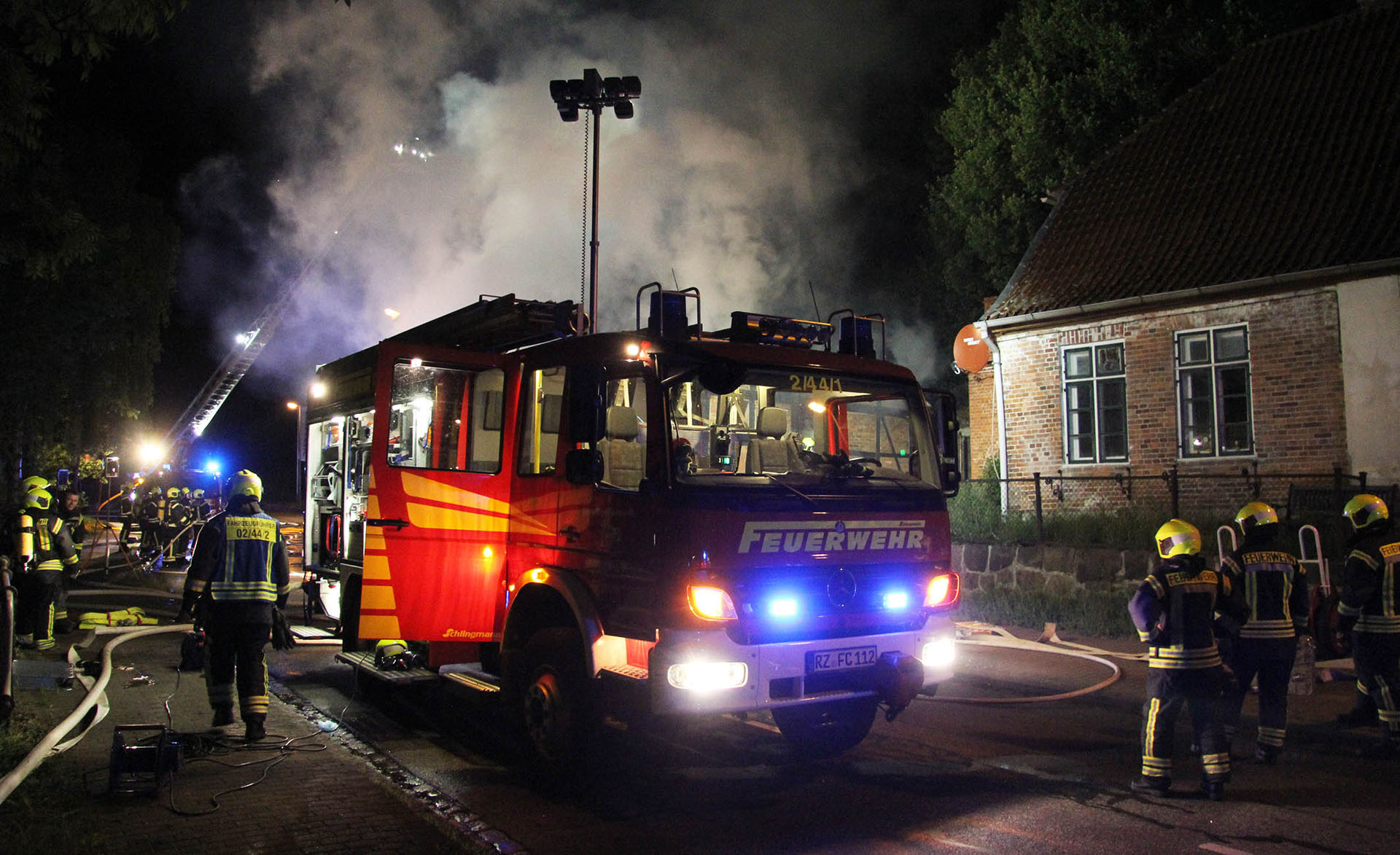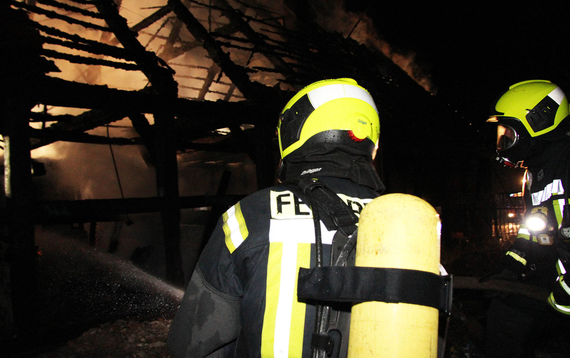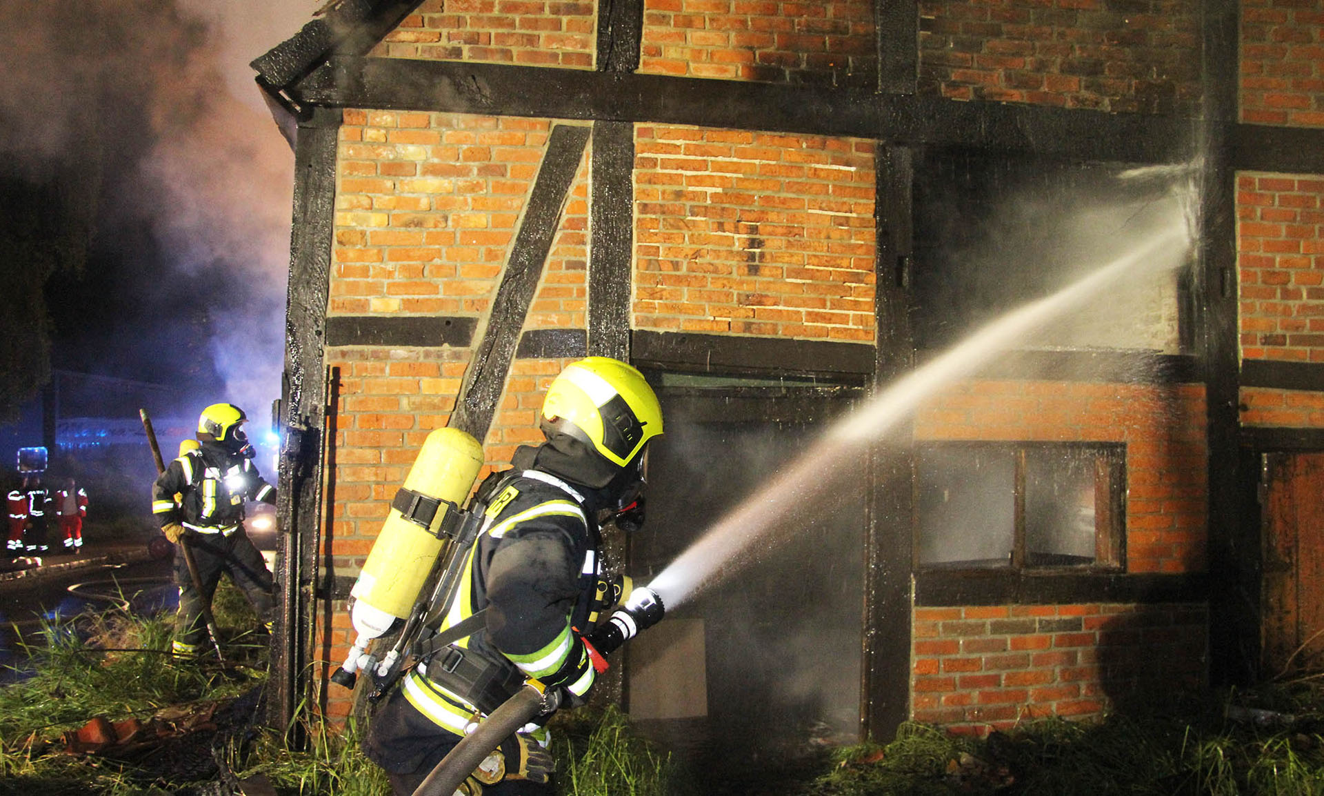 Unter dem Stichwort „Feuer Groß – Gebäude im Vollbrand“ wurden die Lauenburger Kräfte in der Nacht in die Hafenstraße alarmiert. Ein Fachwerkhaus, dass als Lagermöglichkeit genutzt wurde stand beim Eintreffen der Feuerwehr vollständig in Flammen. Meterhoch schlugen Flammen aus dem bereits teilweise eingestürzten Dachstuhl empor. Enormer Funkenflug und große Hitzestrahlung bedrohte benachbarte Gebäude. Nur massiver Wassereinsatz konnte hier noch Erfolg bringen. Über mehrere C-Rohre sowie den Wasserwerfer wurden die Flammen schnell gelöscht, an anliegender Handwerkerbetrieb wurde durch eine Riegelstellung geschützt. Auch ein Übergreifen auf den angrenzenden Hangbewuchs konnte vermieden werden. Noch während der Löscharbeiten nahm die Polizei die Ermittlungen auf. Noch mehrere Stunden war die Feuerwehr mit den Nachlöscharbeiten beschäftigt, mit der Wärmebildkamera wurde von außen nach Glutnestern gesucht, da ein Betreten der Ruine eine zu große Gefahr darstellte.