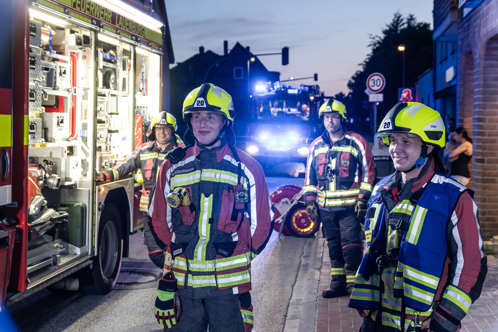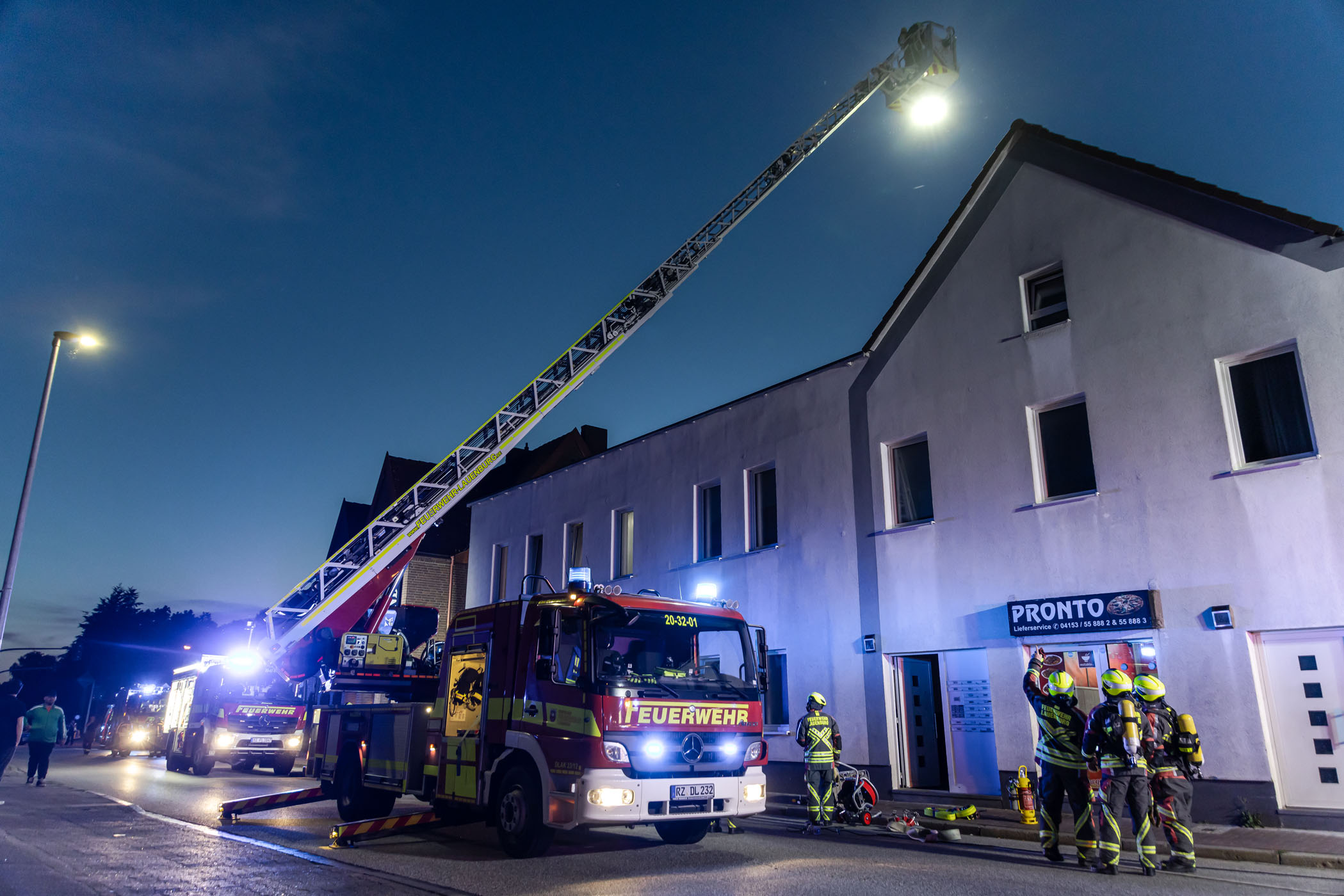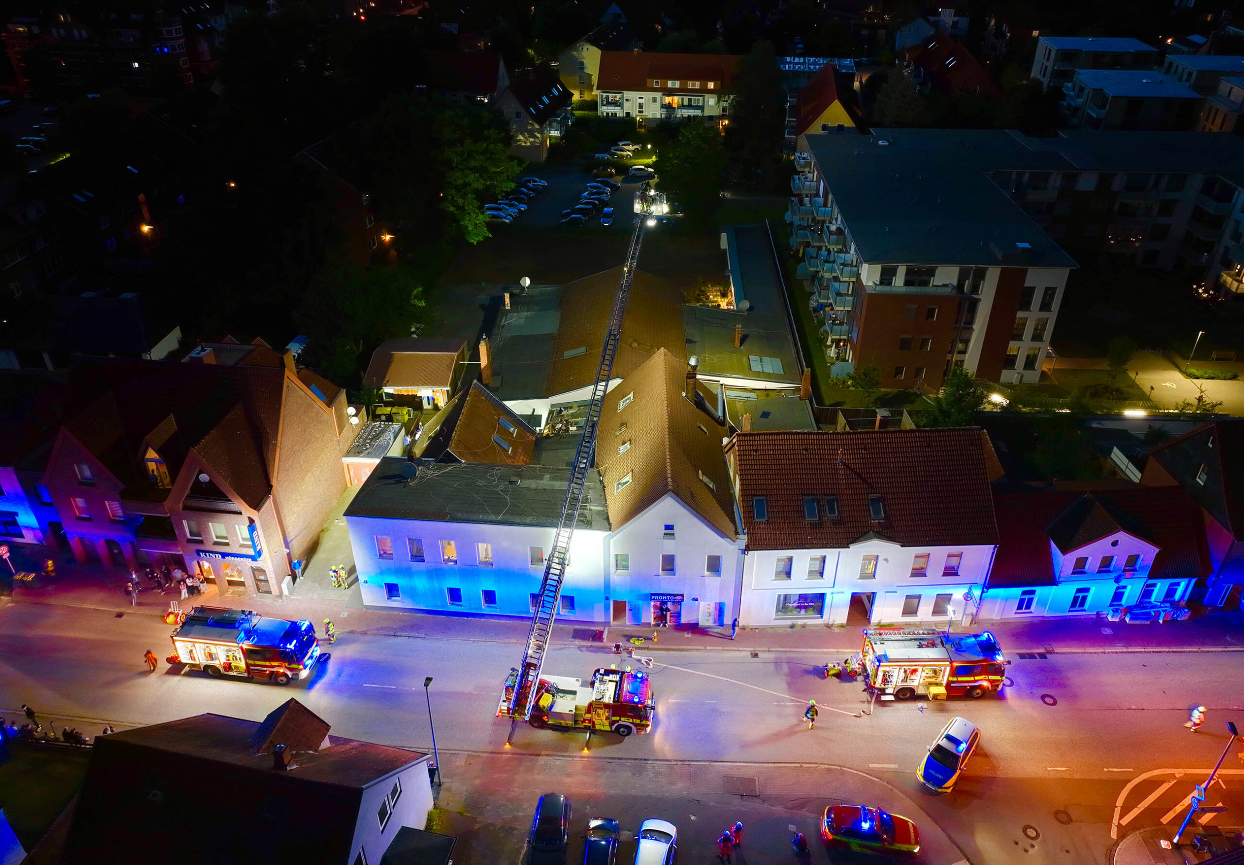 Am Mittwochabend wurde die Feuerwehr unter dem Stichwort „Dachstuhlbrand“ in die Hamburger Straße alarmiert. Anwohner bemerkten Rauch im Gebäude und Brandgeruch. Schnell waren die ersten Kräfte vor Ort. Der Einsatzleiter ging zur Erkundung vor. Schnell bestätigte sich die Lage. Die Anwohner hatten ihre Wohnungen bereits verlassen. Im Inneren des Gebäudes ging der Angriffstrupp weiter vor. Die Ursache für die leichte Verrauchung war in dem weitläufigen Gebäude zunächst nur schwer auszumachen. Schließlich konnte sie auf Dacharbeiten die bis in den Abend andauerten zurückgeführt werden. Feuer gab es glücklicherweise keines. Die Bereiche wurden mittels Wärmebildkamera kontrolliert, teile der Decke wurden dafür geöffnet.