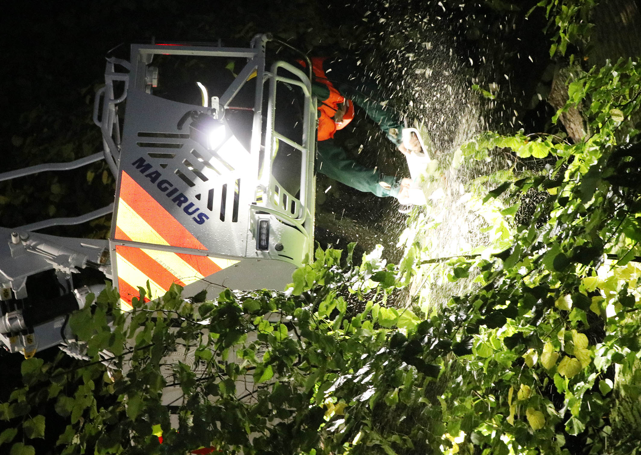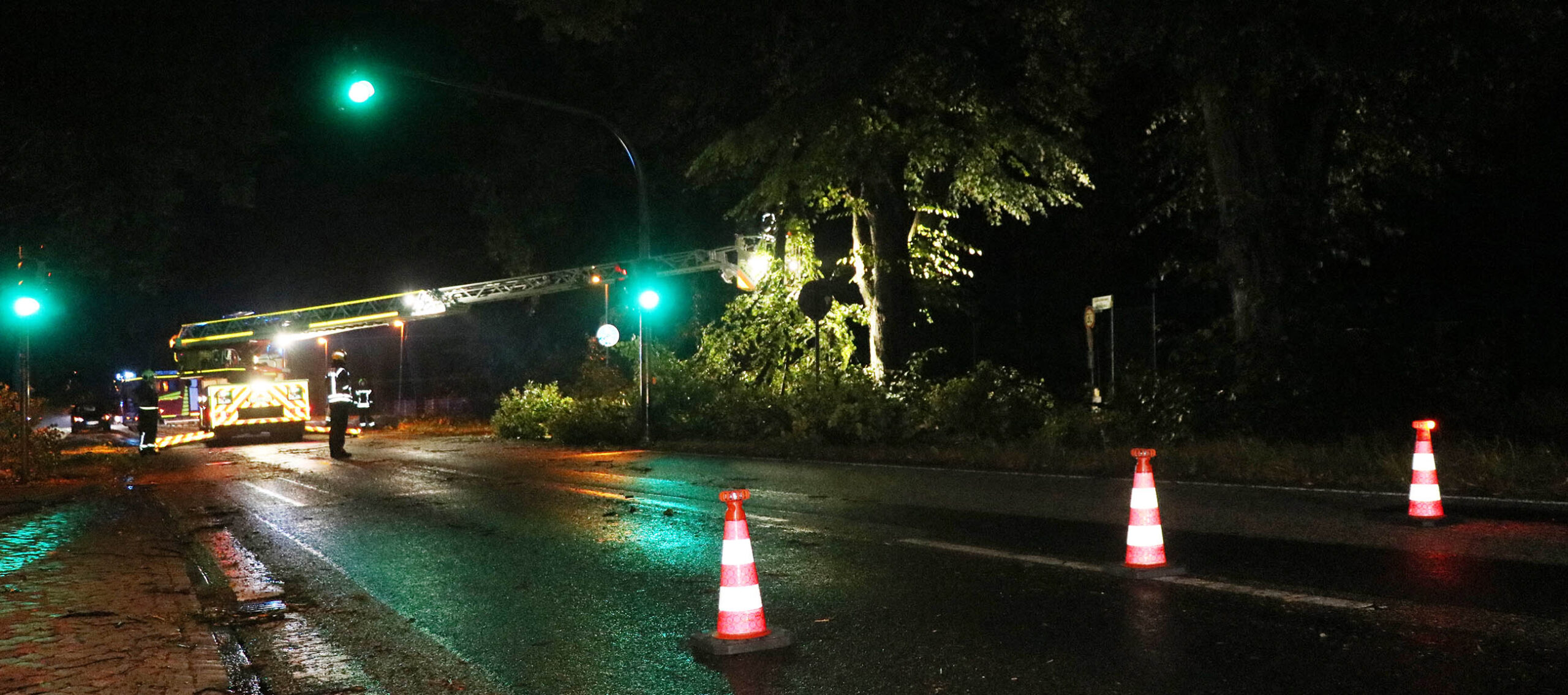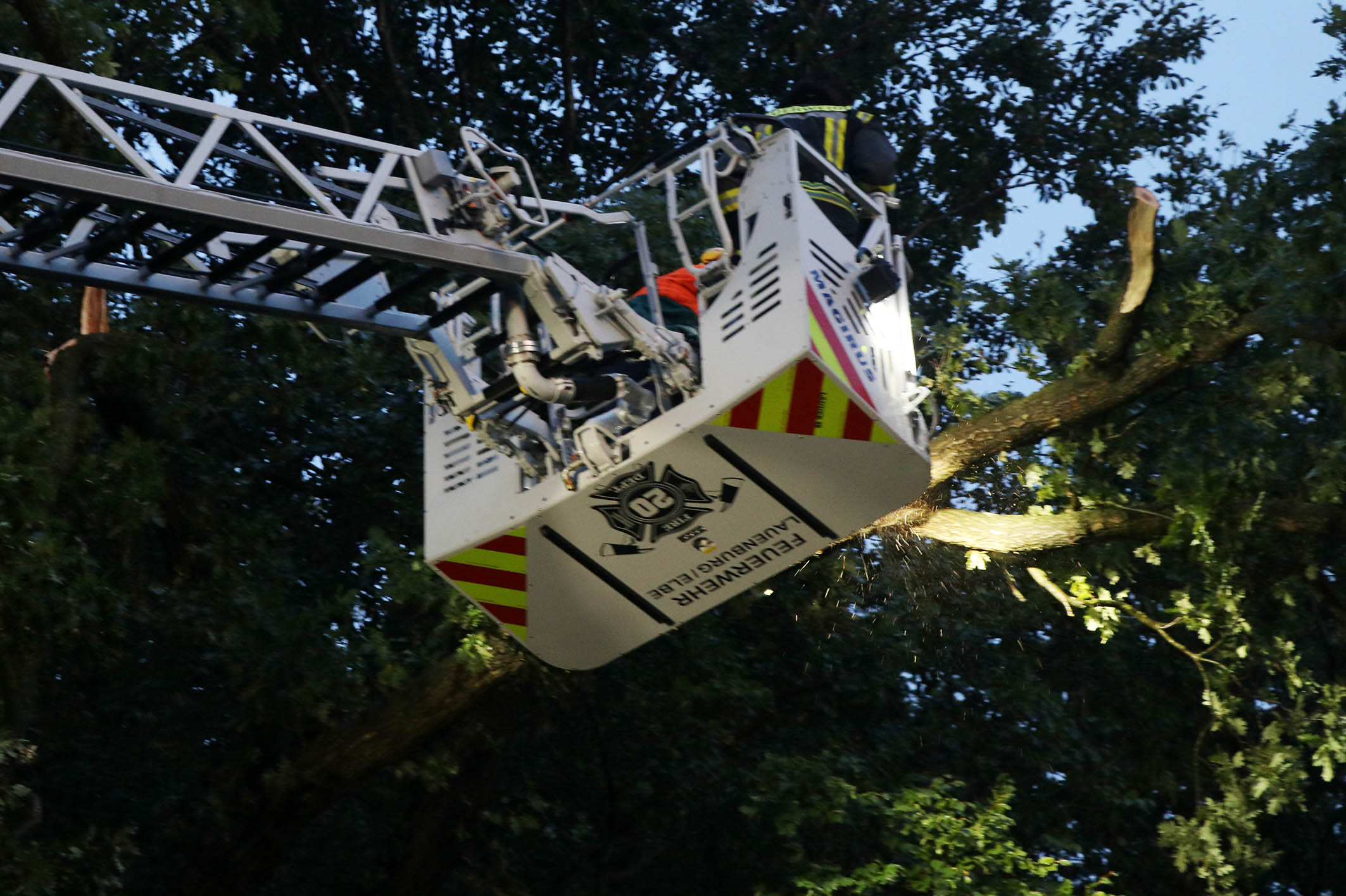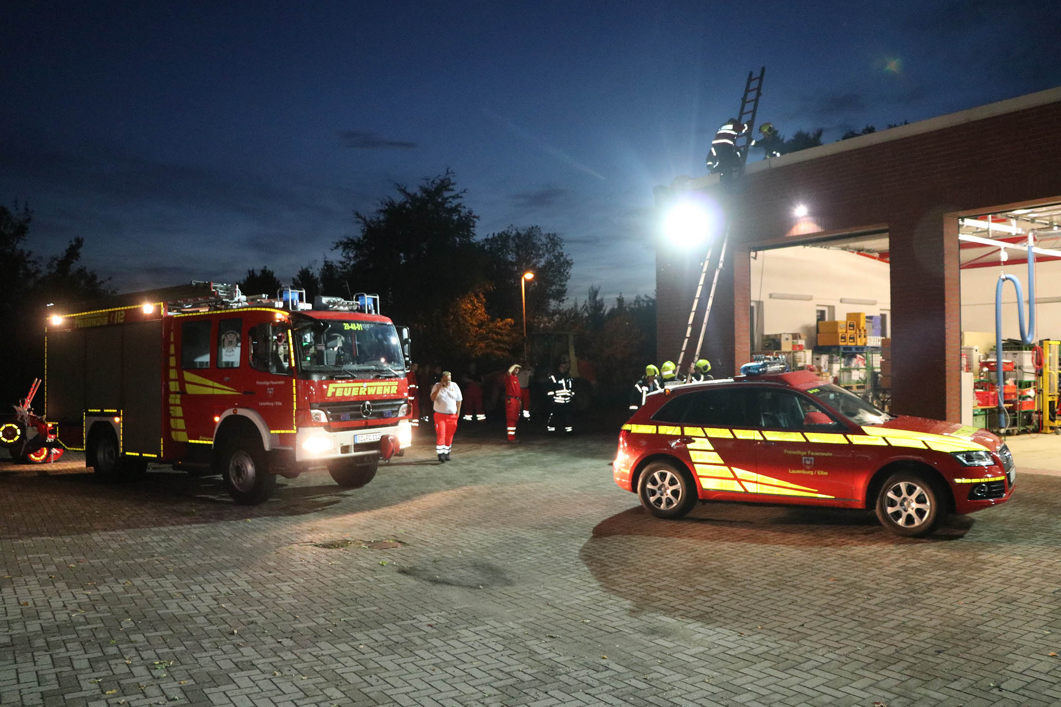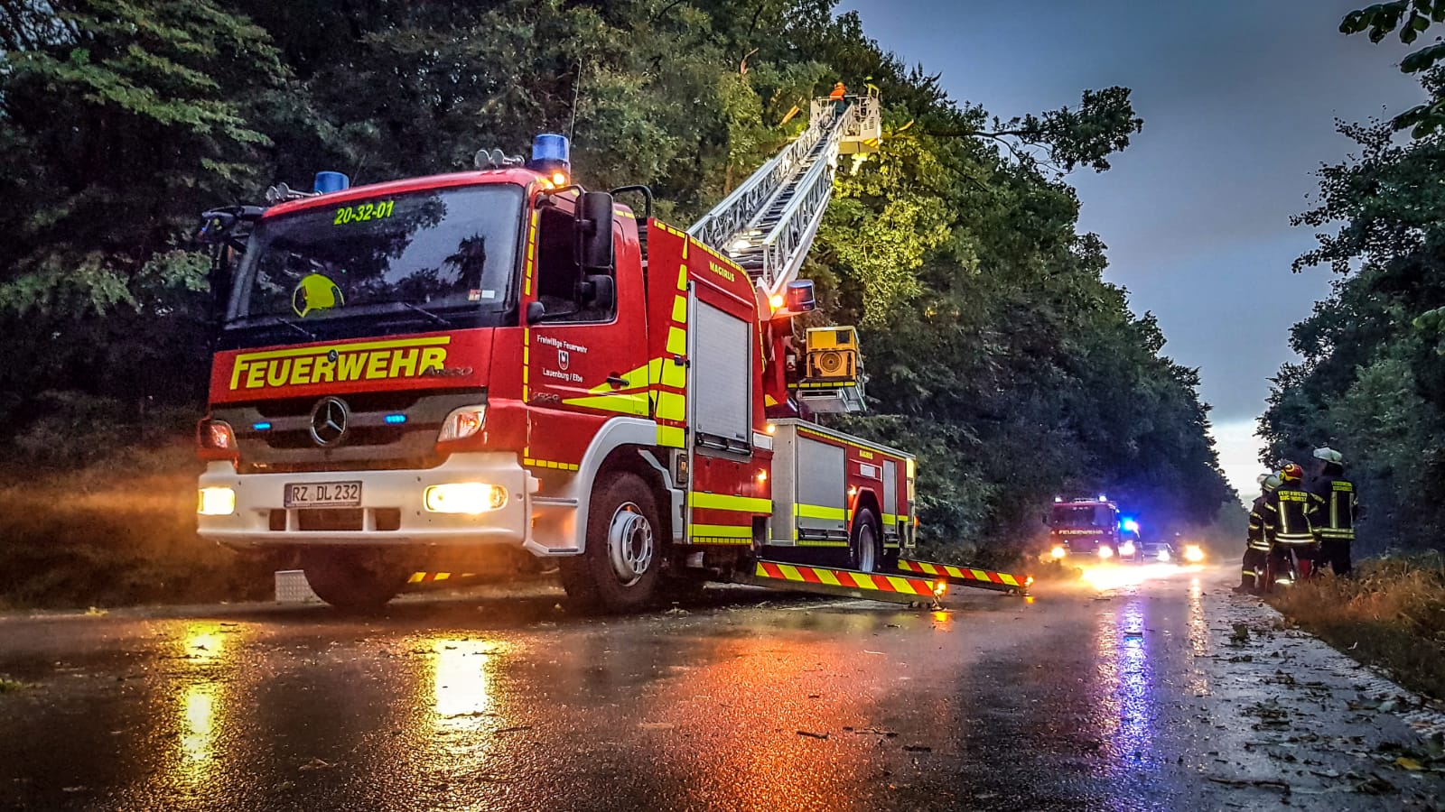Ein extrem heftiges Unwetter zog am Donnerstagabend über Lauenburg. Eine massive Wolkenfront schob sich von Niedersachsen kommend über die Elbe. Schlagartig ging es los, Platzregen, Orkanböen und Blitze. Die Sichtweite minimierte sich auf wenige Meter und Bäume neigten sich stark. – Nur Minuten später gingen die Melder der Lauenburger Feuerwehr. In der Feuerwehr- und Rettungsleistelle in Bad Oldesloe gingen Notrufe im Sekundentakt ein. Das Sturmtief hinterließ eine Spur der Verwüstung. Straßen waren bedeckt mit laubtragenden Ästen und Zweigen. An der Feuerwache an der Reeperbahn priorisierte Wehrführer Lars Heuer die Einsätze. „Dabei schauen wir natürlich ob es Einsätze mit Menschenleben in Gefahr gibt, anschließend stufen wir die Einsätze nach Dringlichkeit ein“ erklärt der Einsatzleiter. – Zunächst schickte er das HLF in die Hafenstraße, auf der wichtigen Bundesstraße in Richtung Niedersachsen lagen gleich mehrere massive Äste auf der Fahrbahn und versperrten die Durchfahrt. Die Mannschaft räumte die Fahrbahn, während von der Feuerwache die übrigen Fahrzeuge zu verschiedensten Einsatzstellen ausrückten. Ein massiver Baum zerstörte einen geparkten PKW im Mühlenberg nahezu vollständig. Er schlug mit voller Wucht zu und versperrte nebenbei auch die Durchfahrt. An anderer Stelle war die Besatzung der Drehleiter damit beschäftigt, einen Hast aus dem Zeltdach des Rewe-Marktes zu bergen. Aufgrund der zahlreichen Einsätze für die Drehleiter, forderte Wehrführer Heuer im Verlauf Verstärkung an. Die Geesthachter machten sich mit ihrer Leiter auf den Weg, die Elbe Stadt wurde vom Unwetter vollständig verschont. In der Lütauer Chaussee unterstützten sie das THW beim Abtragen eines massiven Allee Baumes. Später rückte auch die Drehleiter der Partnerwerhr Boizenburg zusammen mit einem HLF an. Sie unterstützten die Feuerwehr in der Gemeinde Schnakenbek. Ein Ast hatte dort das Dach eines Einfamilienhauses stark beschädigt. Die Buchhorster Feuerwehr arbeitete ebenfalls mehrere Einsätze im Stadtgebiet ab, nachdem sie in ihrem Gemeindegebiet mehrere Gefahrenstellen beseitigten. Bis in den frühen Morgen waren die Einsatzkräfte im Einsatz. Zu insgesamt 38 Einsätzen rückten sie aus. Darunter auch eine Erstversorgung für den Rettungsdienst, der KdoW fuhr besetzt mit zwei Rettungsassistenten und einem Notfallsanitäter zu einem medizinischen Notfall, übernahm die Erstversorgung und übergab den Patienten schließlich an den Geesthachter Rettungswagen. Wir danken allen Feuerwehren, dem THW und allen weiteren Einheiten, die uns bei der heutigen Einsatzlage so tatkräftig unterstützt haben. Fotos: Timo Jann – Lauenburgische Landeszeitung, Feuerwehr Buchhorst