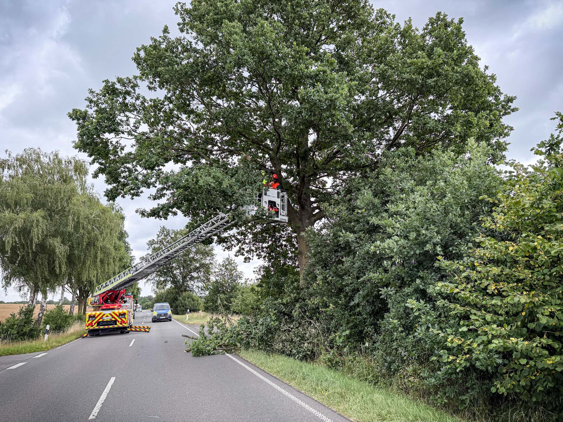 Die Feuerwehr Witzeeze forderte an diesem Tag die Drehleiter aus Lauenburg an. An der L200 waren mehrere größere Äste einer Baumkrone gebrochen und drohten auf die Fahrbahn zu fallen. Zusammen mit einem Sägeführer der Feuerwehr Witzeeze wurden dann Stück für Stück die Äste abgesägt, sodass nach ca. einer halben Stunde die Fahrbahn wieder normal und gefahrlos befahren werden konnte.