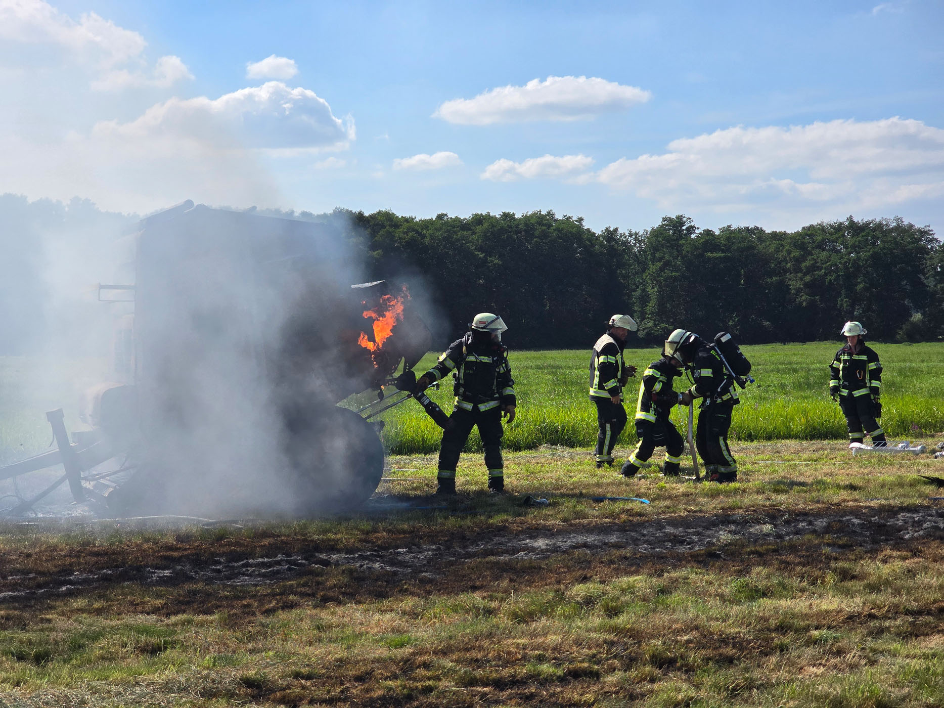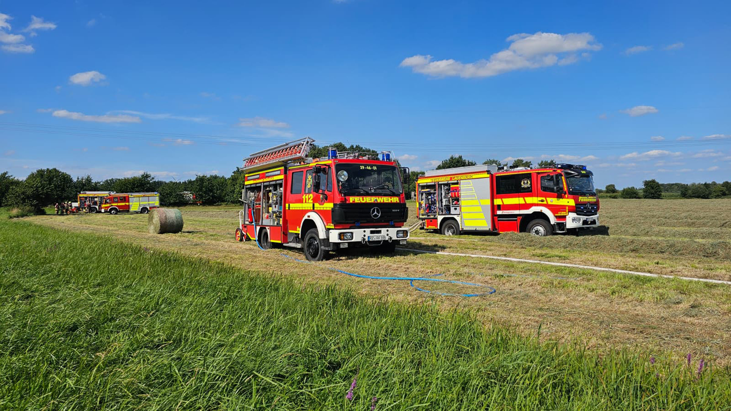 Zur Unterstützung der Feuerwehr Buchhorst rückte am Nachmittag die Lauenburger Feuerwehr aus. In der Nachbargemeinde Buchhorst war eine Rundballenpresse in Brand geraten. Beim Eintreffen der Lauenburger Wehr hatten die Buchhorster bereits die Brandbekämpfung an der Ballenpresse eingeleitet. Der Besatzung des LF 20 wurde der sich ausbreitende Flächenbrand zugewiesen. Mit Dunghacken wurde der Heuschwad auseinander gezogen um die Ausbreitung, in dem wie eine Lunte brennenden Heuschwad, zu stoppen. Gleichzeitig wurde ein Löschangriff mit einer D-Leitung vom LF20 aufgebaut. Um genügend Löschwasser für die Brandbekämpfung der Ballenpresse zur Verfügung zu haben, wurde gleichzeitig das LF16 der Buchhorster Wehr mit Wasser gespeist. Schnell brachten die Maßnahmen Erfolg. Schließlich wurden die Lauenburger Kräfte aus dem Einsatz entlassen.