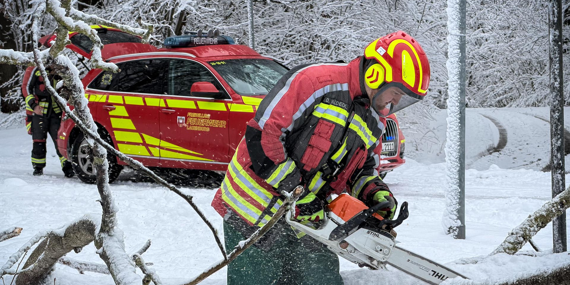 Unter dem Stichwort „Baum auf Straße“ oder „droht zu fallen“ rückte die Feuerwehr Lauenburg an diesem Tag zu einigen Unwettereinsätze aus. Durch die hohe Schneelast