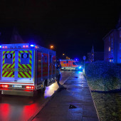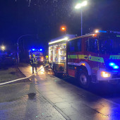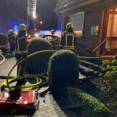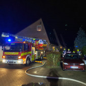 Zu einem Wohnungsbrand rückte die Feuerwehr am Montagabend aus. Unweit der Feuerwache war es in einem Wohnhaus zu einem Brandausbruch gekommen. Auf der sehr kurzen Einsatzfahrt von nur wenigen hundert Metern rüstete sich der Angriffstrupp in Windeseile mit Atemschutz aus, um am Einsatzort sofort einsatzbereit zu sein. Wehrführer und Einsatzleiter Lars Heuer ging sofort nach Ankunft zur Erkundung vor. Flammen waren im Wohnzimmer eines Reihenhauses zu sehen. Sofort gab er dem eintreffenden Löschfahrzeugen die Befehle zur Brandbekämpfung. Binnen kurzer Zeit begann der Angriffstrupp mit den Löscharbeiten. Aus ungeklärter Ursache war ein Weihnachtsbaum in Brand geraten. Mit dem Schlauchpaket ging der Trupp vor, löschte mit wenigen Sprühstößen die Flammen. Anschließend mussten die Wohnräume mit einem Überdruckbelüfter rauchfrei gemacht werden. Dafür wurde der Belüfter vor dem Eingang platziert. Frische Luft wurde in den Innenraum geblasen um Brandgase auszutreiben. Um die Einsatzstelle auszuleuchten, wurde außerdem die Drehleiter in Stellung gebracht. Die Bewohner wurden durch den Rettungsdienst versorgt.