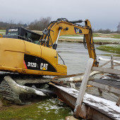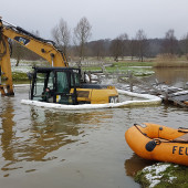 Gemeinsam mit den Feuerwehren aus Brunstorf und Schwarzenbek rückte am Sonntagmittag die Ölwehr der Lauenburger Feuerwehr aus. Die Fachabteilung ist spezialisiert auf die Eingrenzung von Schadensereignissen auf Gewässer. Nahe eines Golfplatzes in der Gemeinde Brunstorf entdeckten Spaziergänger eine Kettenbagger in einem Teich, der gehörte da jedoch ganz sicher nicht hin. Unbekannte steuerten ihn offenbar in der Nacht über den Golfplatz, zerstörten dabei auch eine angelegte Brücke vollständig. Das Ungetüm war bis zum Fahrersitz in dem kleinen Teich gefahren worden, die Spuren waren deutlich zu sehen. Um die auslaufenden Betriebsstoffe einzudämmen rückten die Lauenburger mit Ölsperren an. Mit einem Kleinboot des Schwarzenbeker Rüstwagens konnte eine Sperre um das Fahrzeug gelegt werden, eine weitere vor den Ausfluss des Teiches. Um den Bagger aus dem Teich zu bekommen, rückte die Baufirma an, mit Gummistiefeln und Schlauchboot wurde der richtige Fahrer zu seinem Führerstand gebracht. Dank dem Geschick des Fahrers gelang es ihm das Fahrzeug wieder aus dem Teich zu bergen. Die Polizei nahm die Ermittlungen auf.