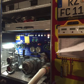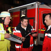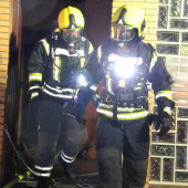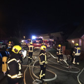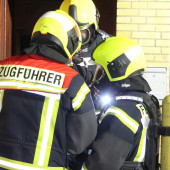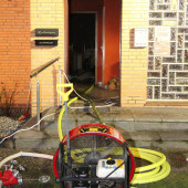 Kurz darauf traf das HLF auch schon ein. Der Angriffstrupp legte umgehend das Schlauchpaket vor der Tür bereit, der Wassertrupp schloss die Schläuche für die Wasserverorgung an. Binnen kürzester Zeit stand der Löschangriff bereit und der Atemschutztrupp konnte ins Gebäude vorgehen. Gleich nach den ersten Metern im Flur waren die ersten Flammen zu sehen, die mitgeführte Wärmebildkamera zeigte da schon um die 600°Grad an. Mit gezielten Sprühstößen aus dem Hohlstrahlrohr wurde die Brandbekämpfung eingeleitet und die Flammen in Küche und Flur relativ schnell gelöscht. Zeitgleich rüstete sich ein weiterer Trupp mit Atemschutz aus und ging über einen zweiten Eingang zur Menschenrettung vor. Nachdem der erste Trupp das Feuer soweit aus hatte, suchte auch dieser im Erd- und Dachgeschoss nach dem Vermissten - Entwarnung! Der zweite Trupp konnte die Person aus dem Keller über einen Nebeneingang retten. Somit konnte dann der Schwerpunkt auf die Nachlöscharbeiten und die Belüftung des Gebäudes gesetzt werden. Da Anfangs nicht ganz klar war, wieviele Einsatzkräfte um diese Zeit verfügbar sind, wurden vorsichtshalber die Feuerwehren aus Schnakenbek und Buchhorst nachalarmiert. Zur Kontrolle wurden einige Bewohner mit dem Rettungswagen ins Krankenhaus gebracht.