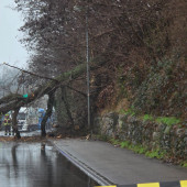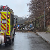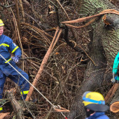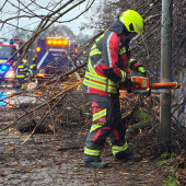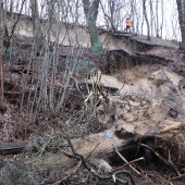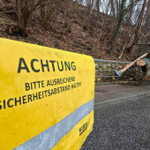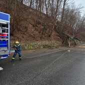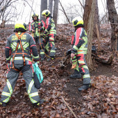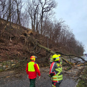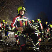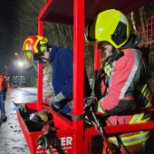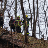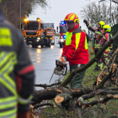 Unter dem Stichwort: Baum auf Straße rückten am Mittwochmorgen Kdow, HLF und Drehleiter in die Lauenburger Hafenstraße aus. Ersten Angaben zufolge war ein größerer Baum vom Hang nahe der Schleuse auf die B209 gestürzt. Vor Ort bestätigte sich die Lage. Ein massiver Baum lag quer über die Fahrbahn, eine Durchfahrt war nicht mehr möglich und der Verkehr staute sich bereits. Augenzeugen berichteten der Feuerwehr: "dass sich der Hang plötzlich in Bewegung gesetzt hatte und mit ihm auch der Baum umstürzte." Bei einer Lageerkundung durch den Stellv. Wehrführer bestätigte sich dies. Auf einer Fläche von rund 30x50m war der Hang abgerutscht. Auf der losgelösten "Scholle" standen zwei weitere große Bäume, welche jederzeit umstürzen konnten. Der Bereich wurde weiträumig abgesperrt. Aufgrund der komplexen Lage und des nicht auszuschließenden weiteren abrutschen des Steilhangs wurde ein Fachberater vom THW sowie Verantwortliche der Stadt Lauenburg hinzugezogen. Die Lage wurde laufend neu beurteilt. Der große Wurzelteller des bereits umgestürzten Baumes stabilisierte die darüberliegende Scholle. Sollte der Baum nun also geräumt werden, drohte ein weiteres Abrutschen des Hanges samt Umstürzen der darauf stehenden Bäume. Eine große Gefahr für alle Einsatzkräfte. Nach einer Lagebesprechung wurden weitere Maßnahmen eingeleitet, loses Material wurde bereits von der Straße entfernt, um die Stolpergefahr zu minimieren. Die Seilwinde des Lauenburger HLF wurde angeschlagen. Nun sollte kontrolliert versucht werden, den umgestürzten Baum den Hang hinunterzuziehen. Doch dies gelang nicht. Zur Unterstützung rückte nun das THW Lauenburg an. Mit 2 Seilwinden gelang es nun den mehrere Tonnen schweren Koloss in Bewegung zu setzen. Baumstumpen am Hang stoppten den Wurzelteller jedoch erneut. Wieder wurde die Lage neu beurteilt. Neue Möglichkeiten in Erwägung gezogen. Die noch immer auf der Erdscholle stehenden Bäume stellten weiterhin eine große Gefahr da. Oberhalb der Abbruchstelle machten sich Mitglieder der Feuerwehr, ausgerüstet mit einer Absturzsicherung fertig für den Einsatz. Sie sollten das Drahtseil einer hinzugezogenen Forstwinde anschlagen um den Baum kontrolliert umzustürzen. Doch die Abbruchkannte war so steil, dass es keine Möglichkeit gab, fußläufig auf die Erdscholle zu gelangen. Schließlich wurde ein Tele Kran samt Arbeitskorb zur Einsatzstelle beordert. Das THW Mölln rückte an, um die Einsatzstelle auszuleuchten. Der nun schon seit 5 Stunden andauernde Einsatz zog sich weiter. Ein Ende war noch nicht abzusehen. Mit Hilfe des Arbeitskorb wurde das Drahtseil schließlich in luftiger Höhe an einem der Bäume befestigt. Schließlich musste der Kran wieder abgerüstet werden, um ihn aus dem Gefahrenbereich zu fahren. Anschließend zog die Winde an und brachte den ersten Baum zu Fall. Anschließend wurde der Kran erneut in Stellung gebracht, um auch am 2. Baum das Drahtseil zu befestigen. Schließlich lag auch dieser Baum. Der abgerutschte Hang war noch immer eine große Gefahr, jedoch bis dahin in seiner Position geblieben. Mittlerweile war es dunkel geworden. Arbeiten am Hang waren in der Dunkelheit zu gefährlich. Die Straße wurde durch den Bauhof für Fahrzeuge und Fußgänger voll gesperrt. Am nächsten Morgen sollen die Arbeiten zur Sicherung des Hanges fortgesetzt werden. Fotos: Feuerwehr Lauenburg & Timo Jann